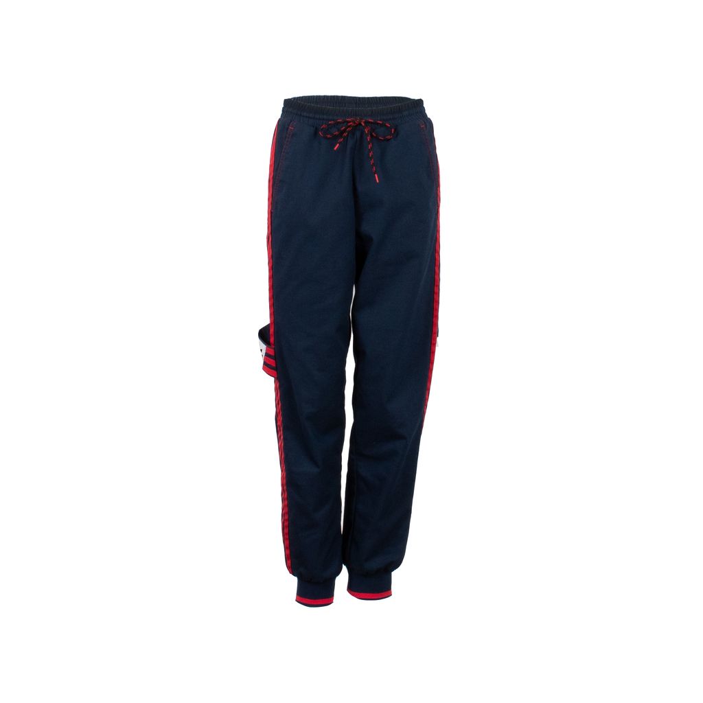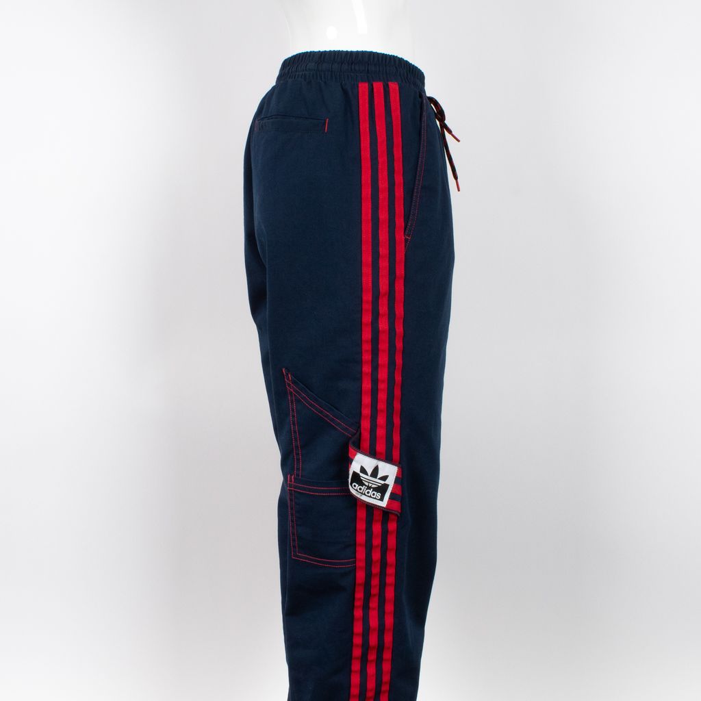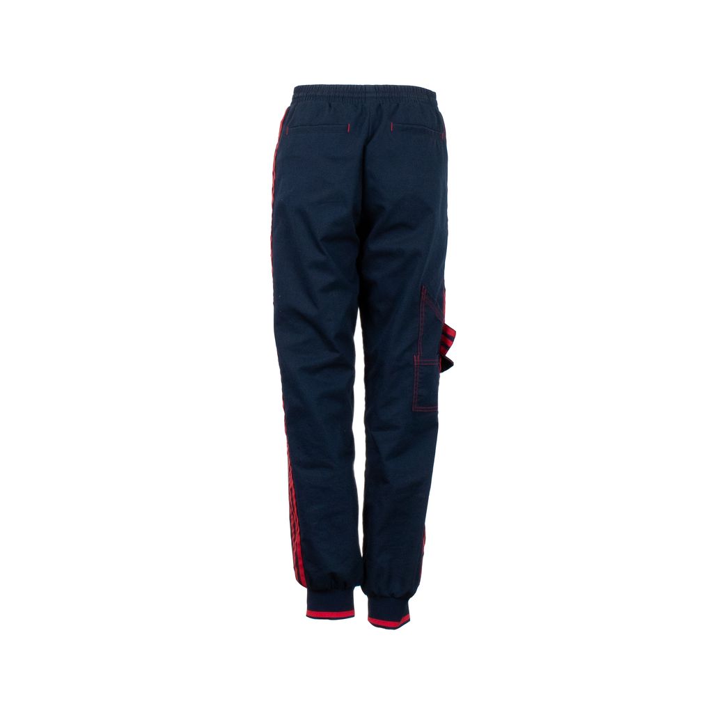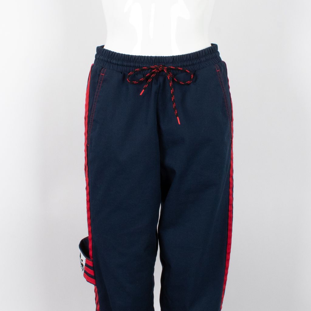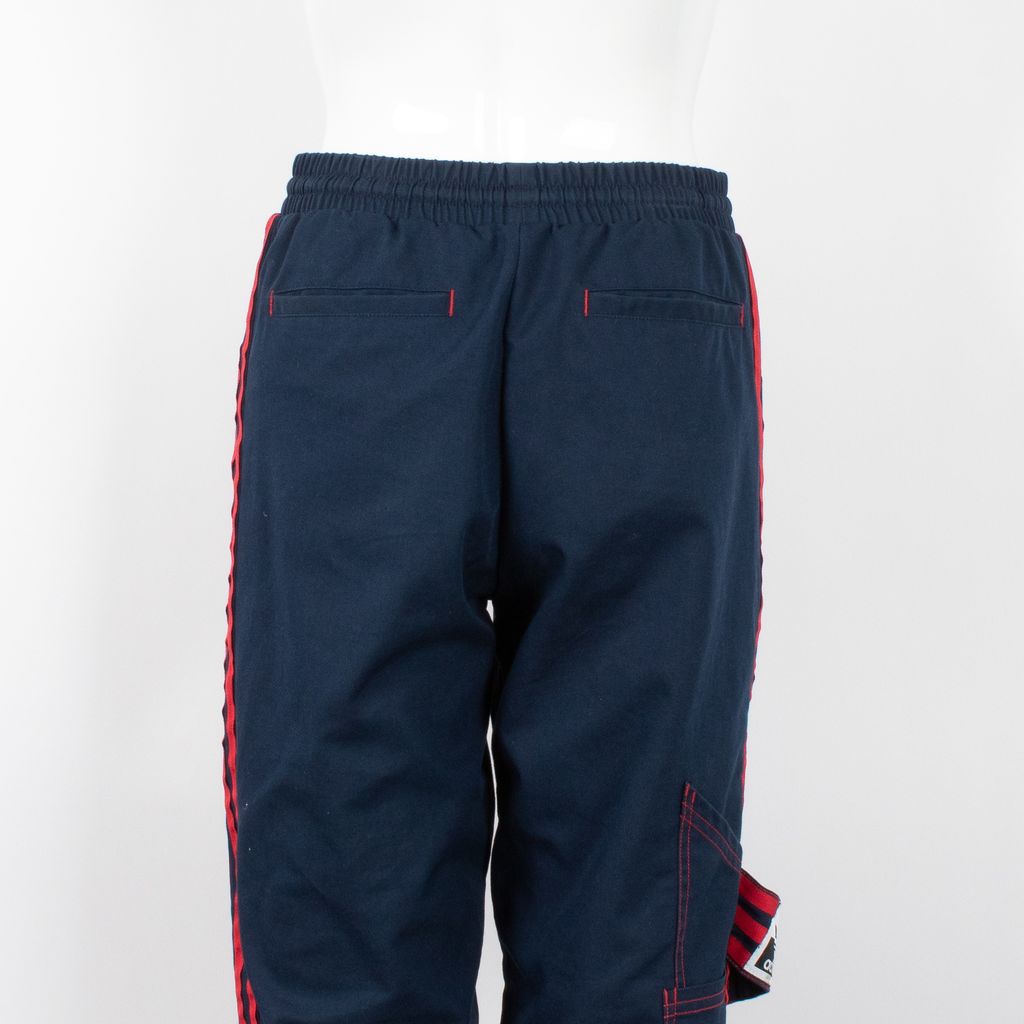 Done in collaboration with Adidas, this piece is designed by Olivia OBlanc to be gender fluid and sustainable. Features contrast colored triple stripes on sides, elastic waist with cord tie, carpenter pant detailing at sides with Adidas logo patch, welted back pockets, rib knit bands at ankles with contrast stripe, and contrast stitch trimmed front pockets.