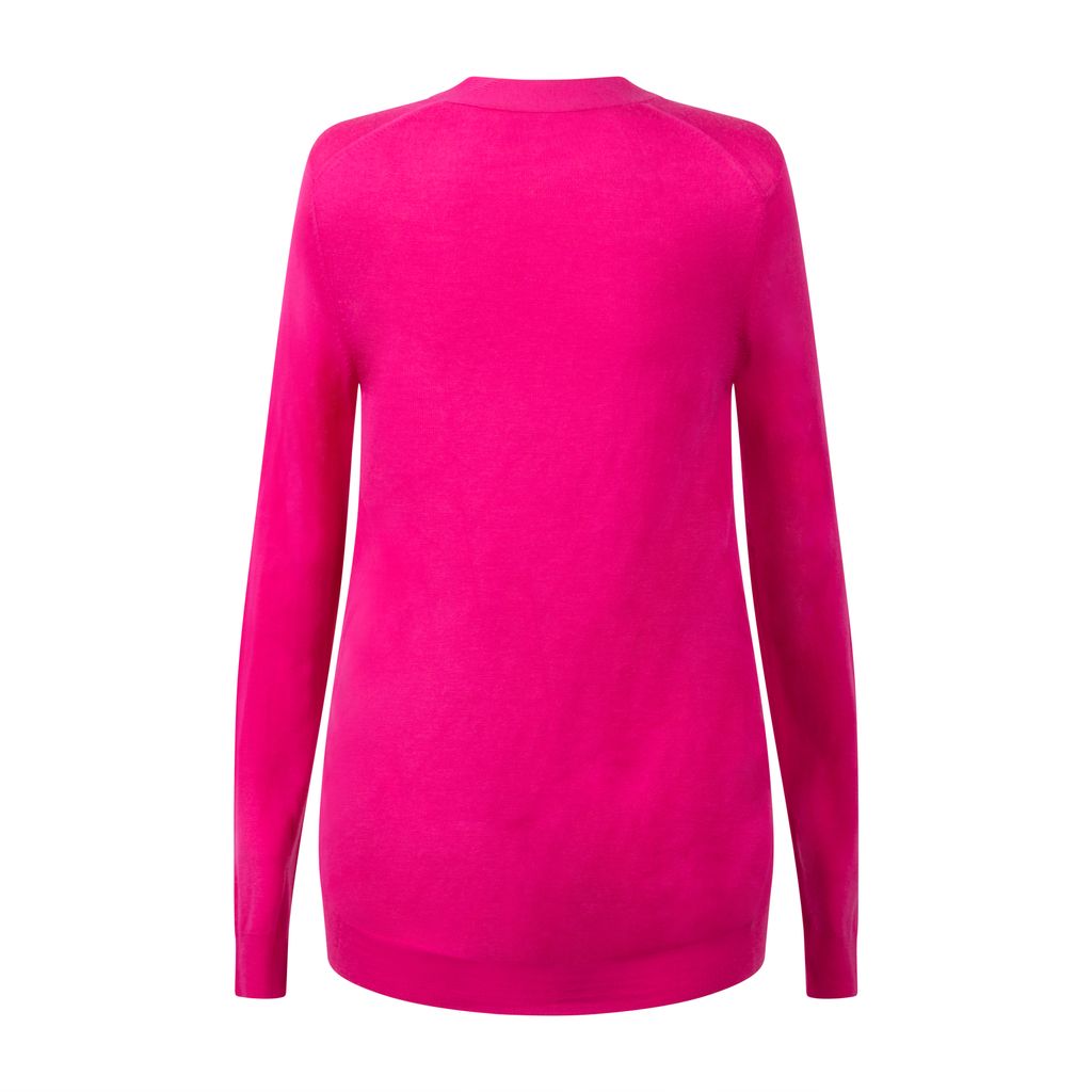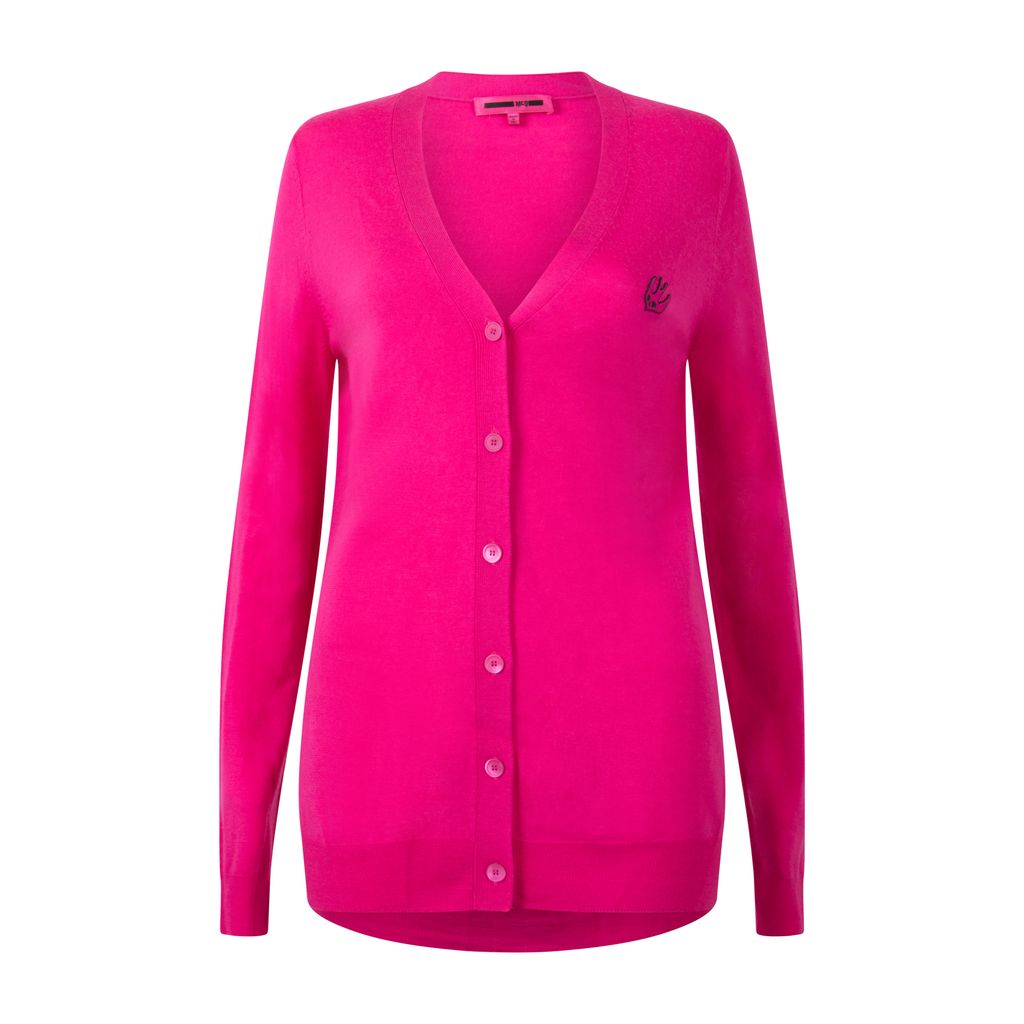 This electric pink cardigan from Alexander McQueen features a plunging V-neckline, button-down front closure, embroidered graphic patch at the front chest, long sleeves with ribbed cuffs, and has a slim long line silhouette. Like new, in excellent condition.