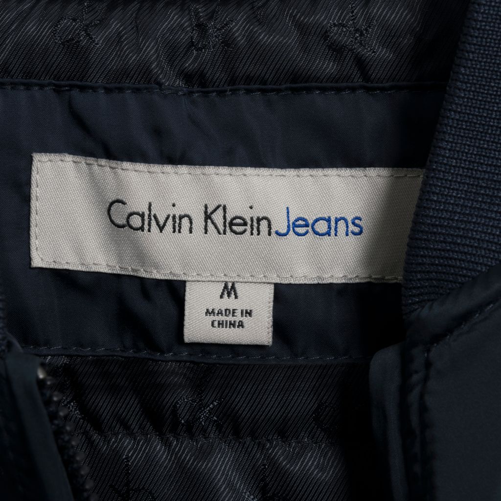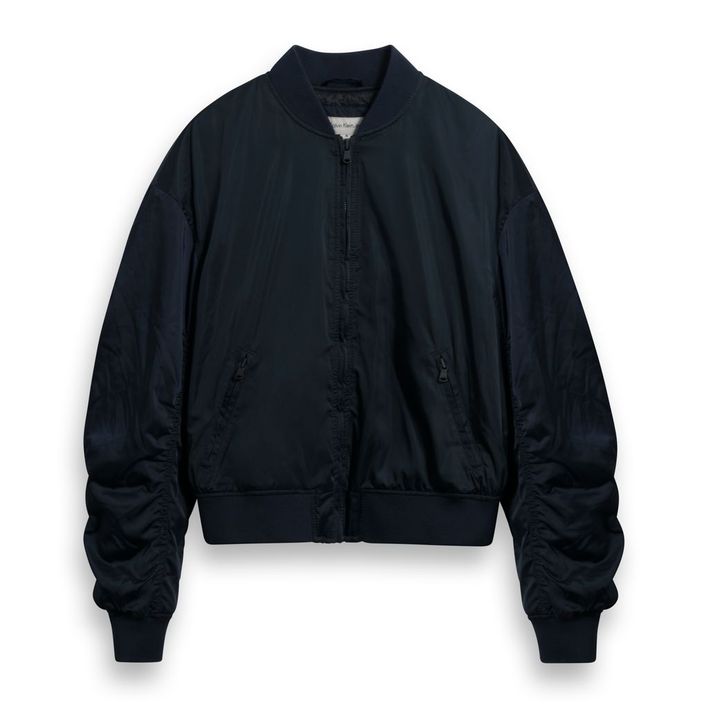 This navy bomber jacket from Calvin Klein features a ribbed collar, functional front zip closure, zip pockets, and ruched sleeves. Gently worn, in excellent condition.