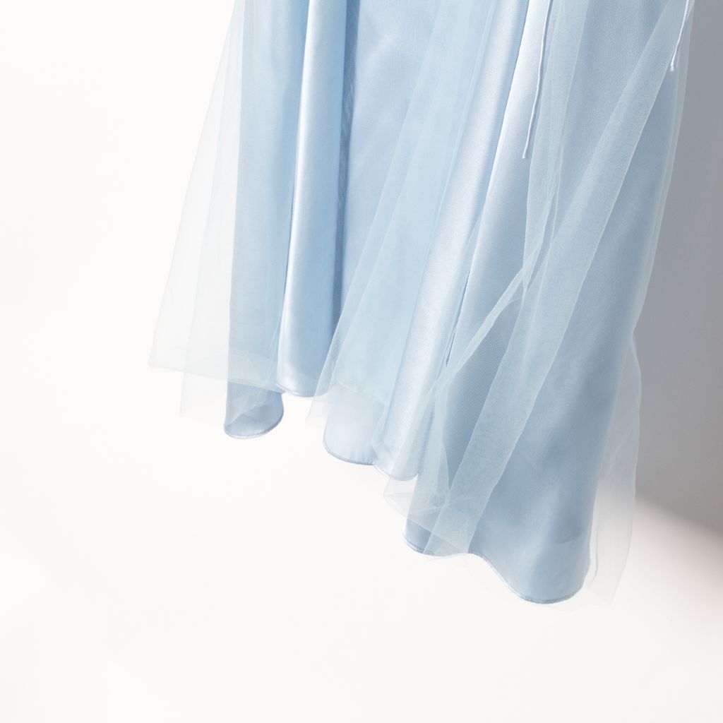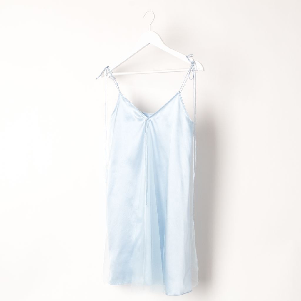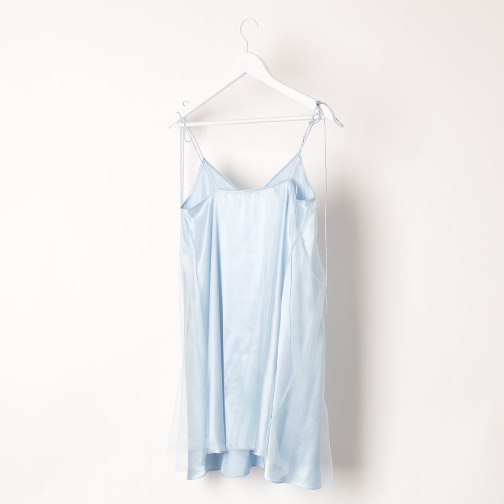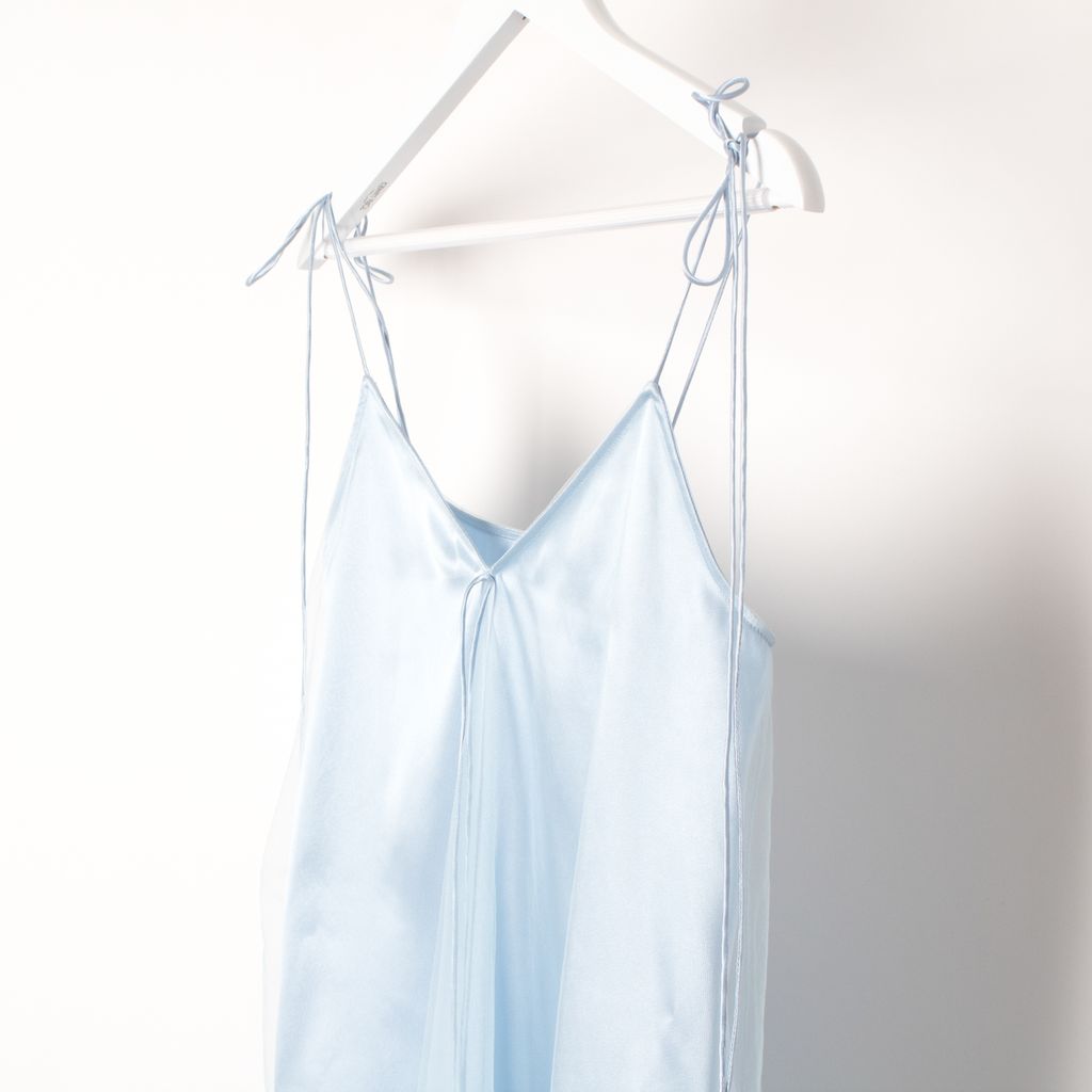 Like new Daisy brand white flared slip dress features an opaque baby blue silk underlayer and an overlay of tonal sheer tulle for an air-soft finish. Self-tie bow detail at V-neck, self tie spaghetti straps. 100% silk; 100% nylon tulle.