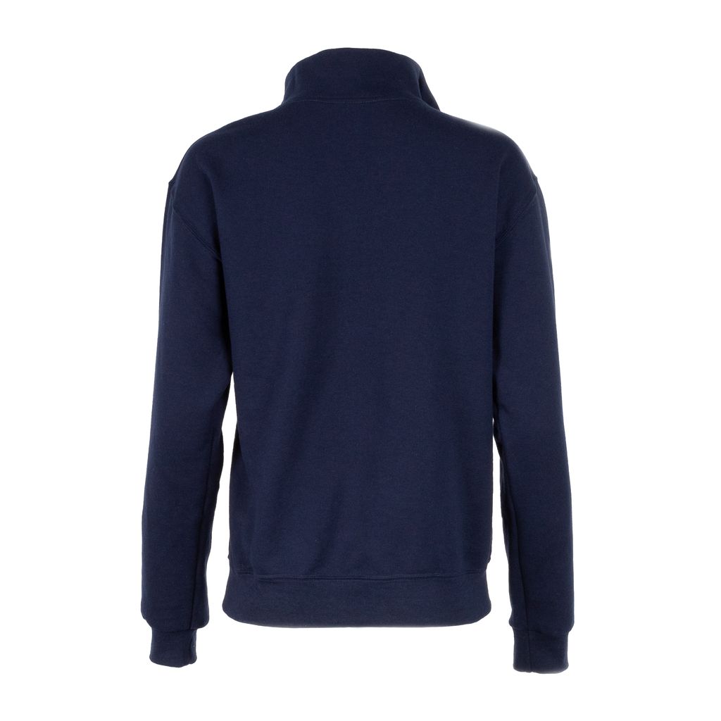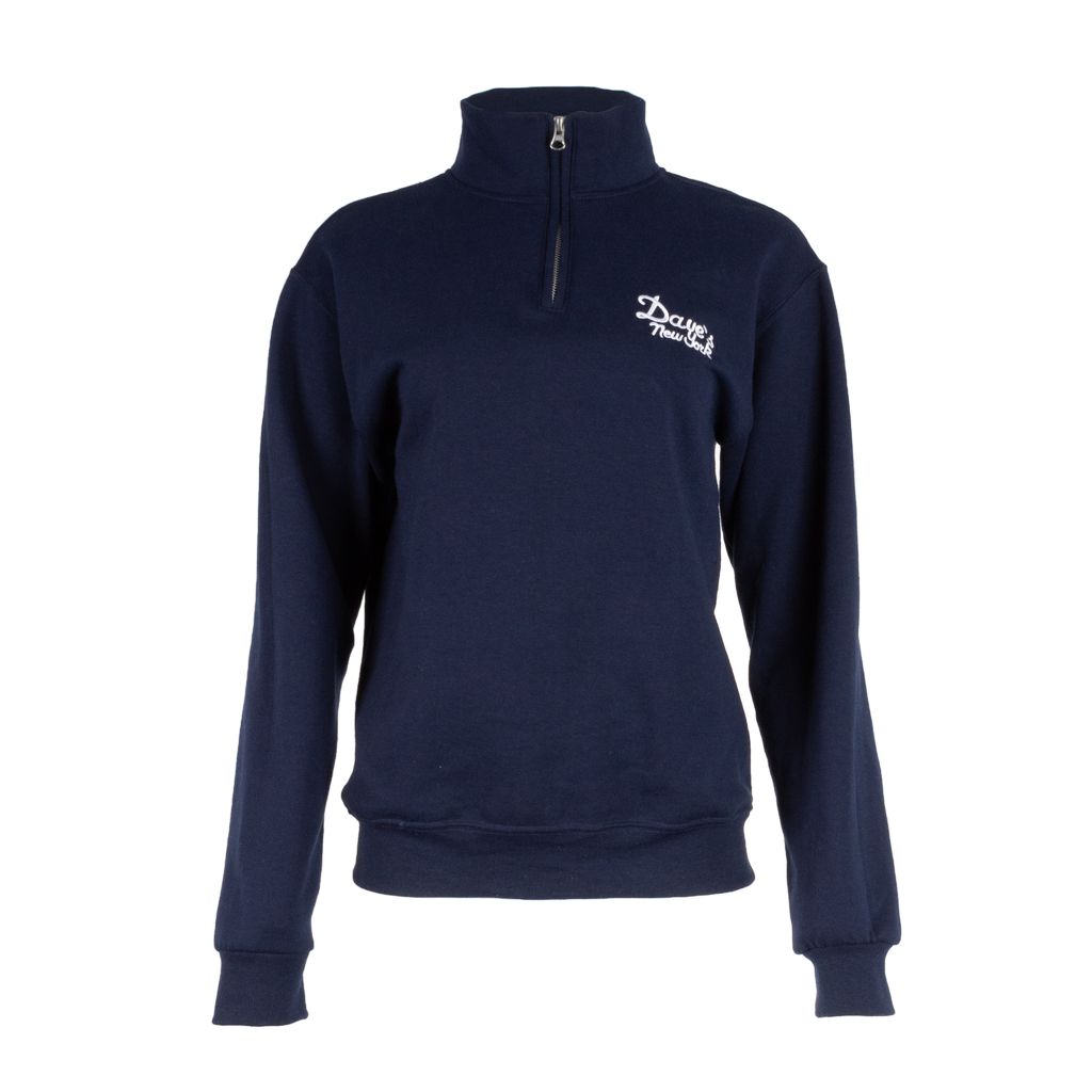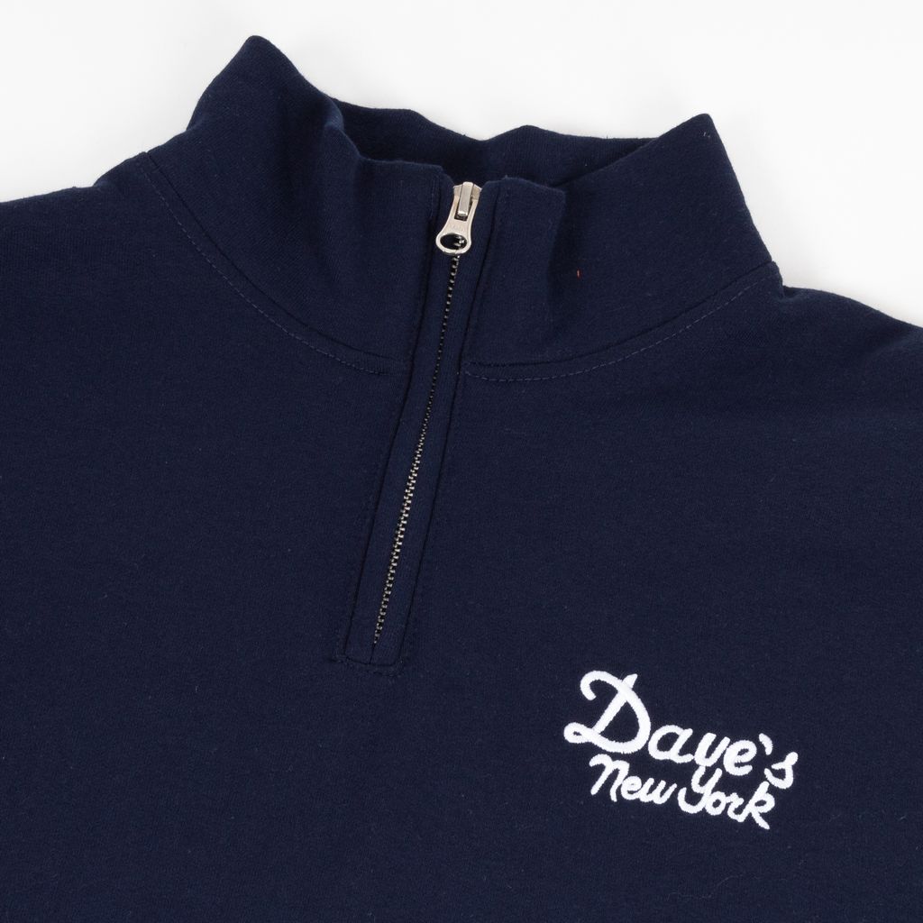 A New York institution for all things workwear related, this quarter zip sweater honors the long standing legacy of Dave's. Features high neck with quarter zip closure, drop shoulder sleeves, contrast colored Dave's New York logo on left side of chest, and rib knit bands at wrists and waist.