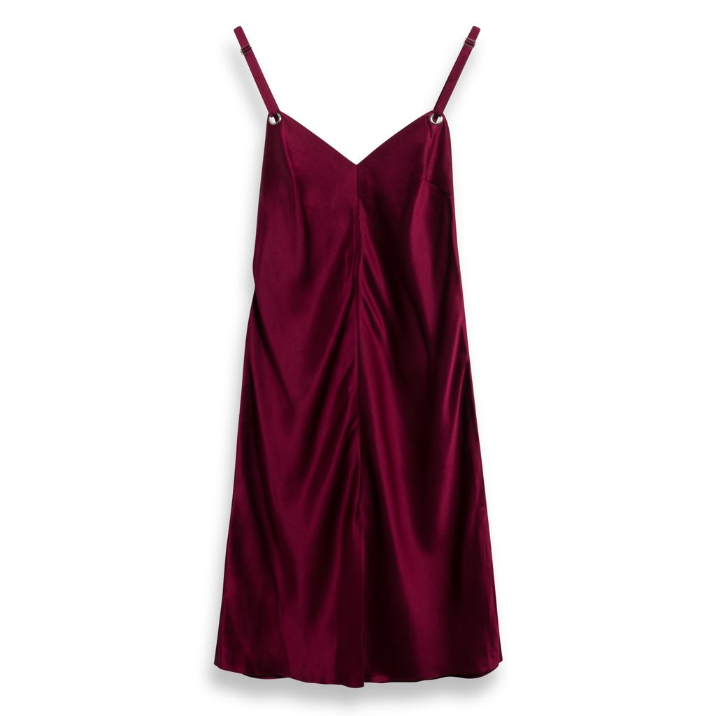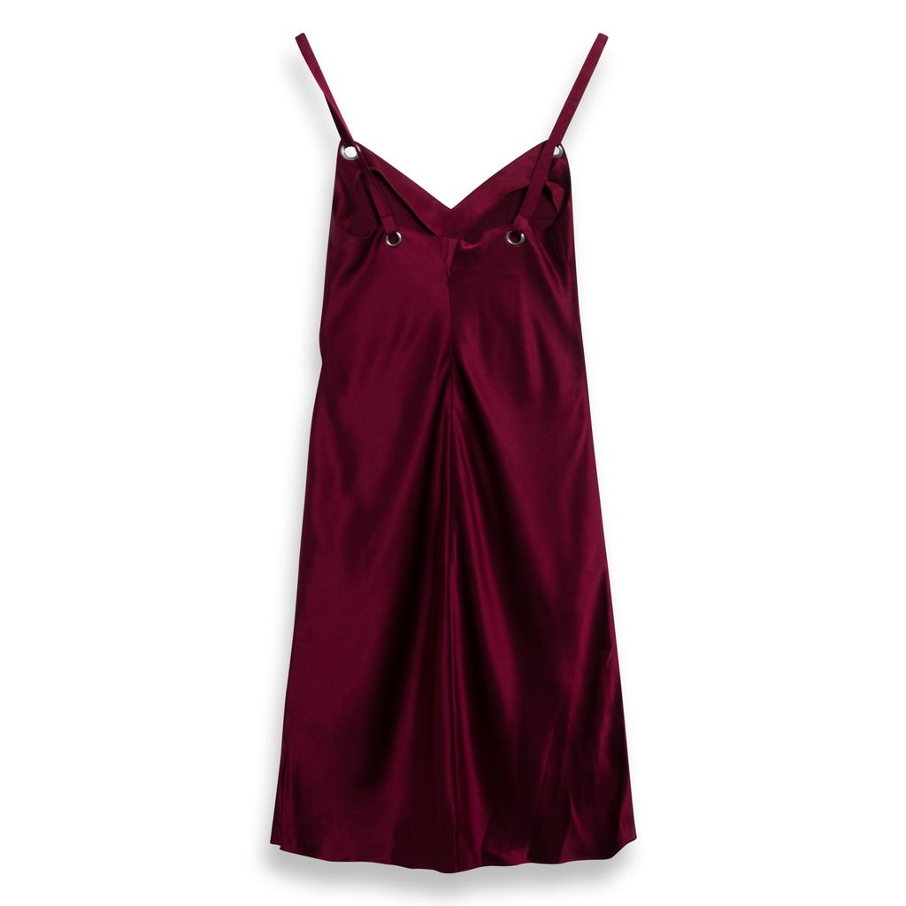 This delicate maroon slip dress has a slinky silhouette that features a V-cut neckline, front slit at the hem, silver eyelets at front and back bodice, and silver sliders at straps for adjustable fit. Has a minor black flaw on bottom front of the dress. In amazing condition, minor stain near front slit.