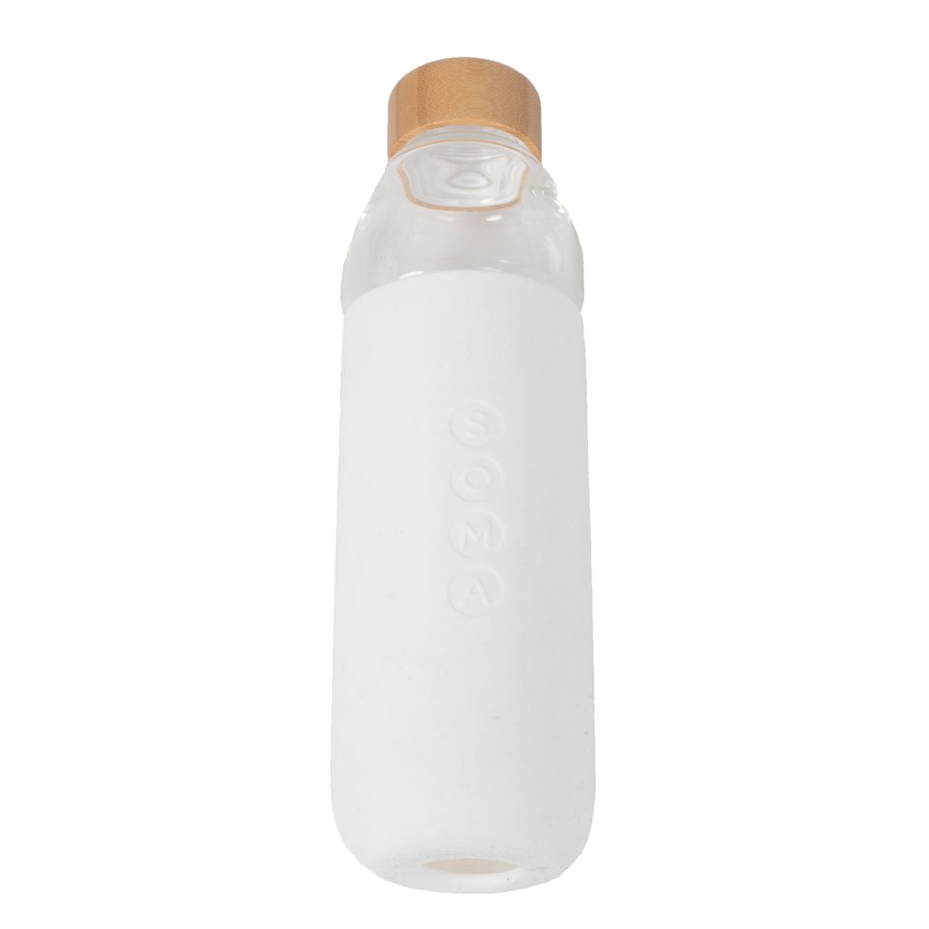 Evian by Virgil Abloh's clear Soma water bottle, adorned with the words "make a rainbow" in purple, is part of the limited edition One Drop can make a Rainbow collection. It's made from premium, durable glass and protected by a white non-slip silicone sleeve, with a leak-proof natural bamboo lid. Opt for it as a sustainable choice for staying hydrated during workouts.
