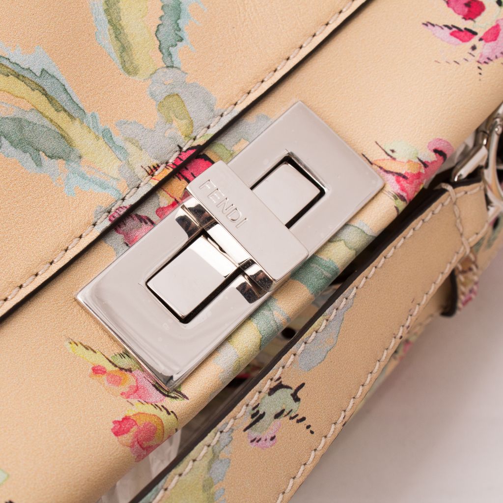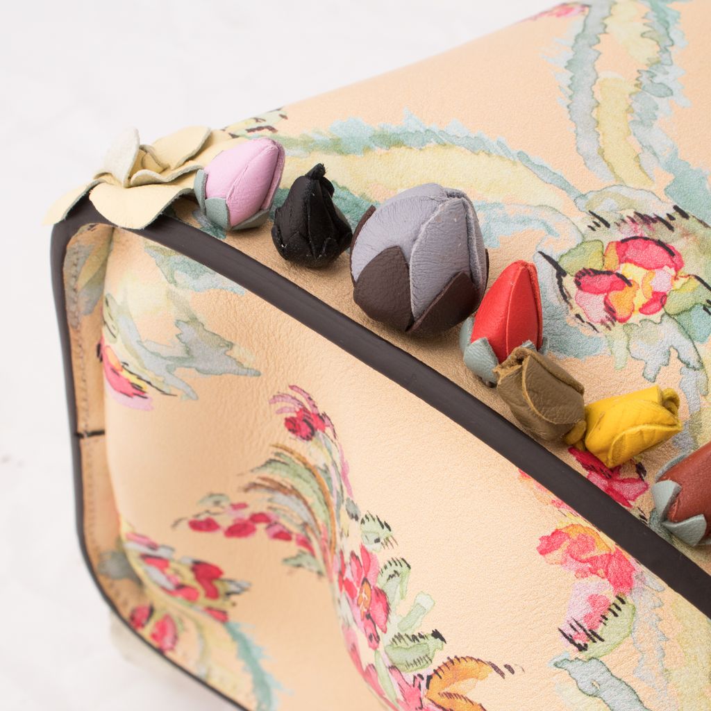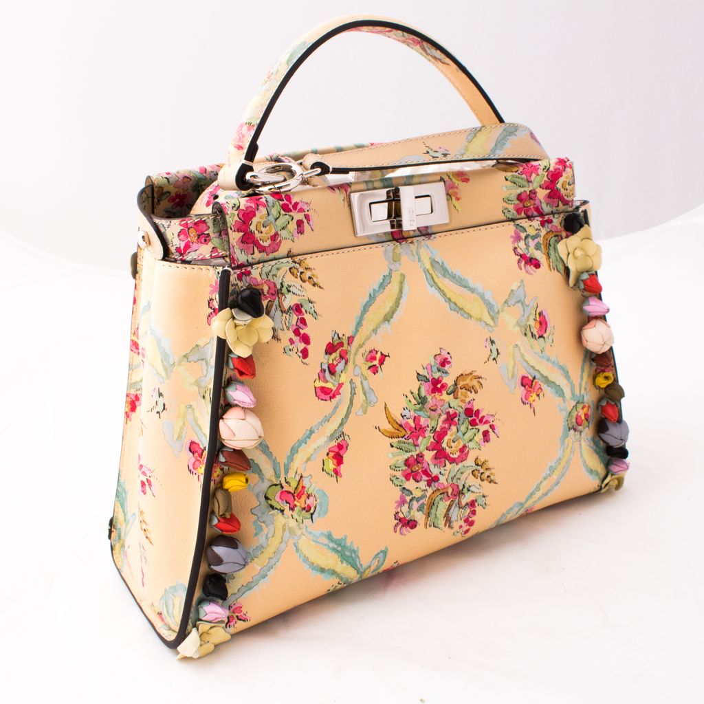 Fendi Peekaboo Medium Floral Print Tote made of calfskin leather. Contrast navy stripe lining. Palladium-finish metalware. In excellent condition, barely used.