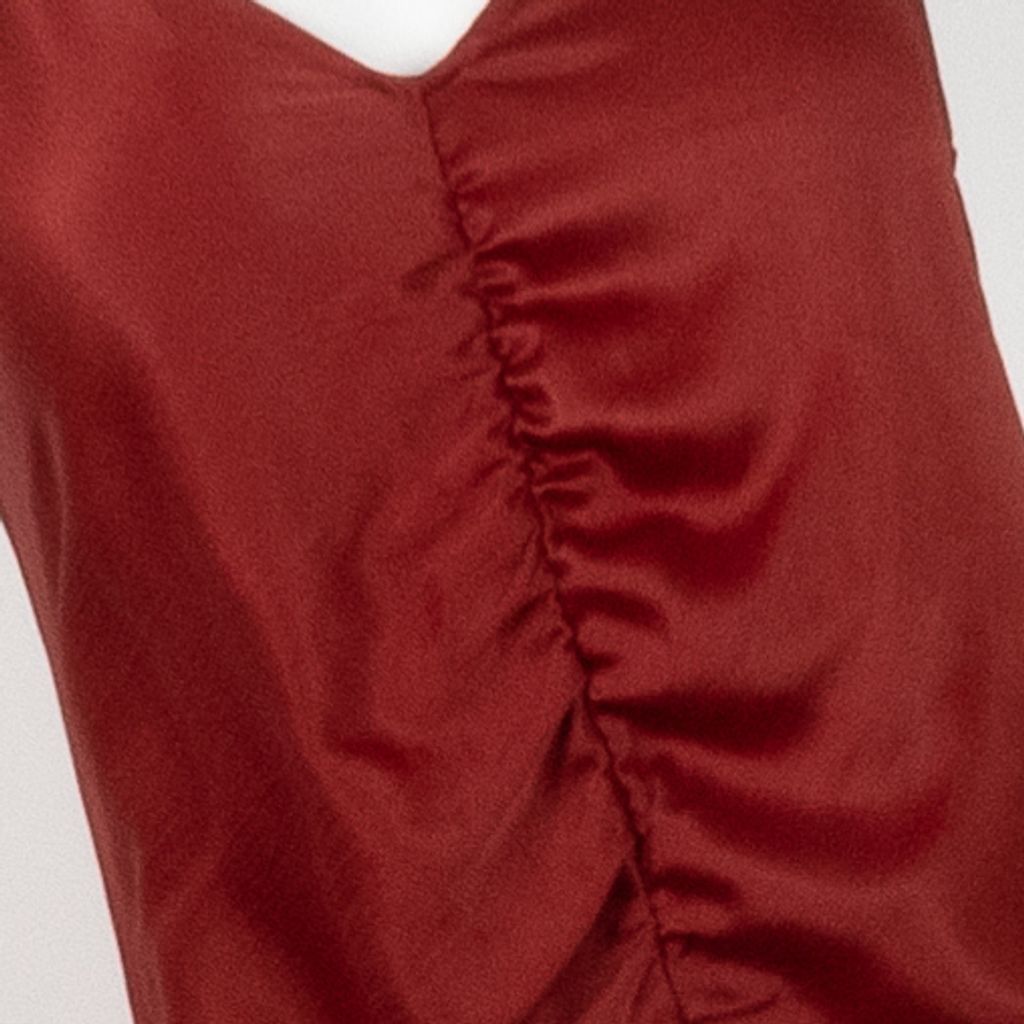 Elegant ruching and sleek sateen fabrication will draw all eyes to you when you wear this cami dress. Adjustable straps insure a snug fit up top while the maxi silhouette looks regal and flowing.