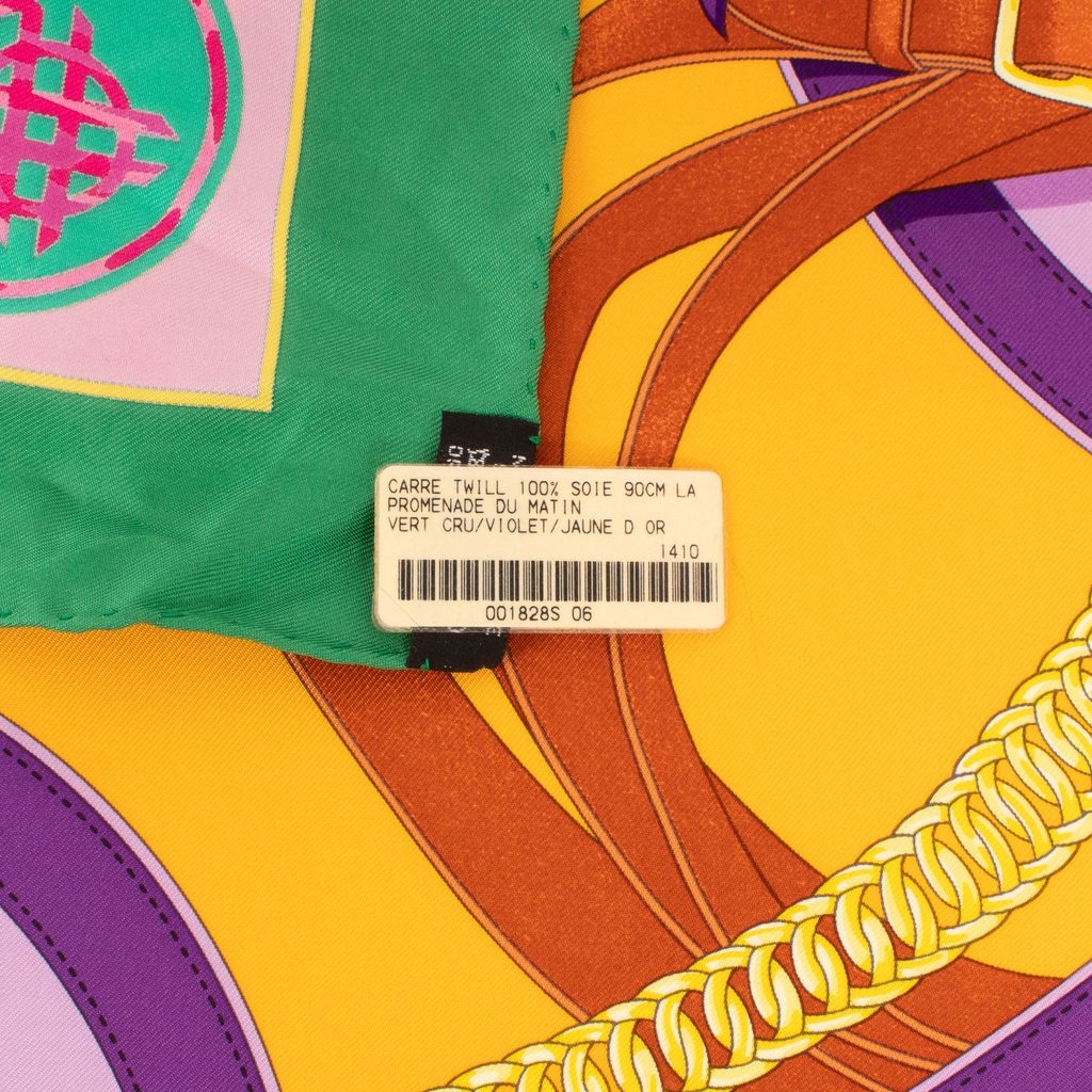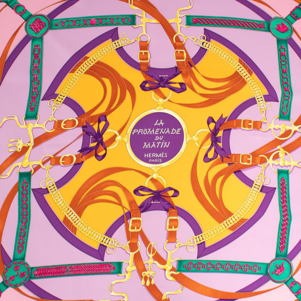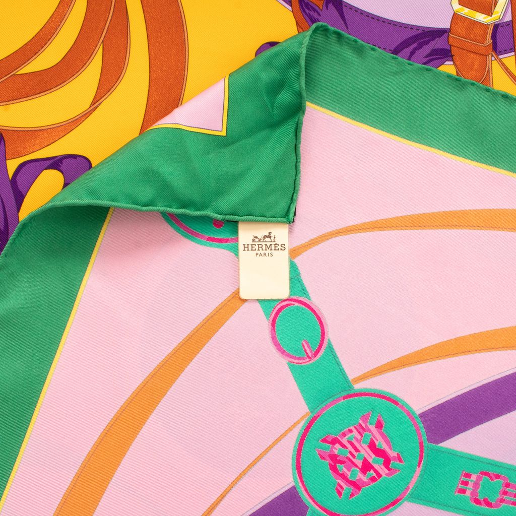 Nothing less than luxury is ever expected from Hermes, especially when it comes to accessories, and this vintage silk scarf is no exception. Features horsebit, chain, and ribbon design, center Hermes branding, and original tags still attached.