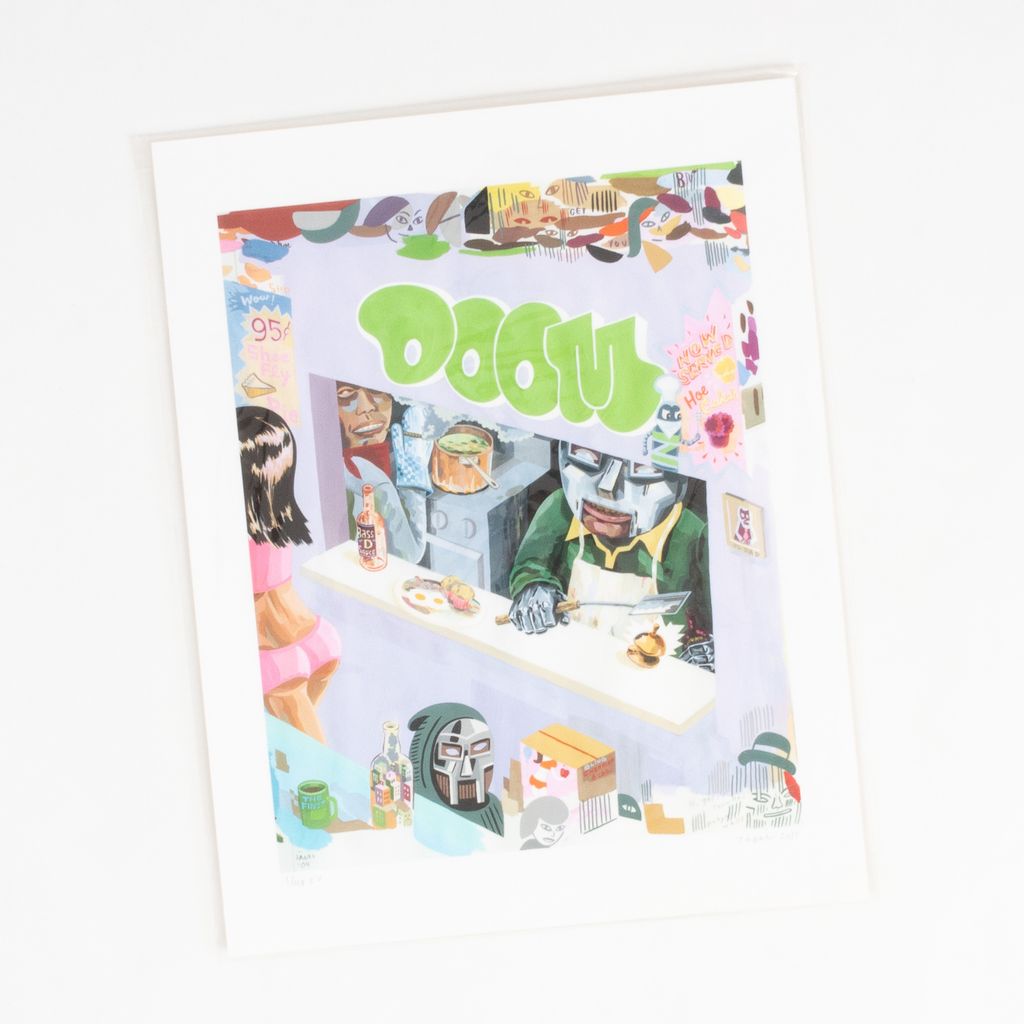 Done by Jason Jagel to celebrate the 10th anniversary of MF Doom’s MM FOOD album and Hoe Cakes single, this print is part of a signed and numbered edition of 40. Each piece has hand-painted elements along the top, bottom and side of the print, including an ‘extra doom’ character placed at the bottom.