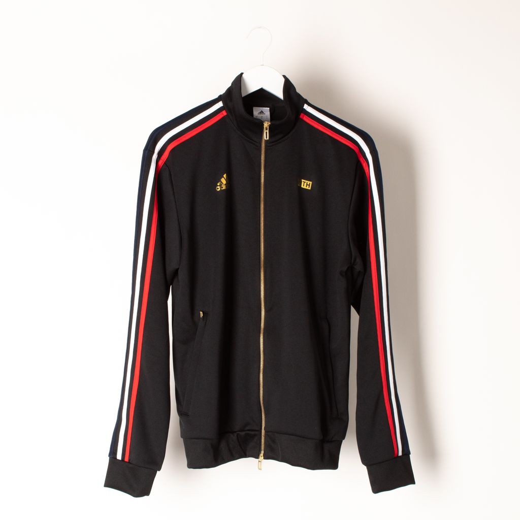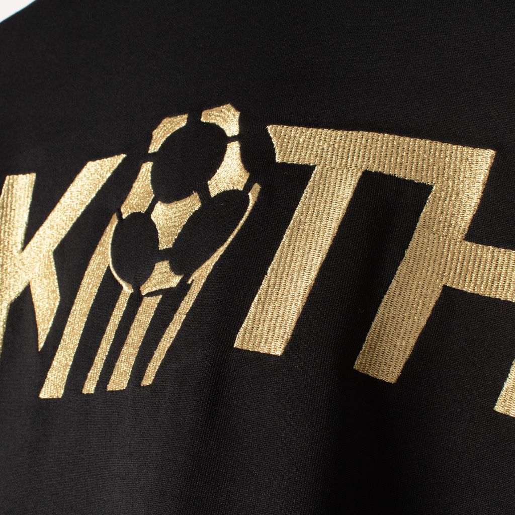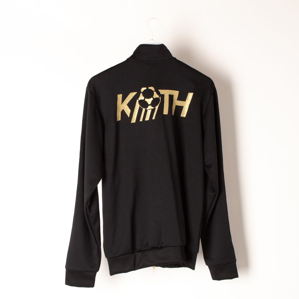 Brand new with tags. Polyester fabric with a stand-up collar, two-way gold metal zipper placket, printed gold foil co-branded chest logos, concealed two front gold metal zipper hand pockets and an embroidered Kith soccer logo on rear.