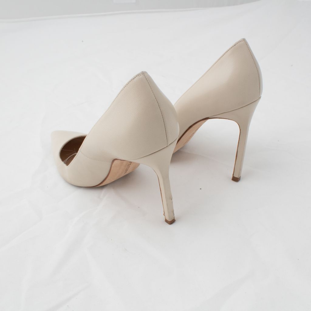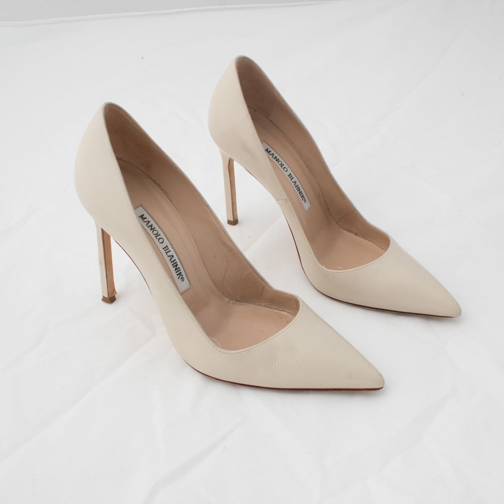 Gently worn Manolo Blahnik Leather Pumps. Slight discoloration in some areas and a few blemishes on the heels.
