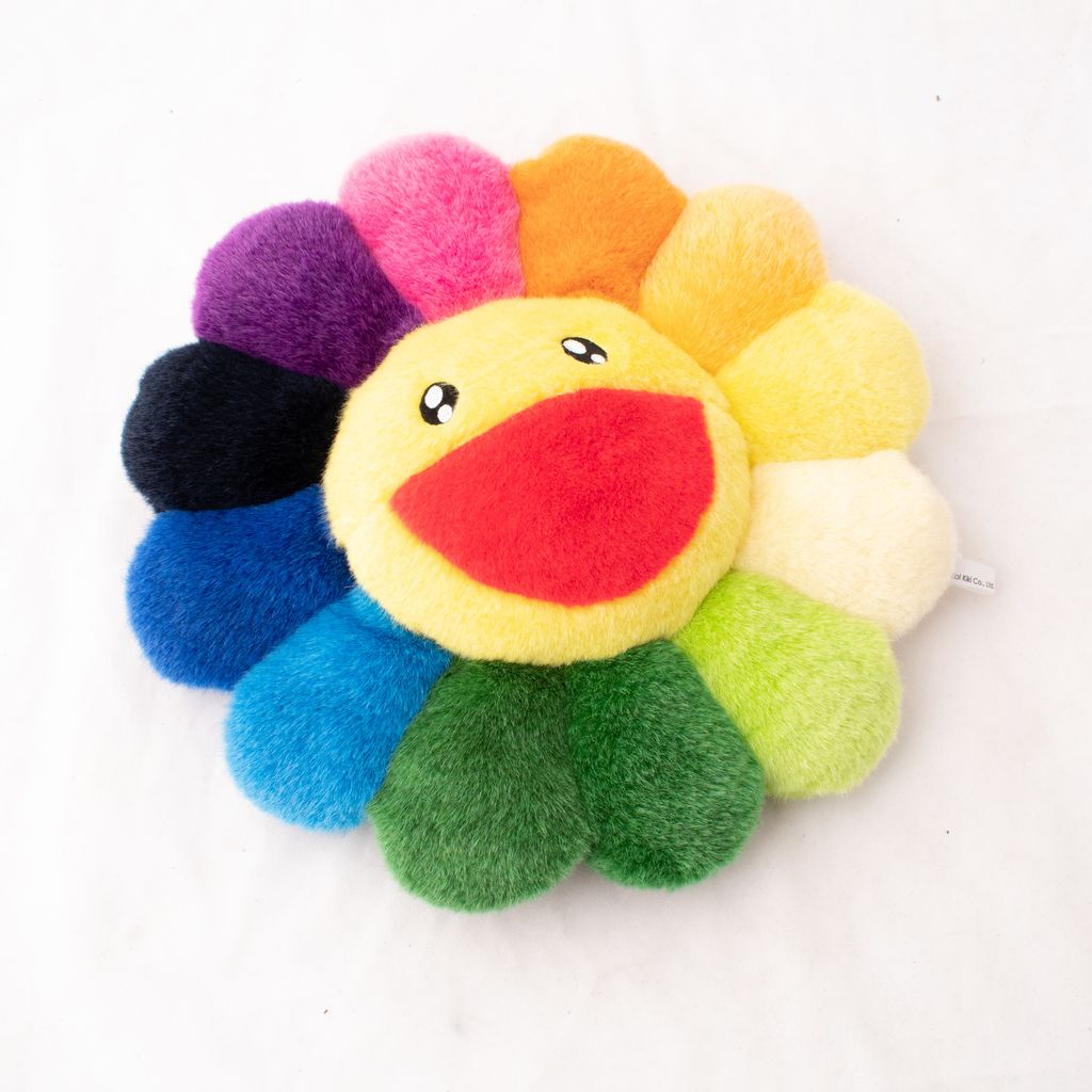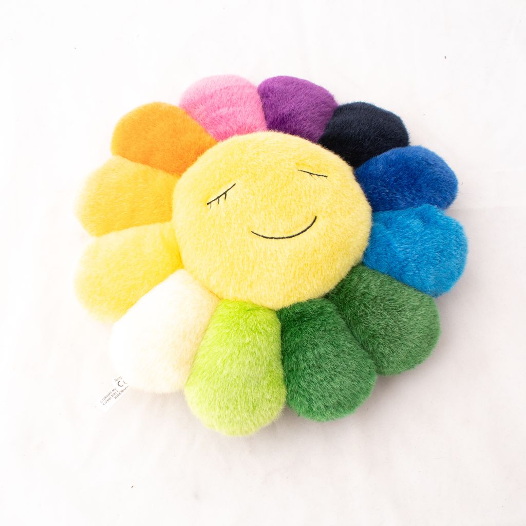 In great condition, double sided flower cushion from Murakami. Designed by Japanese artist Takashi Murakami, this plush flower cushion measures 30 cm (12"). Rare.