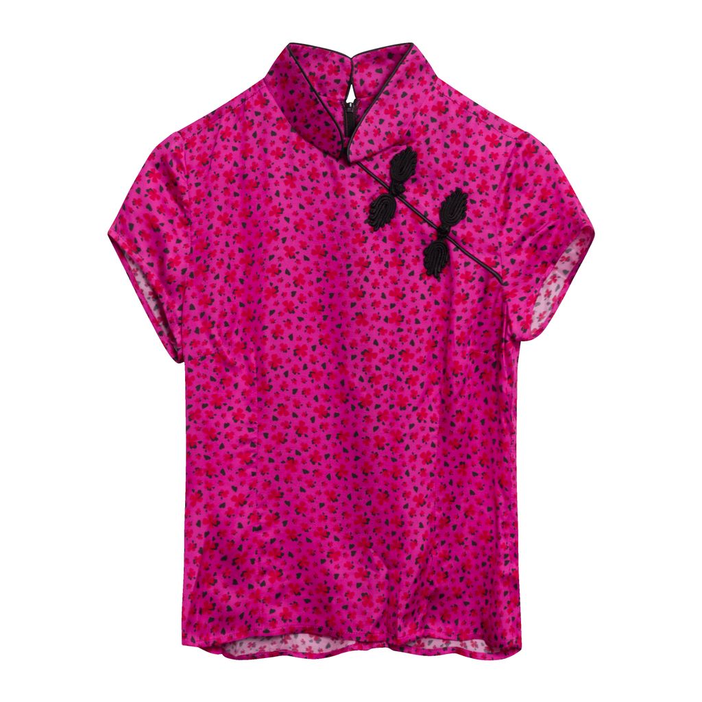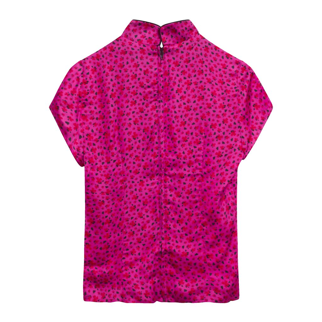 Fun and flirty, this high neck blouse from Musier Paris is totally the pop of color your spring wardrobe needs. Features all over pink clover print, contrast trim at neck, decorative toggles on chest, mandarin style collar, and zip closure at back neck.