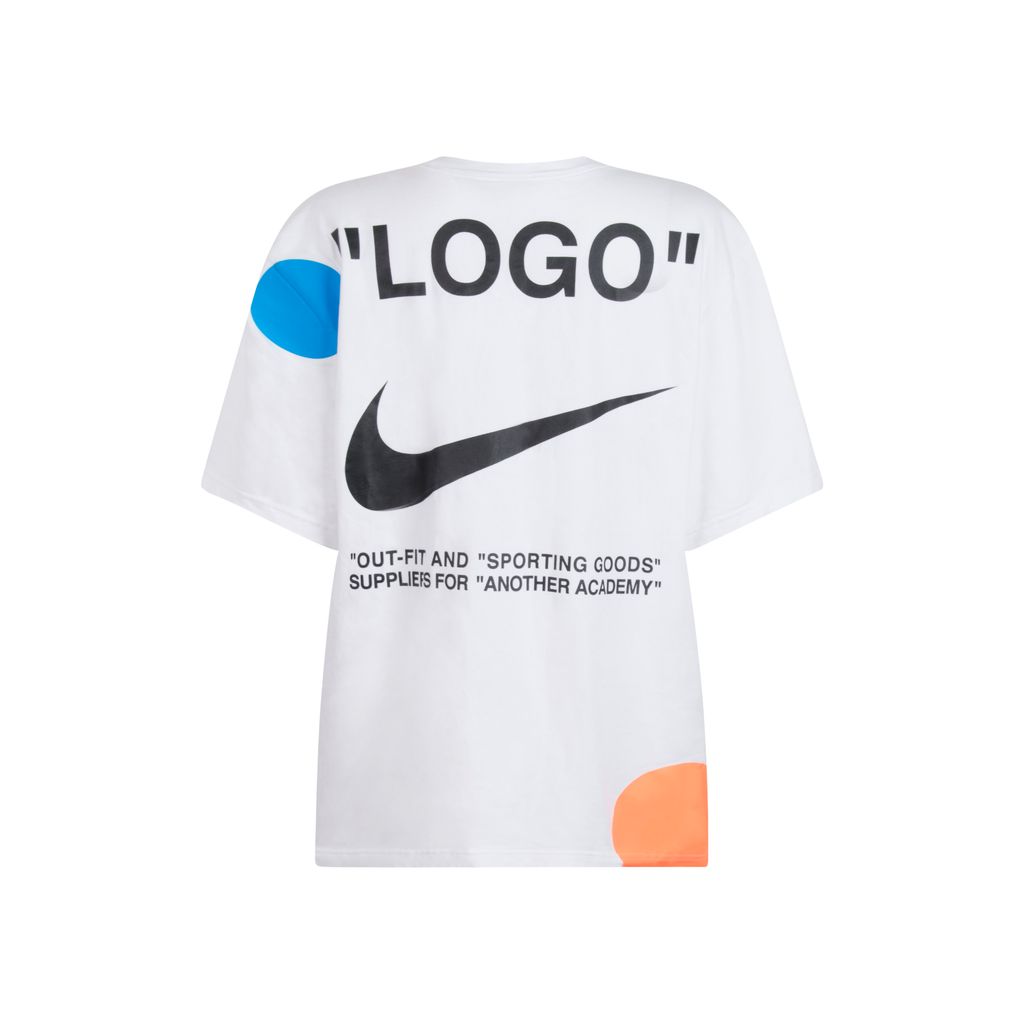 Printed with “LOGO” branding throughout, this boxy tee is the result of a soccer-inspired collaboration between Off-White and Nike. Inspired by Virgil Abloh’s childhood passion for the game, this cotton style is a street-wise take on Off-White's graphic aesthetic. This shirt has a round-cut ribbed neckline and a cropped boxy silhouette. Gently worn, in excellent condition.