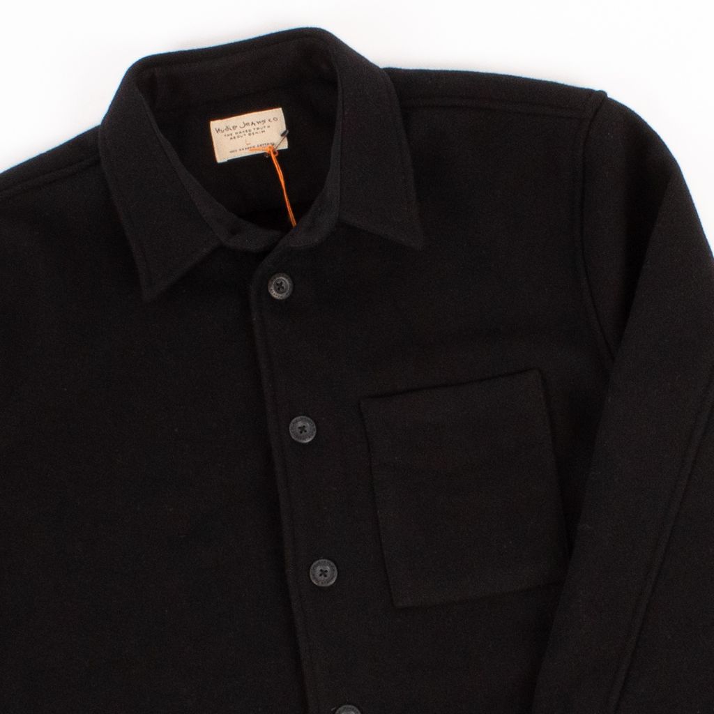 Perfect for those in-between months when you don't want to break your coat out just yet, this wool overshirt from Nudie Jeans is an easy layering choice. Features medium size collar, monochromatic button down front closure, front pocket on chest, and button closure cuffs.