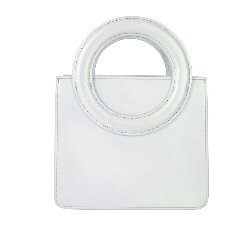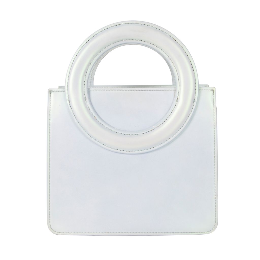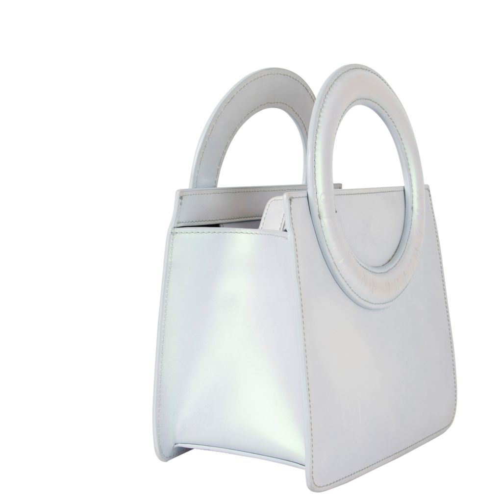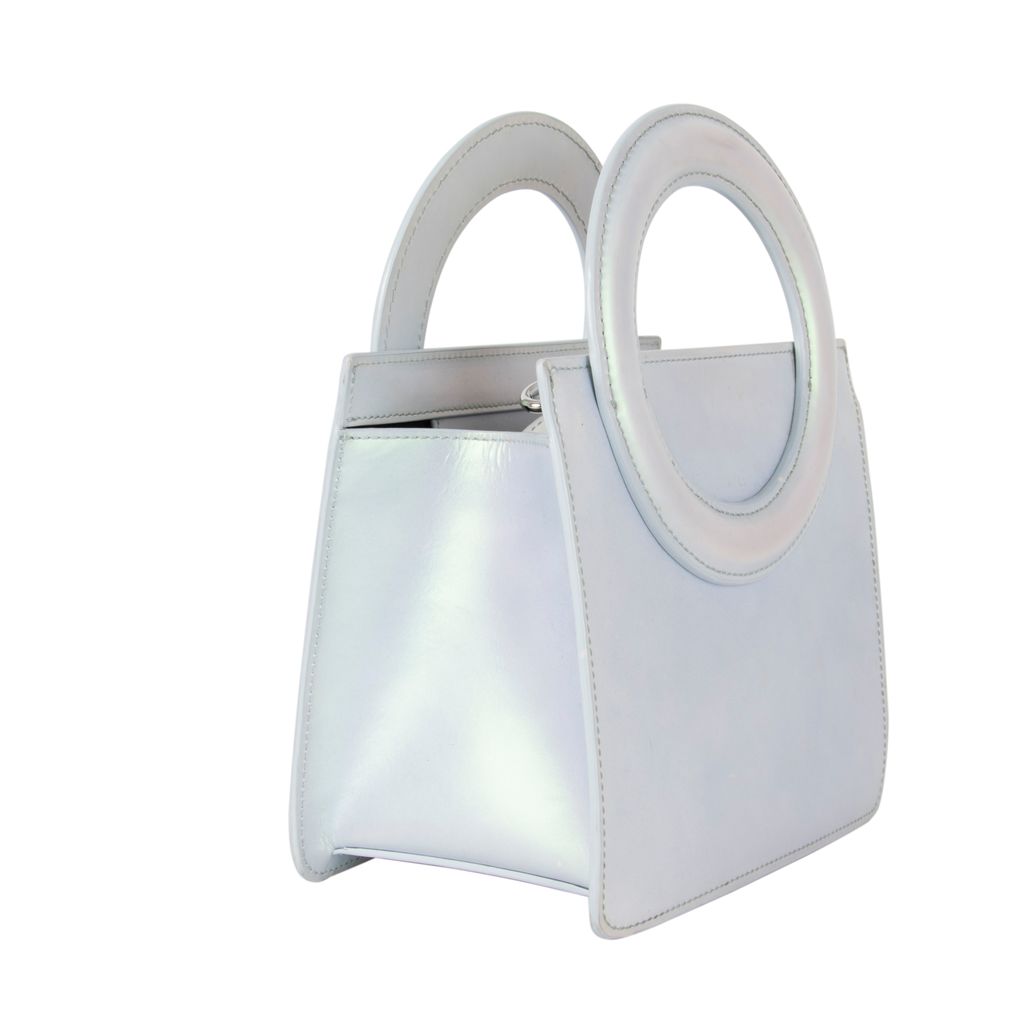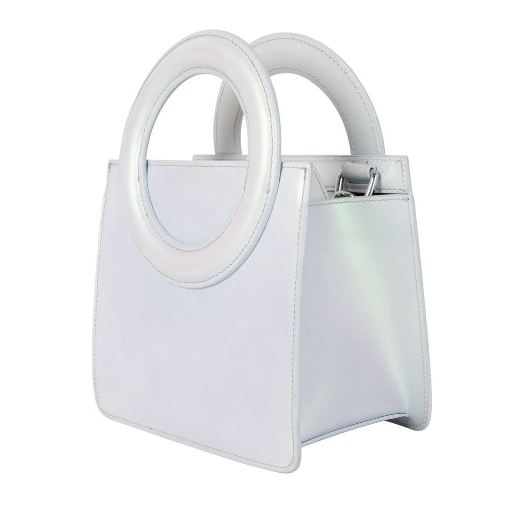 This iridescent 60's style mini tote from Opening Ceremony has all the functionality a modern girl needs. Features box body design, O shaped top handles, removable and adjustable crossbody strap, Opening Ceremony logo embossed on handle, zipper closure top, and lambskin leather fabrication. Gently used, minor scratches throughout, in good condition.