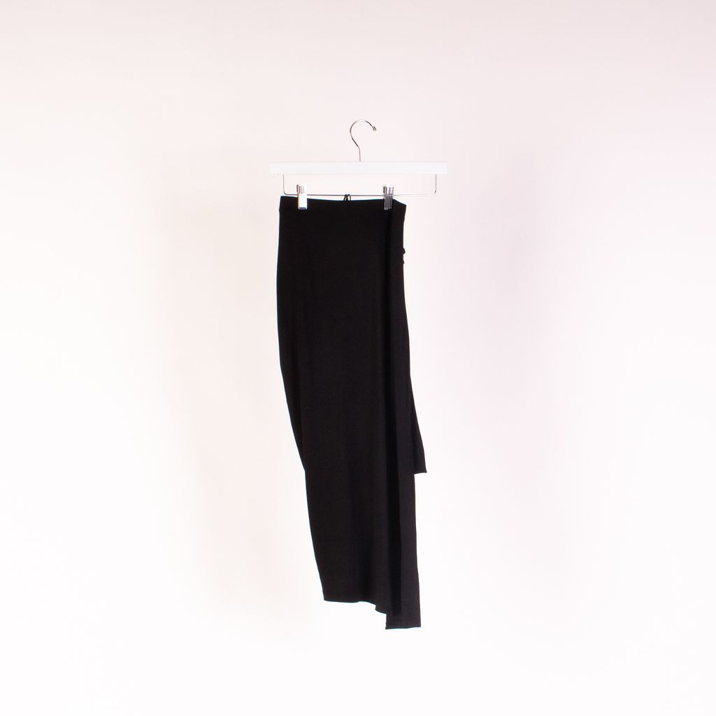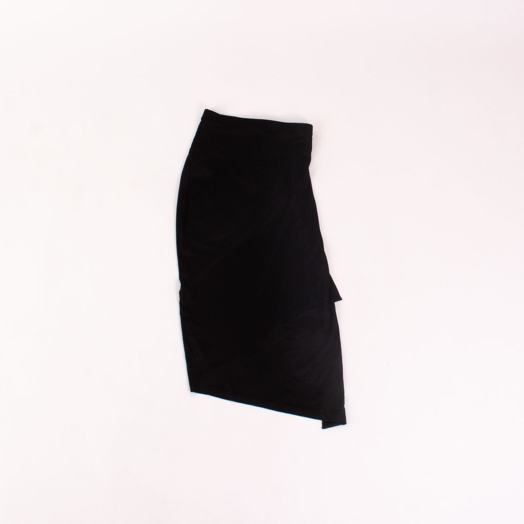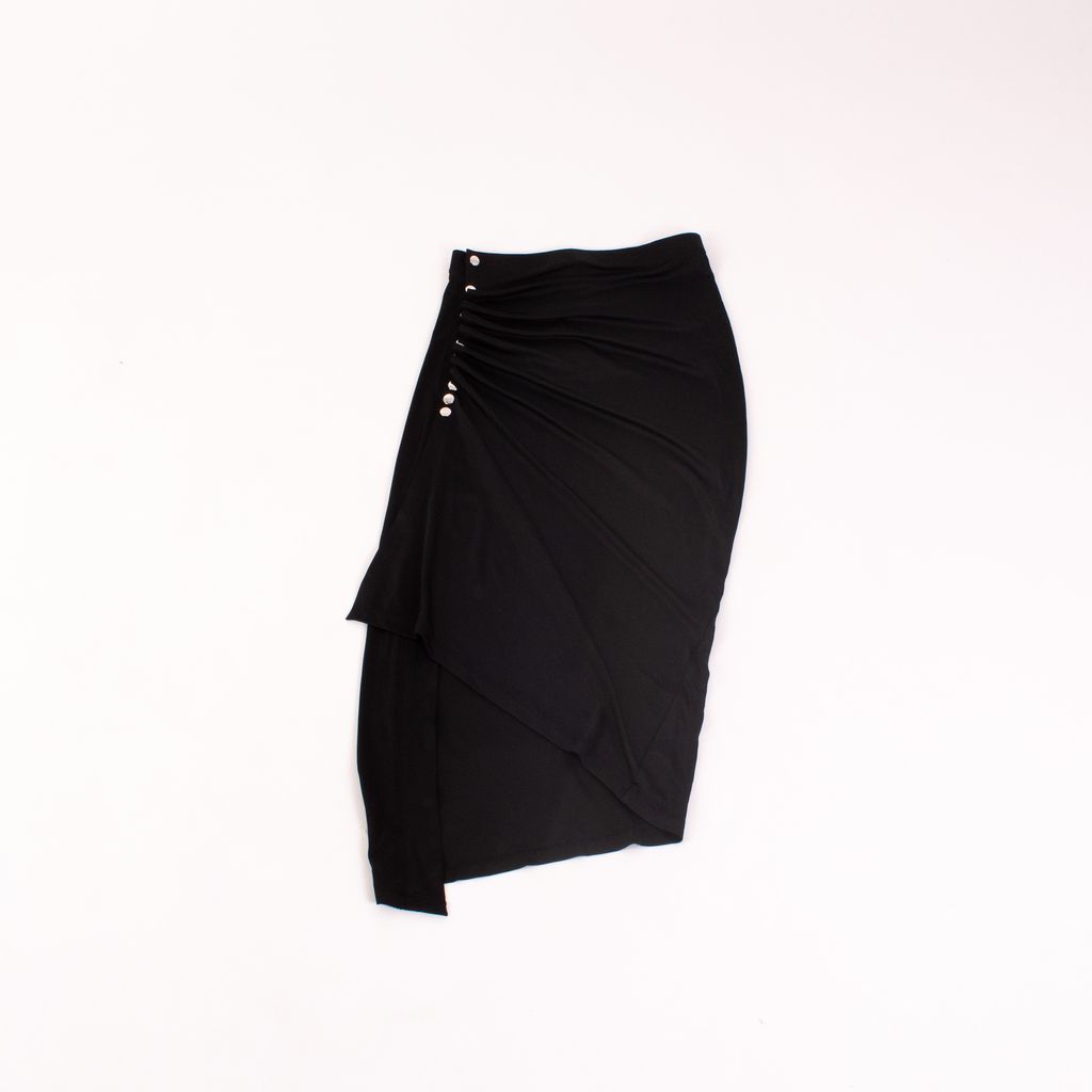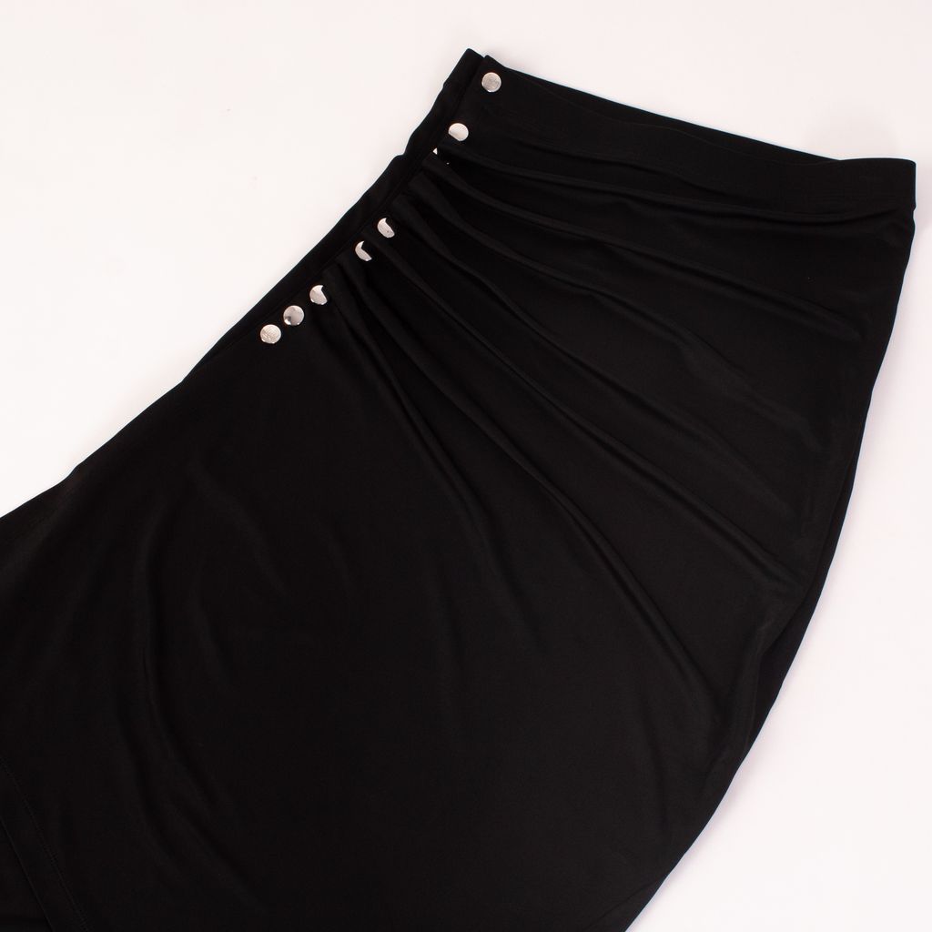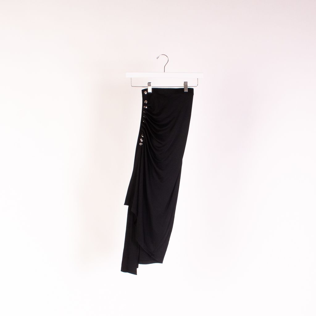From notable womenswear designer Paco Rabanne, comes this asymmetrical midi skirt that has his hallmark touches of metal and feminine shape. Features ruched side with metal detail, knit fabrication for all over stretch, and elastic waistband.