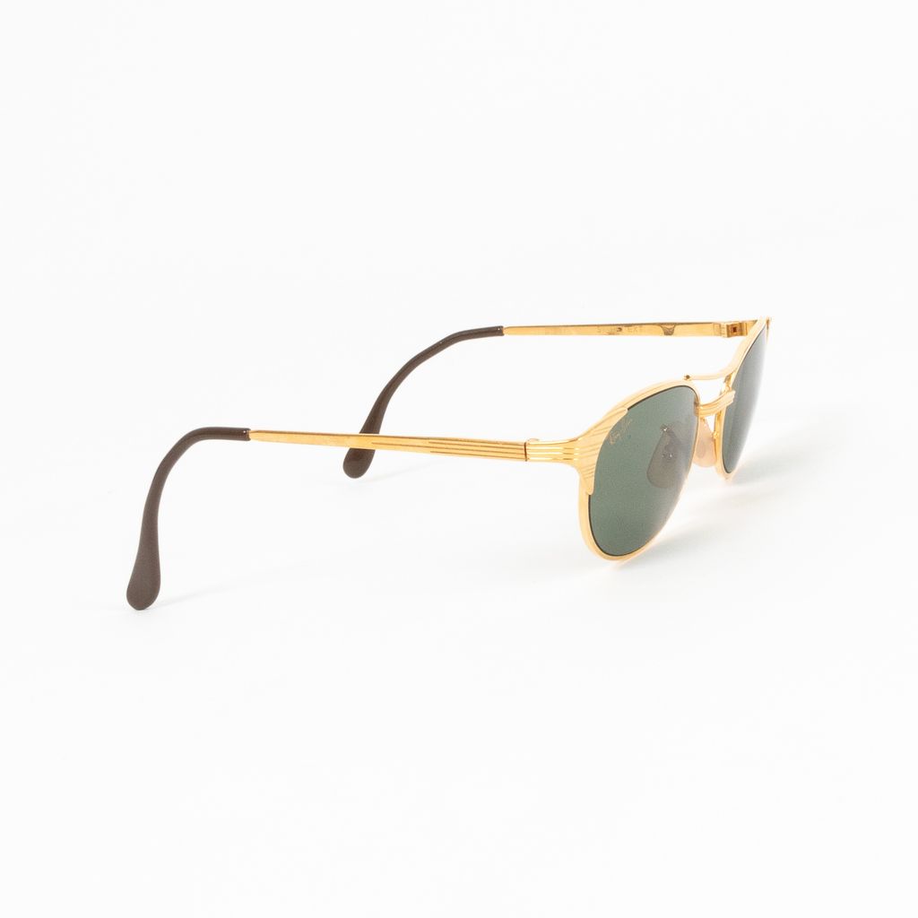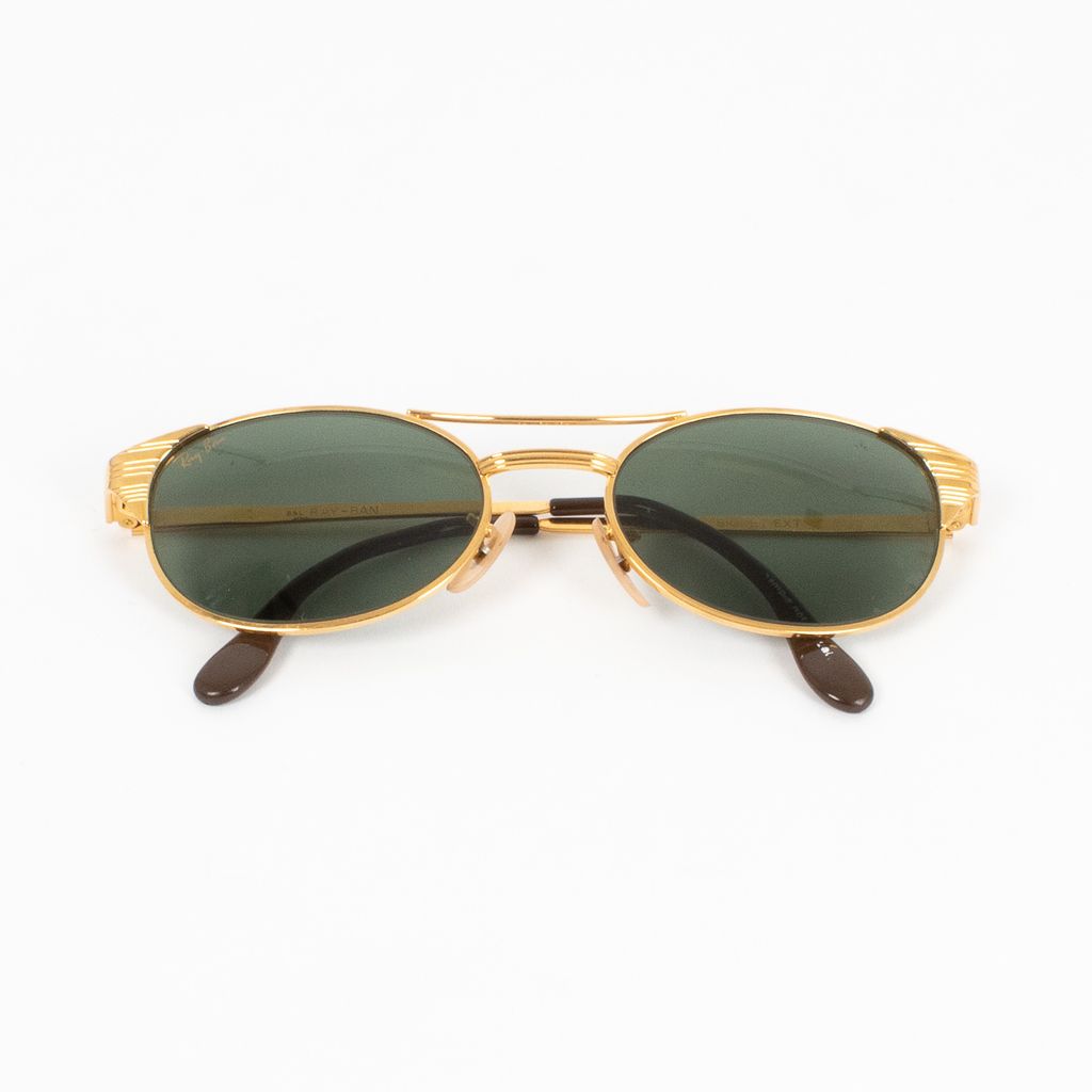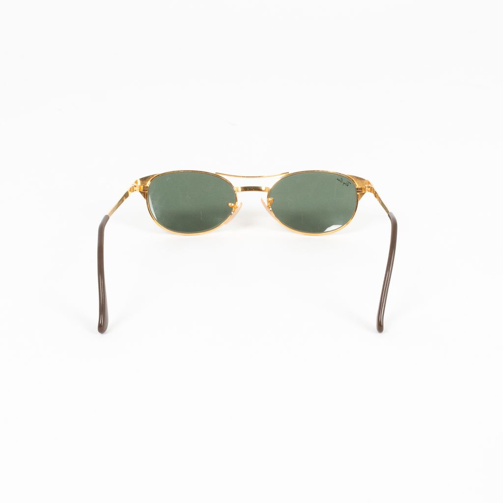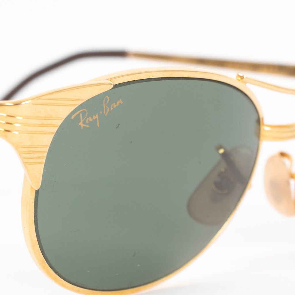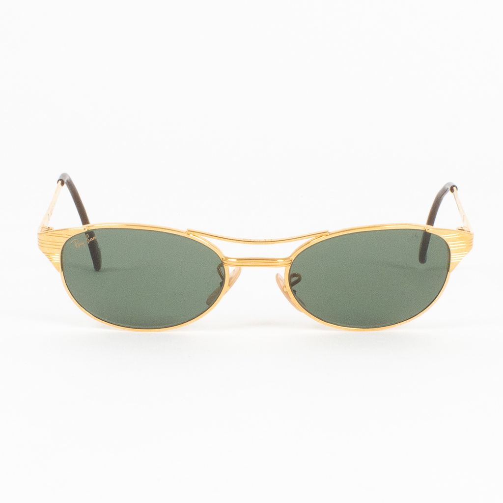 Designed and created in the 1950's, these unisex sunglasses from Ray Ban offer an alternative to the modern oversized aviator without sacrificing the cool factor. Features gold frame with brow bar and line detailing, tortoiseshell arm covers, green polarized lenses, and clear rubber nose pads.