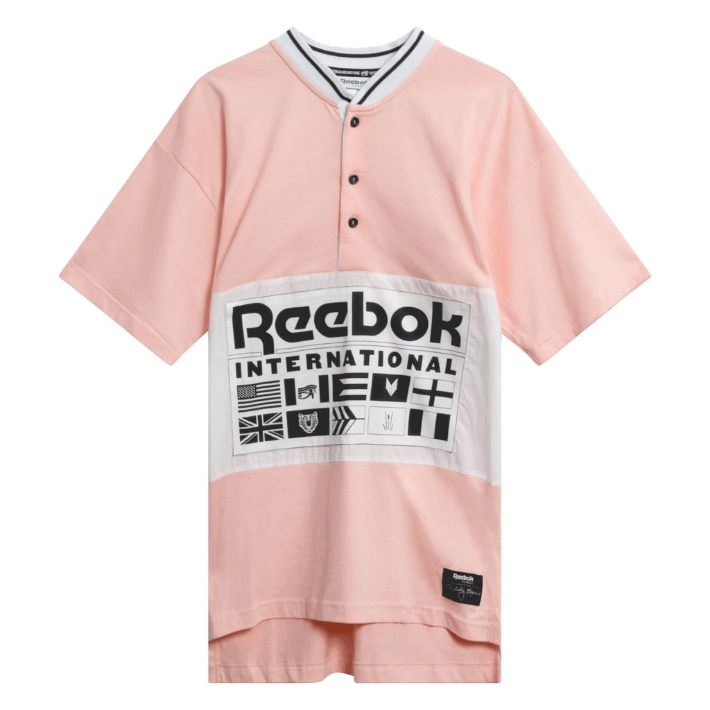 Coming from their collection with jewelry designer extraordinaire Melody Ehsani, this oversized henley style shirt oozes Fairfax cool. Features button down neck with knit mandarin style collar, drop shoulder sleeves, large Reebok x Melody Ehsani graphic panel on middle front, and collaboration tag at bottom left.