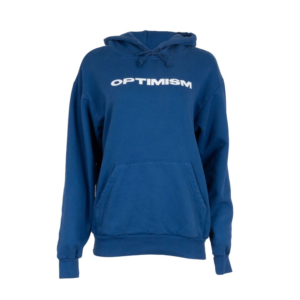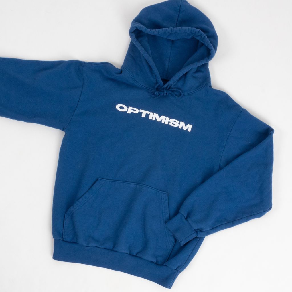 A piece from Emily's own brand, the Sporty and Rich Optimism hoodie is here to give you that extra boost of happiness with its cheery, bright blue color. Standard hoodie stylings like the kangaroo pocket and ribbed cuff hems make it a no-fuss item to throw on and go where ever you need to spread a little bliss.