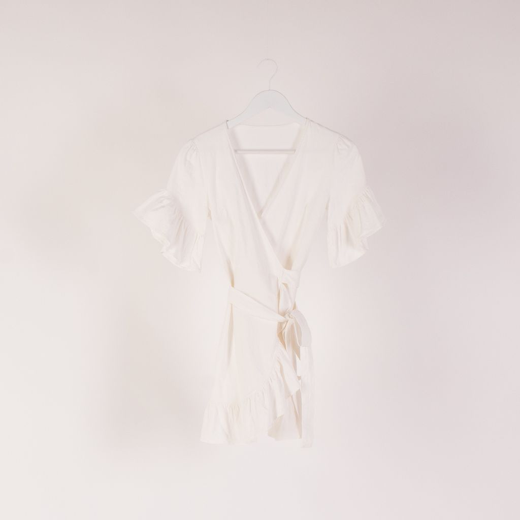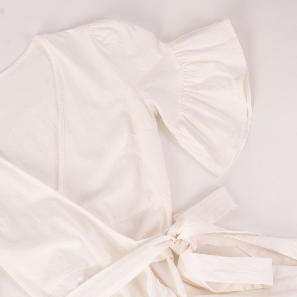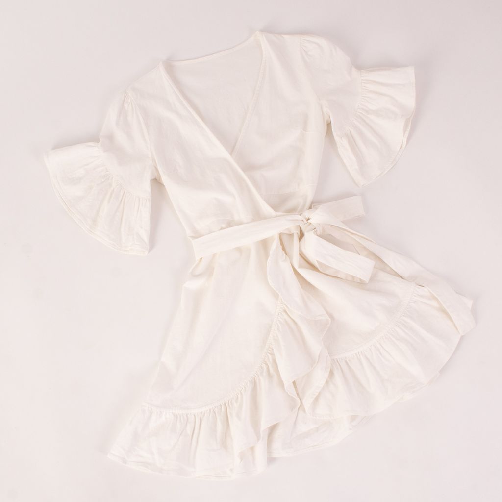 This dress from Australian label Style Addict, is one part beautiful silhouette and one part functional fabrication. Features ruffle sleeve shape, wrap around waist tie, and low v-neck shape.