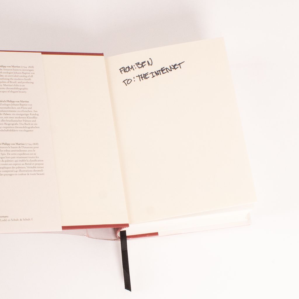 From a collection of books representative of Ben, this one is about different species of palm plants with a page signed "From: Ben, To: The Internet"