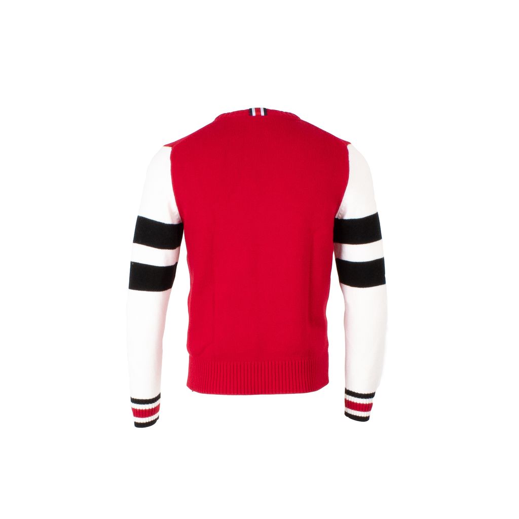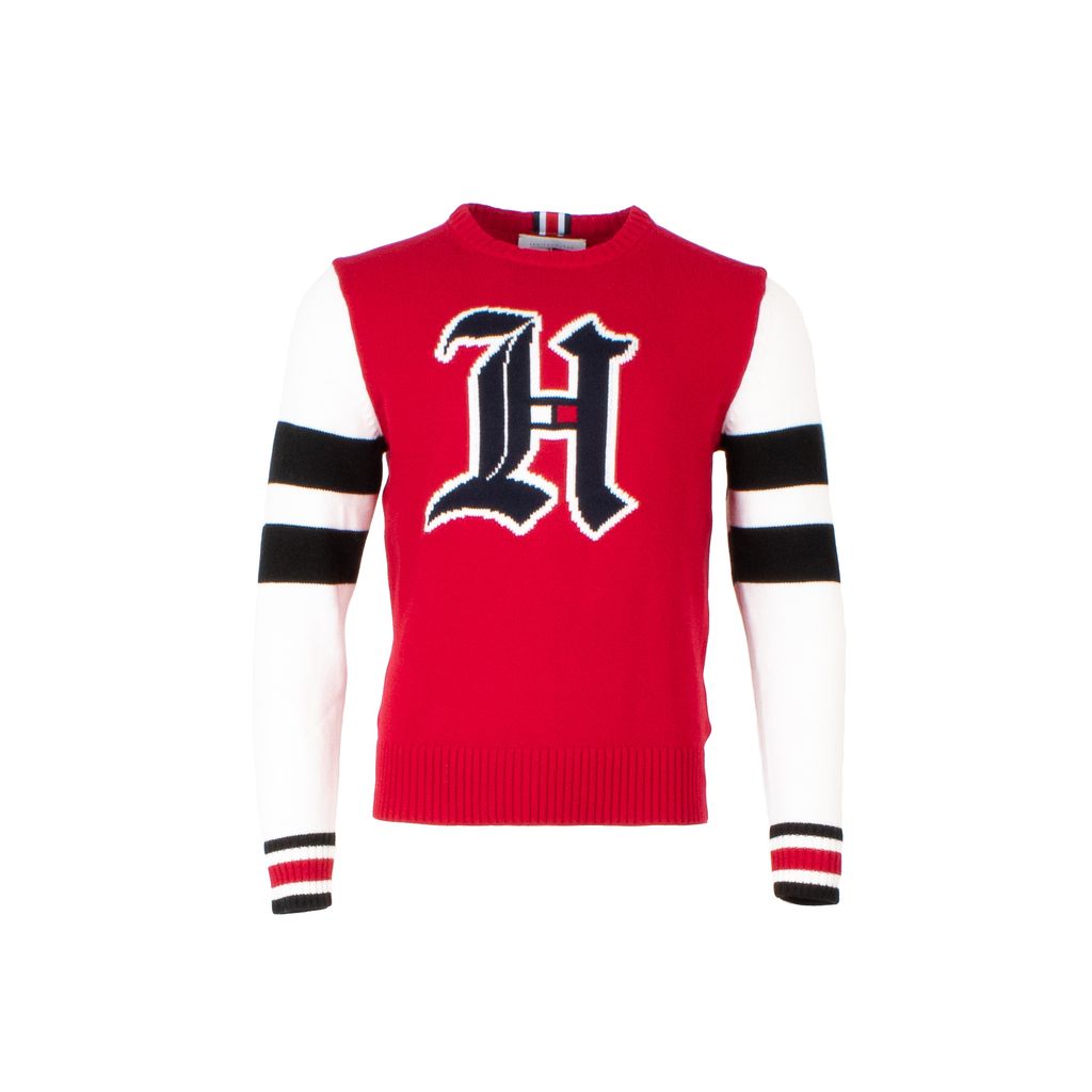 Give me a T! Give me an O! Give me an M-M-Y! Bring it on with some collegiate style in this Louis Hamilton for Tommy Hilfiger pullover sweater. Features solid colored body with old english H on front, striped upper arms detail, rib knit bands at neck and wrists, triple stripe detail on wrists, and triple stripe Tommy Hilfiger tag at back of neck.