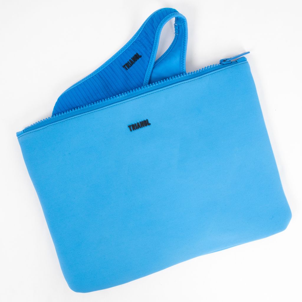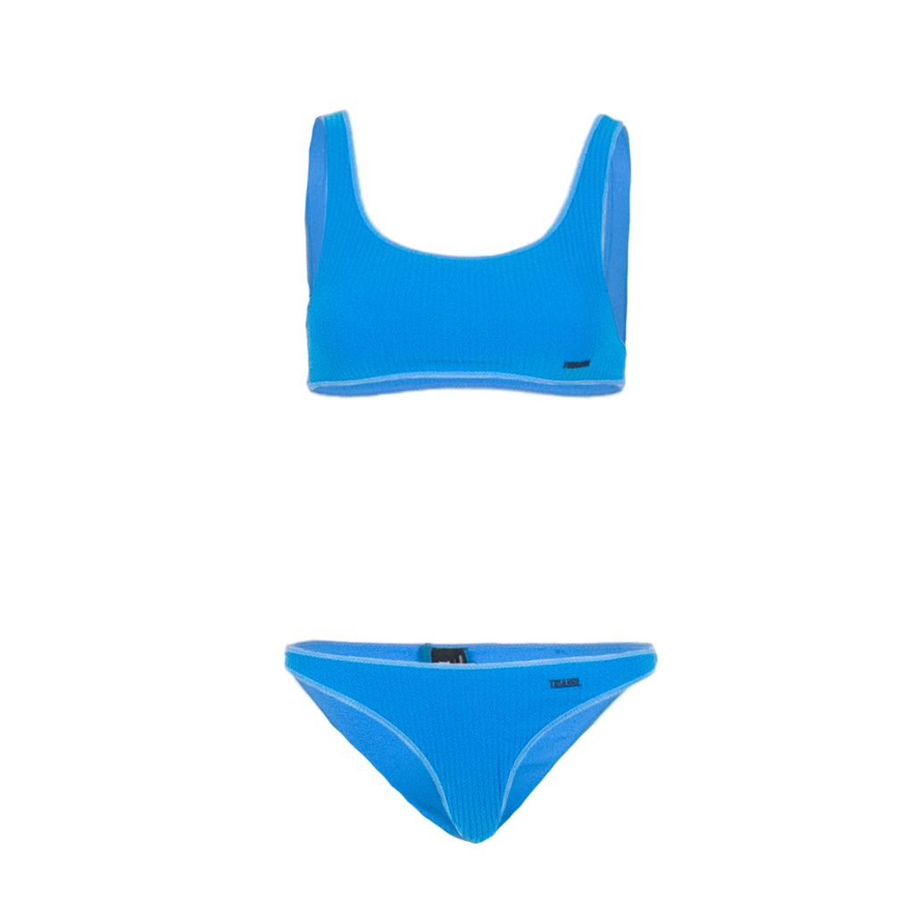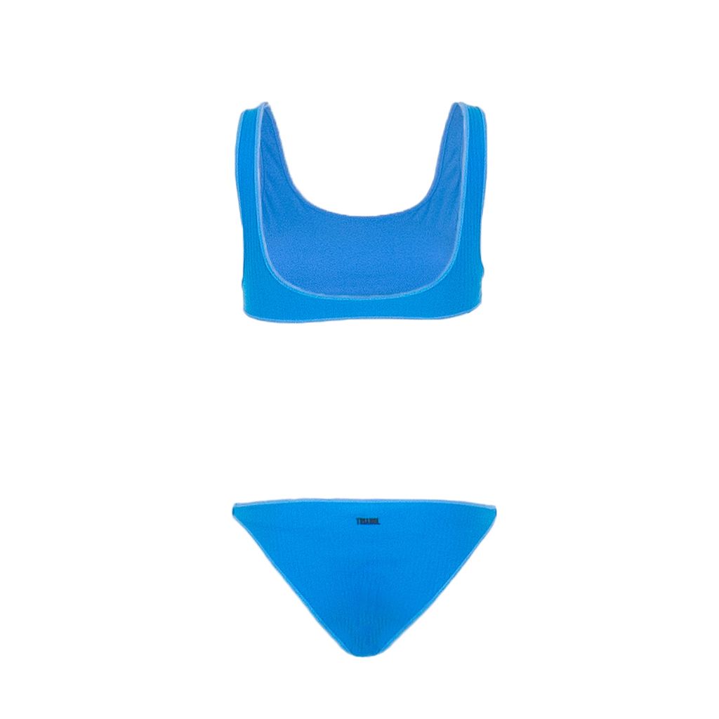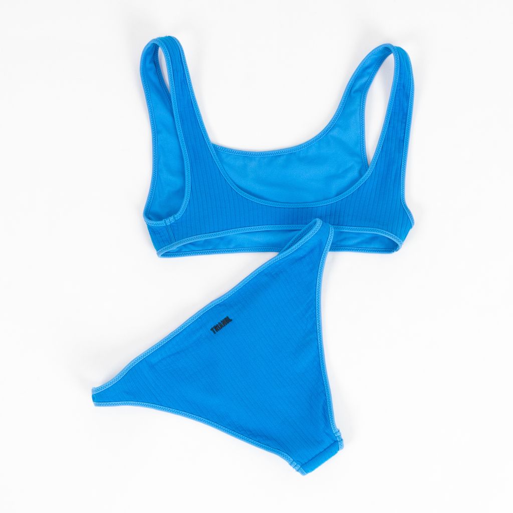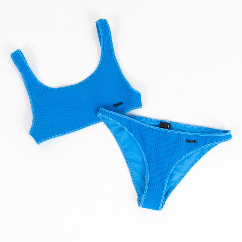 Electric blue and teeny tiny, there's a reason that Triangl's swimwear has made waves on social media. Features ribbed body fabrication, narrow top with skinny adjustable straps, tonal clip back closure on top, high waisted and cheeky V cut bottom with Triangl logo on top back, and neoprene zip top carrying bag.