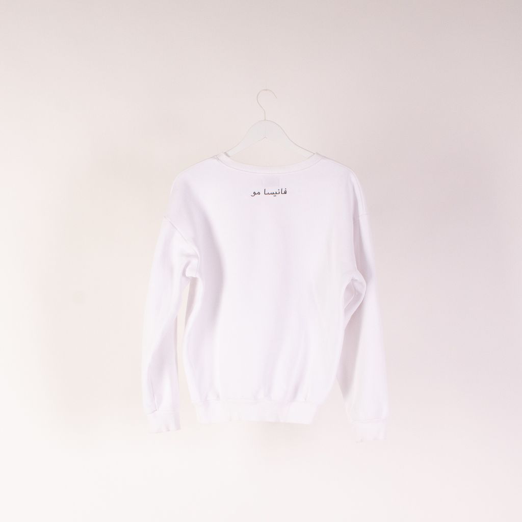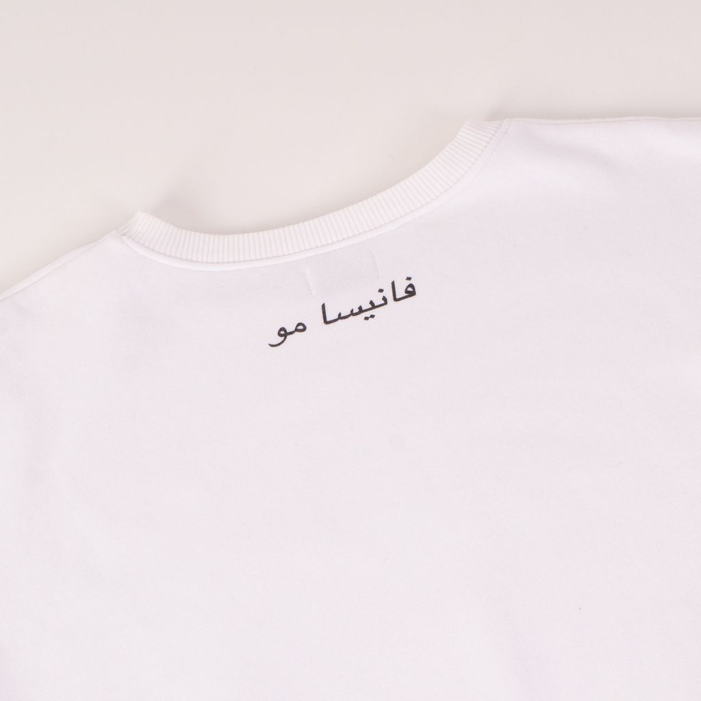This low key piece from Vanessa Moe is all about attention to detail with its stark white color and razor sharp back graphic. Features rib knit waist band, cuffs, and neck as well as Vanessa Moe Arabic back script.