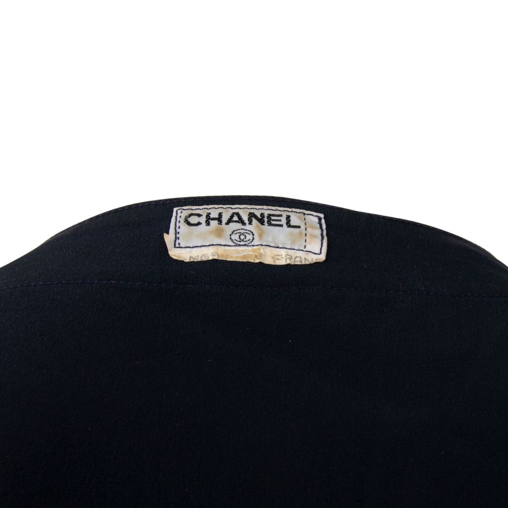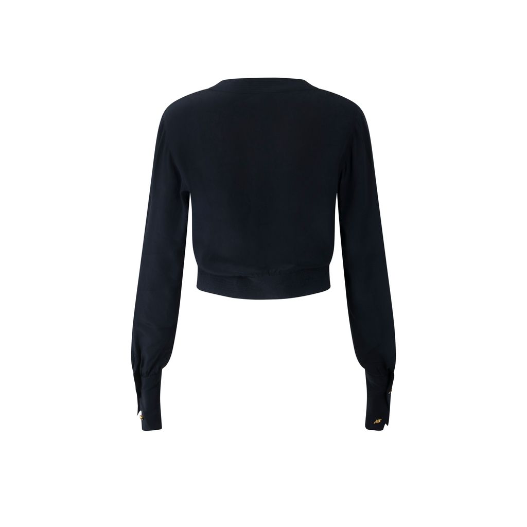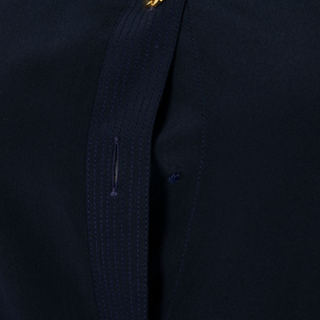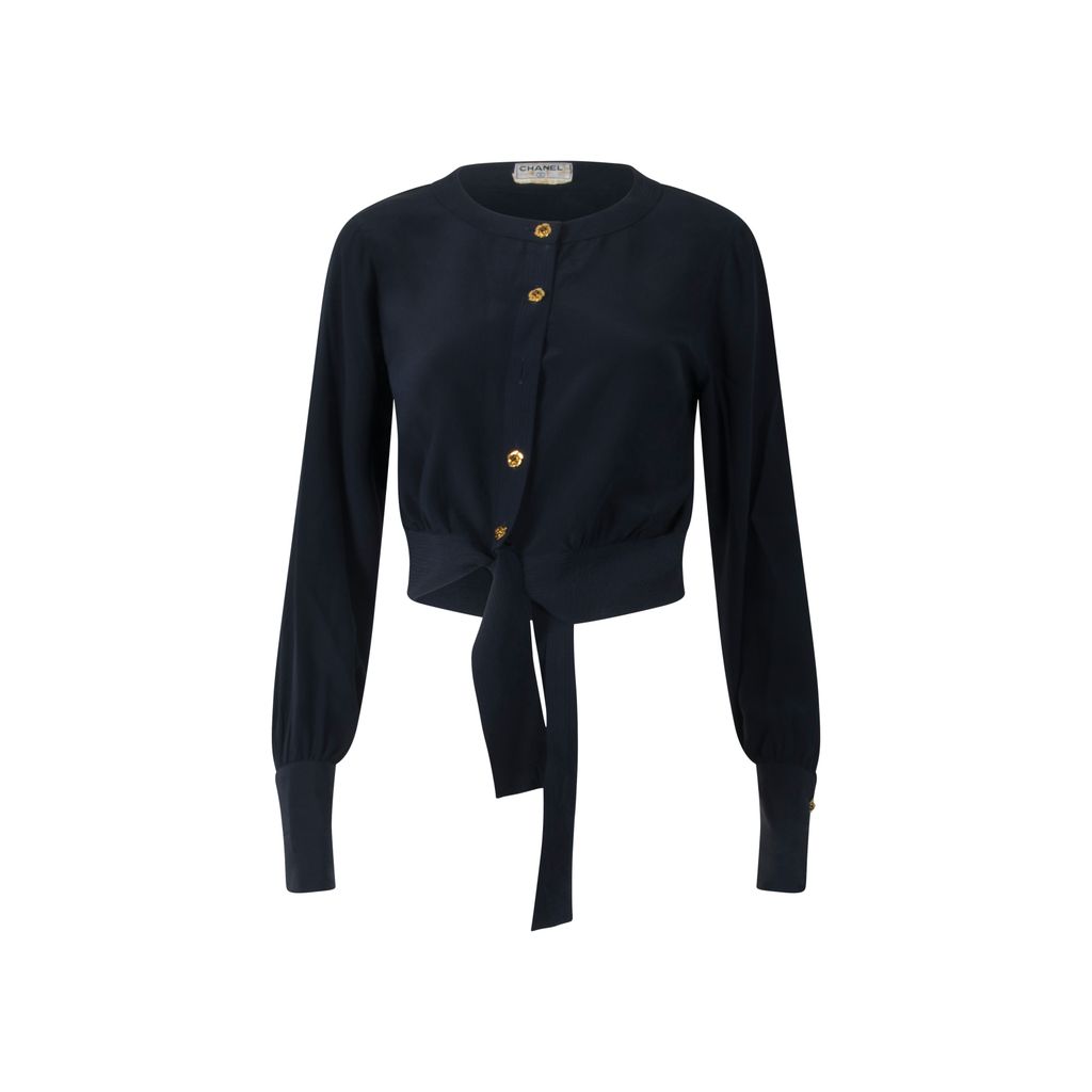 This vintage navy blouse from Chanel features a front button down closure with gold floral shaped buttons, a round neckline, long sleeves, buttoned cuffs and a banded hemline with a self-tie waist. Gently worn in good vintage condition. Floral button is missing in the center, buttons are slightly loose from age and wear. Marks as pictured.