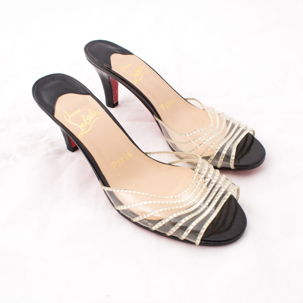 Vintage Christian Louboutin open toe heel featuring the classic red bottom and decorative accents, gently worn.