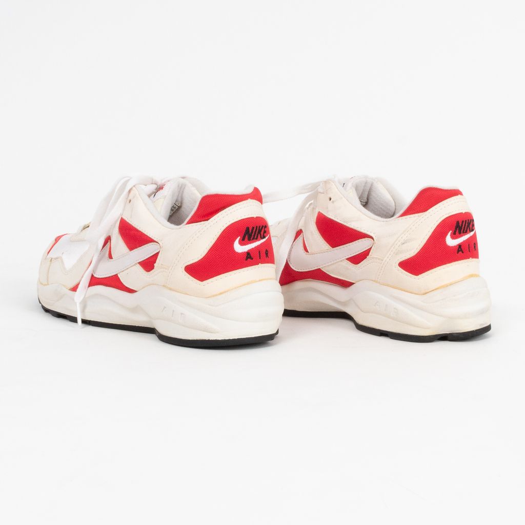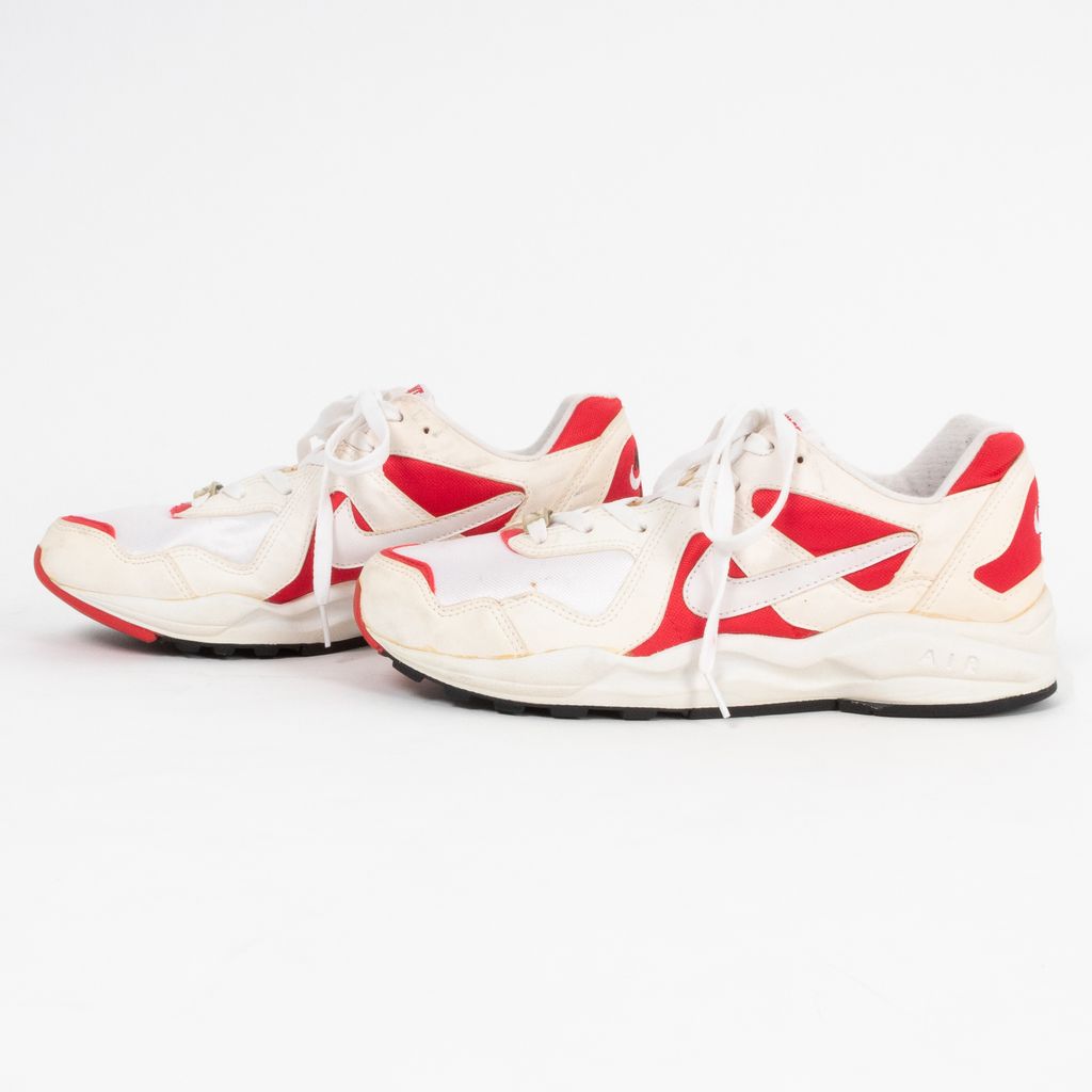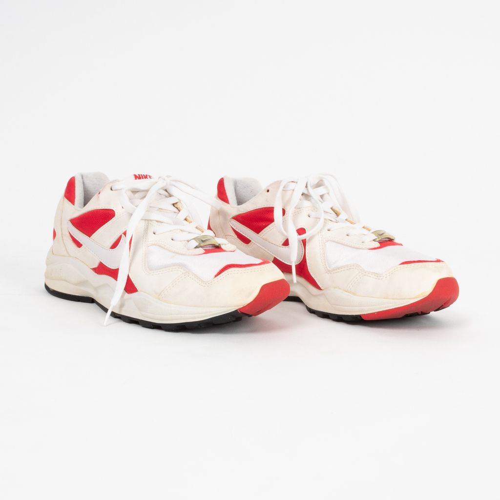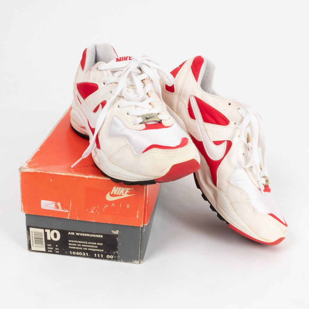 A deadstock Nike find, these 1994 Air Windrunners are a throwback design that still looks fresh today. Features multi-fabricated body, bronze Nike lace cover, leather Nike Swoosh logos on shoe sides, Nike Air embroidery on back heels, and signs of wear. Signs of wear include color transfer all around shoe neck as well as other staining as photographed.