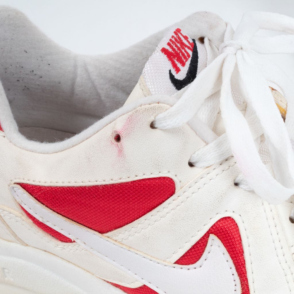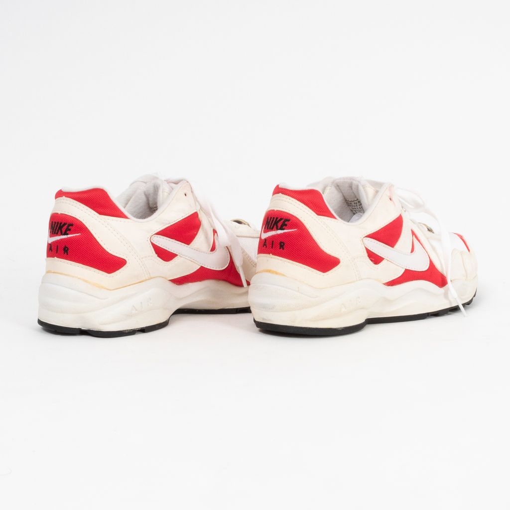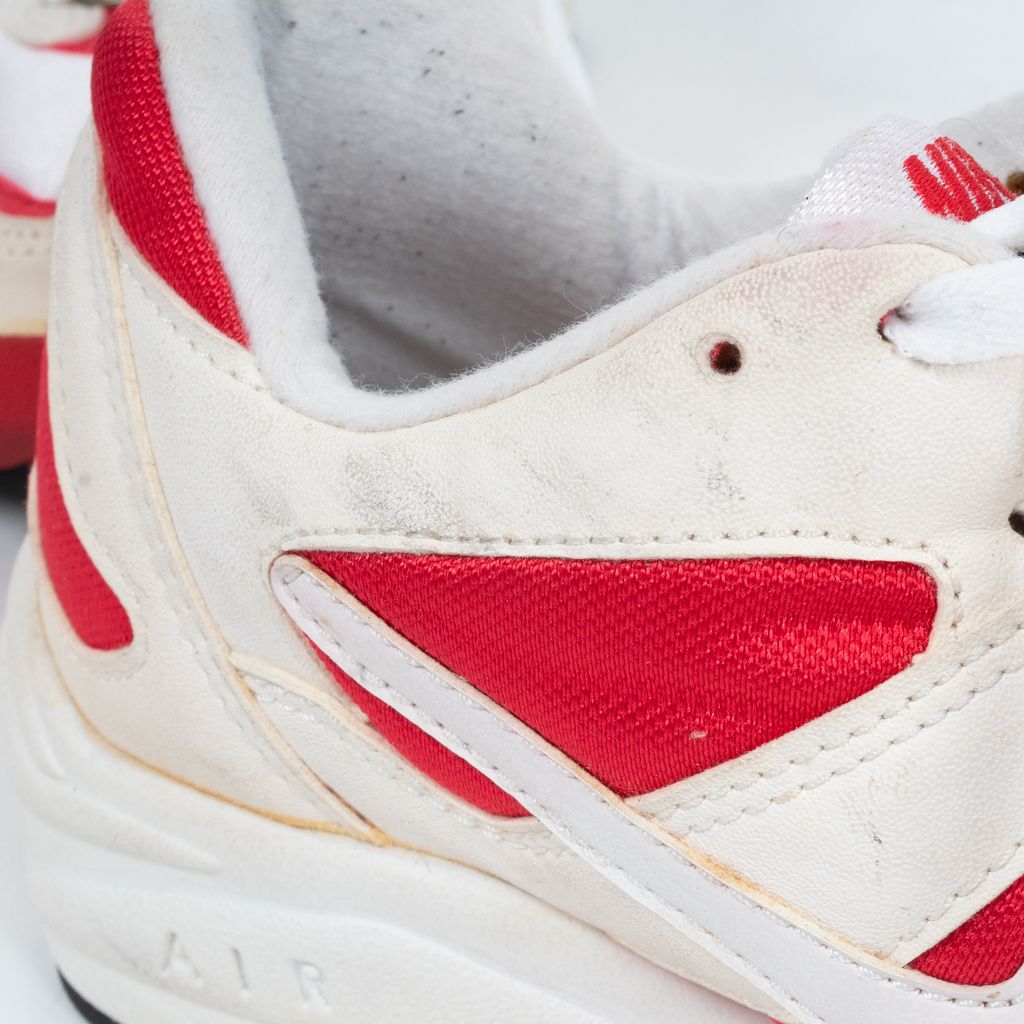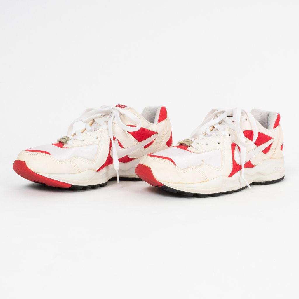 A deadstock Nike find, these 1994 Air Windrunners are a throwback design that still looks fresh today. Features multi-fabricated body, bronze Nike lace cover, leather Nike Swoosh logos on shoe sides, Nike Air embroidery on back heels, and signs of wear. Signs of wear include color transfer all around shoe neck as well as other staining as photographed.
