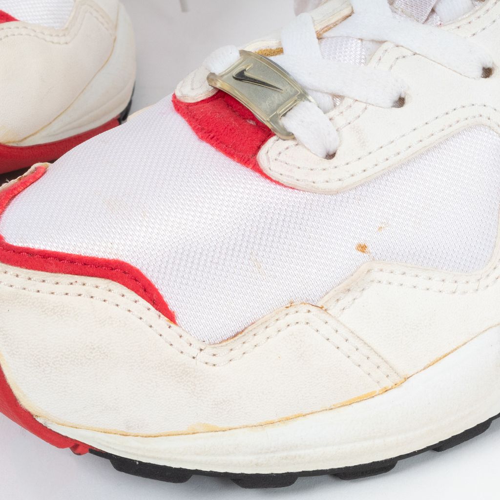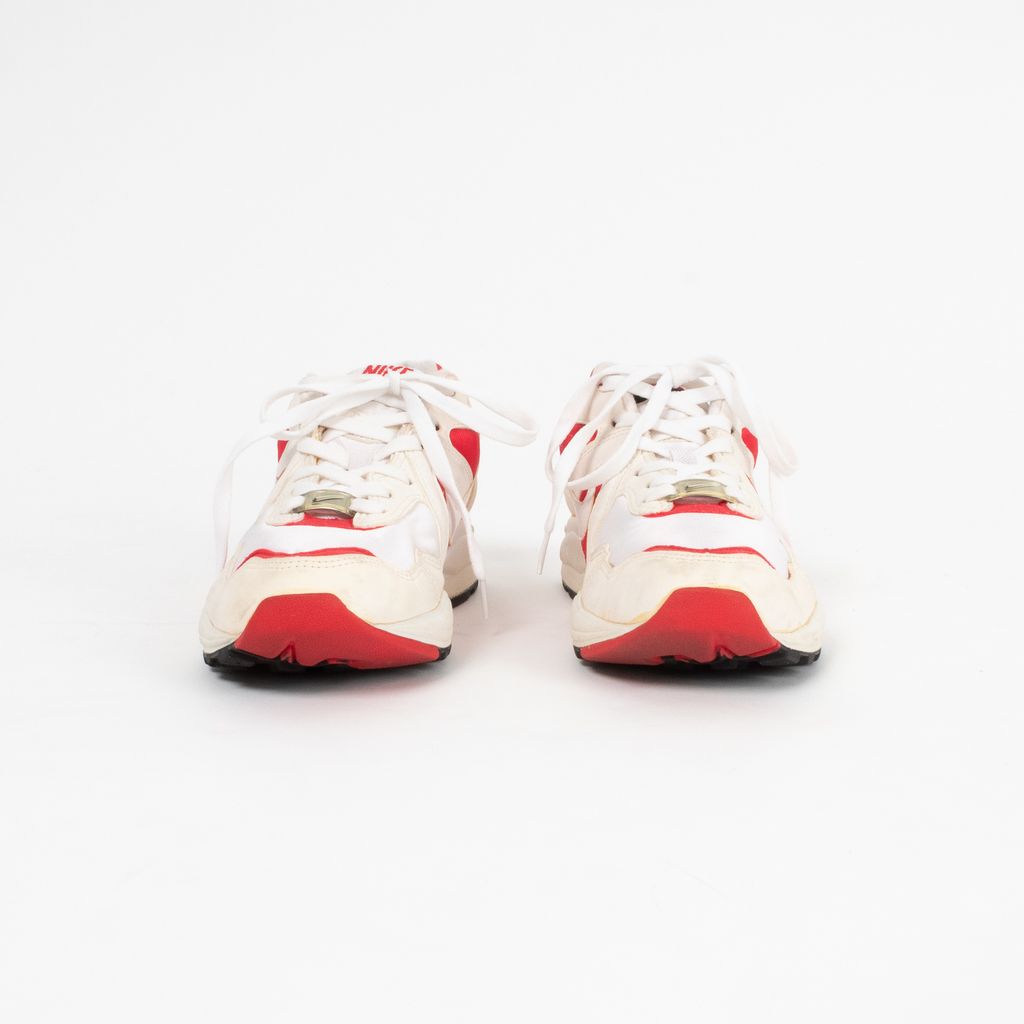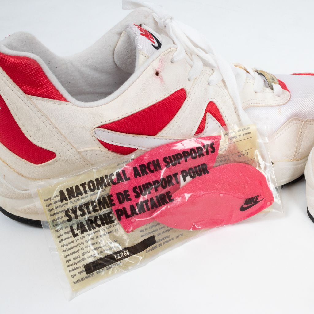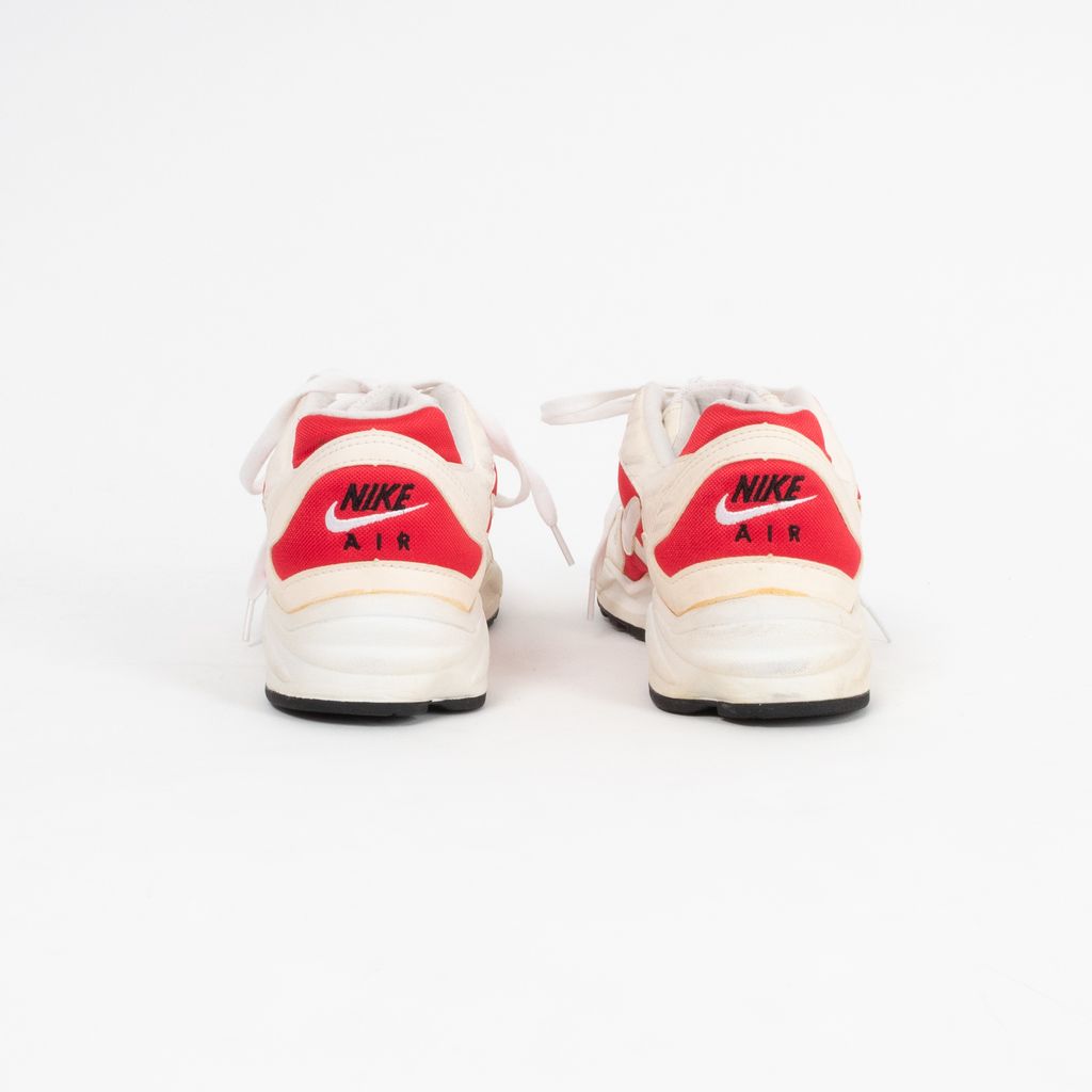 A deadstock Nike find, these 1994 Air Windrunners are a throwback design that still looks fresh today. Features multi-fabricated body, bronze Nike lace cover, leather Nike Swoosh logos on shoe sides, Nike Air embroidery on back heels, and signs of wear. Signs of wear include color transfer all around shoe neck as well as other staining as photographed.