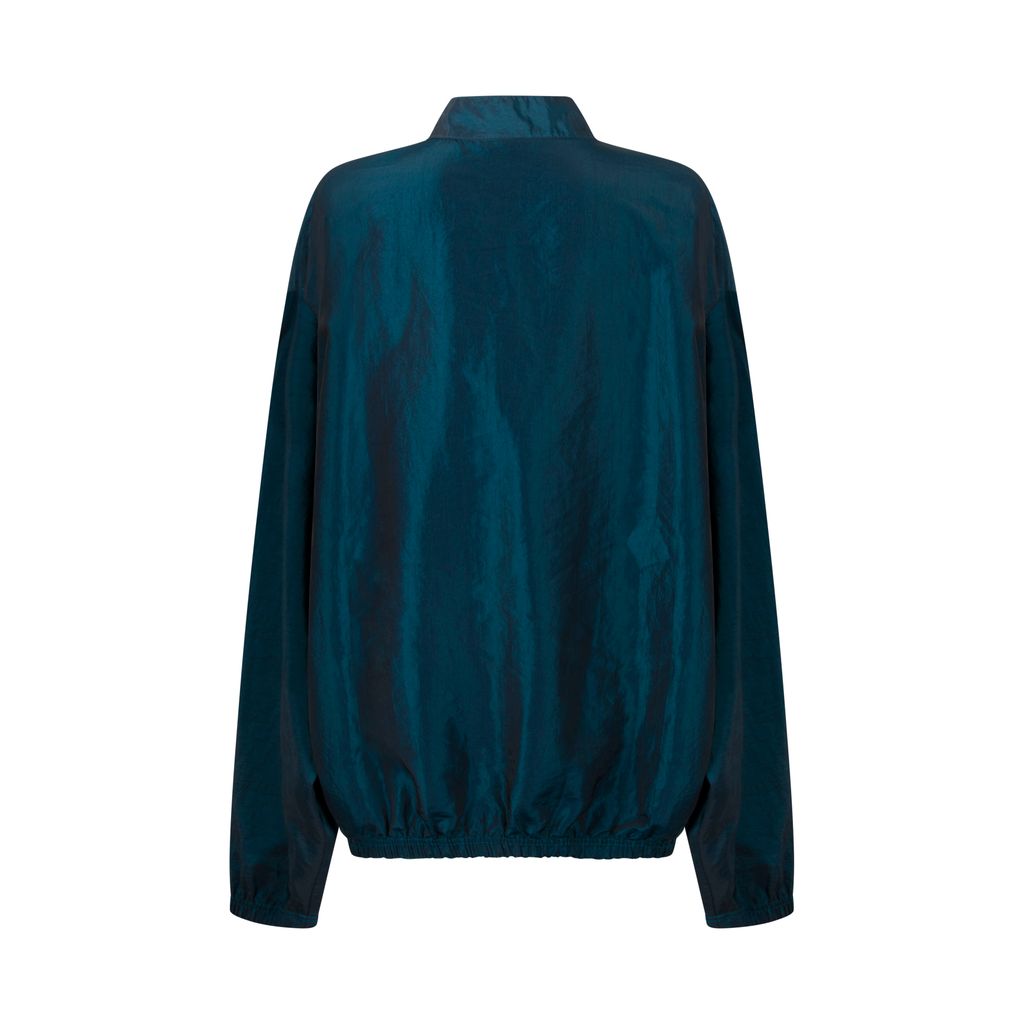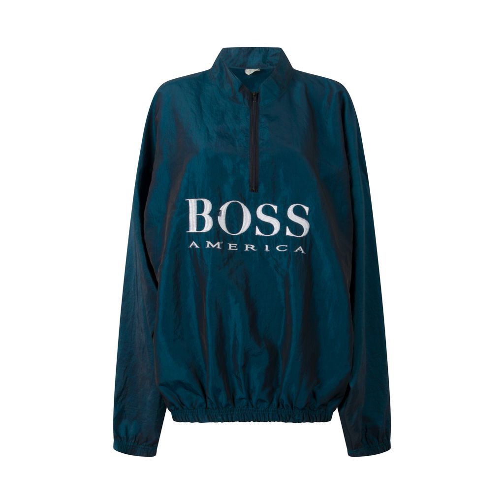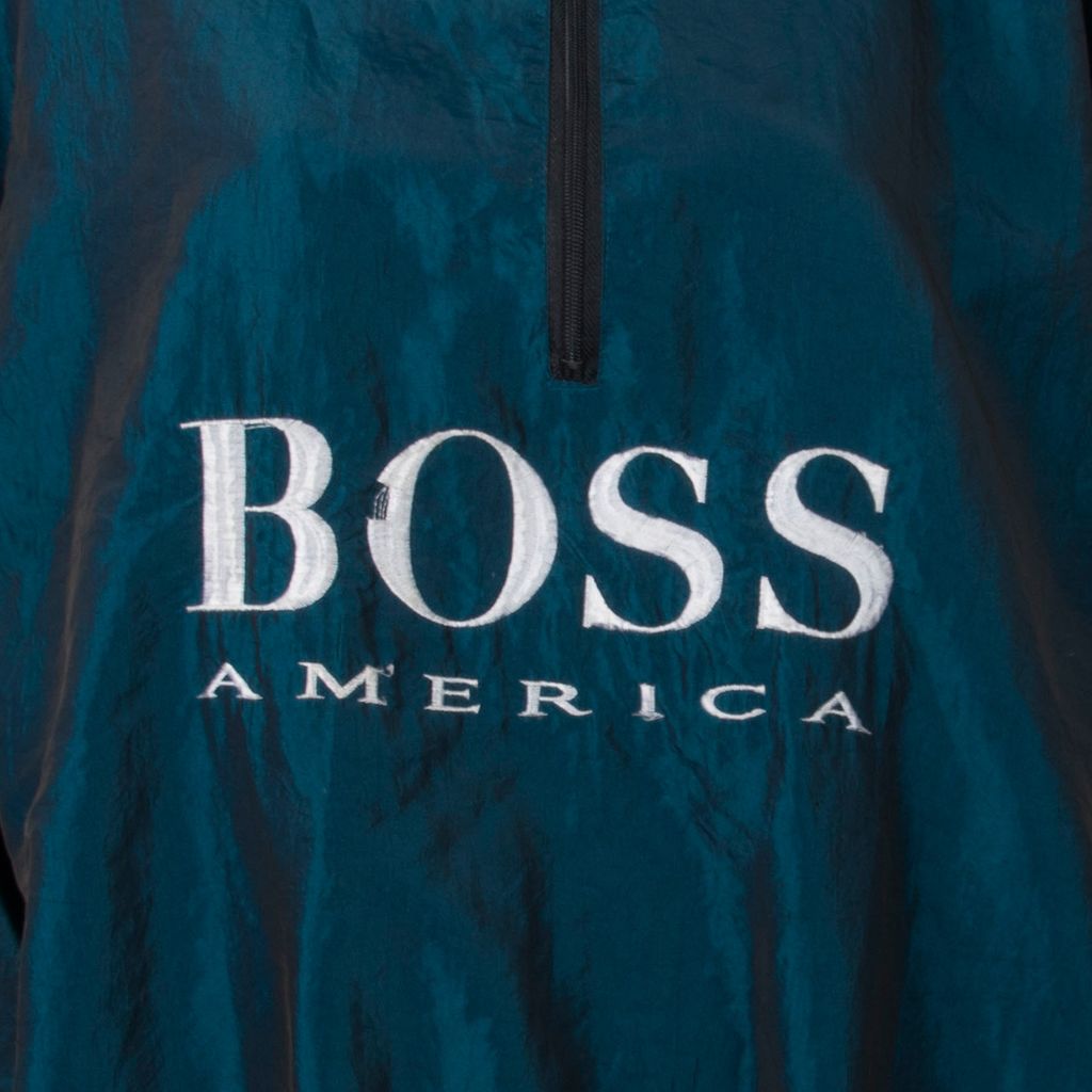 This lightweight iridescent classic windbreaker from Hugo Boss features a large embroidered front logo, a half-zip front closure, high neckline, and elastic stretch cuffs and hemline. In good vintage condition, front logo embroidery is frayed and slightly stained.