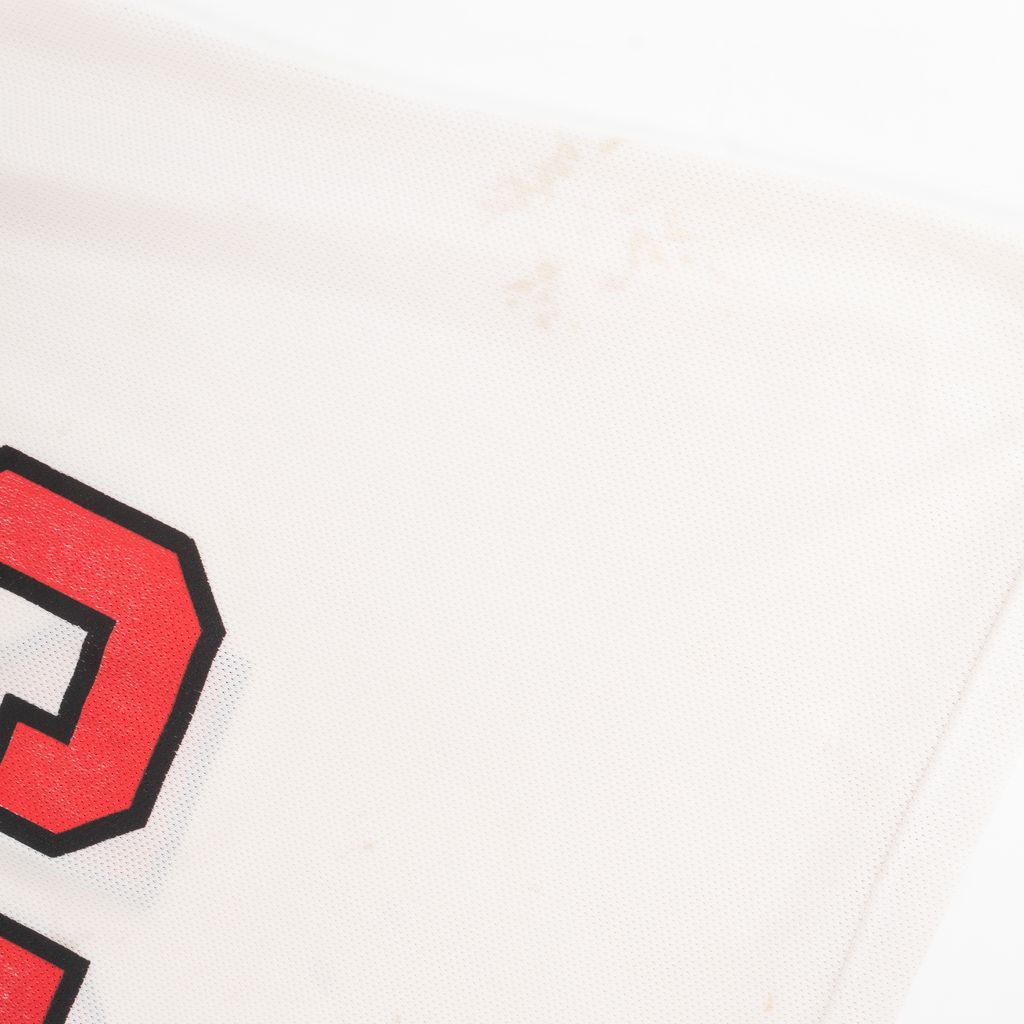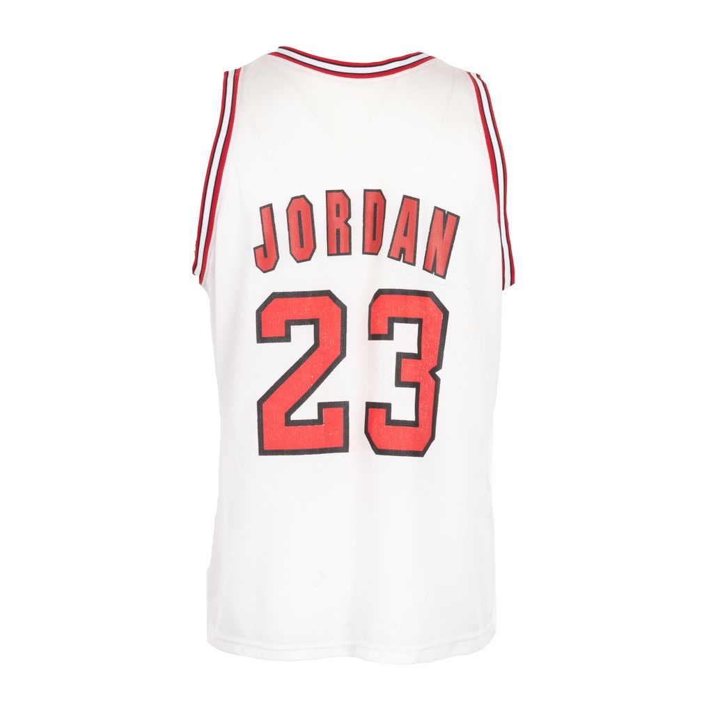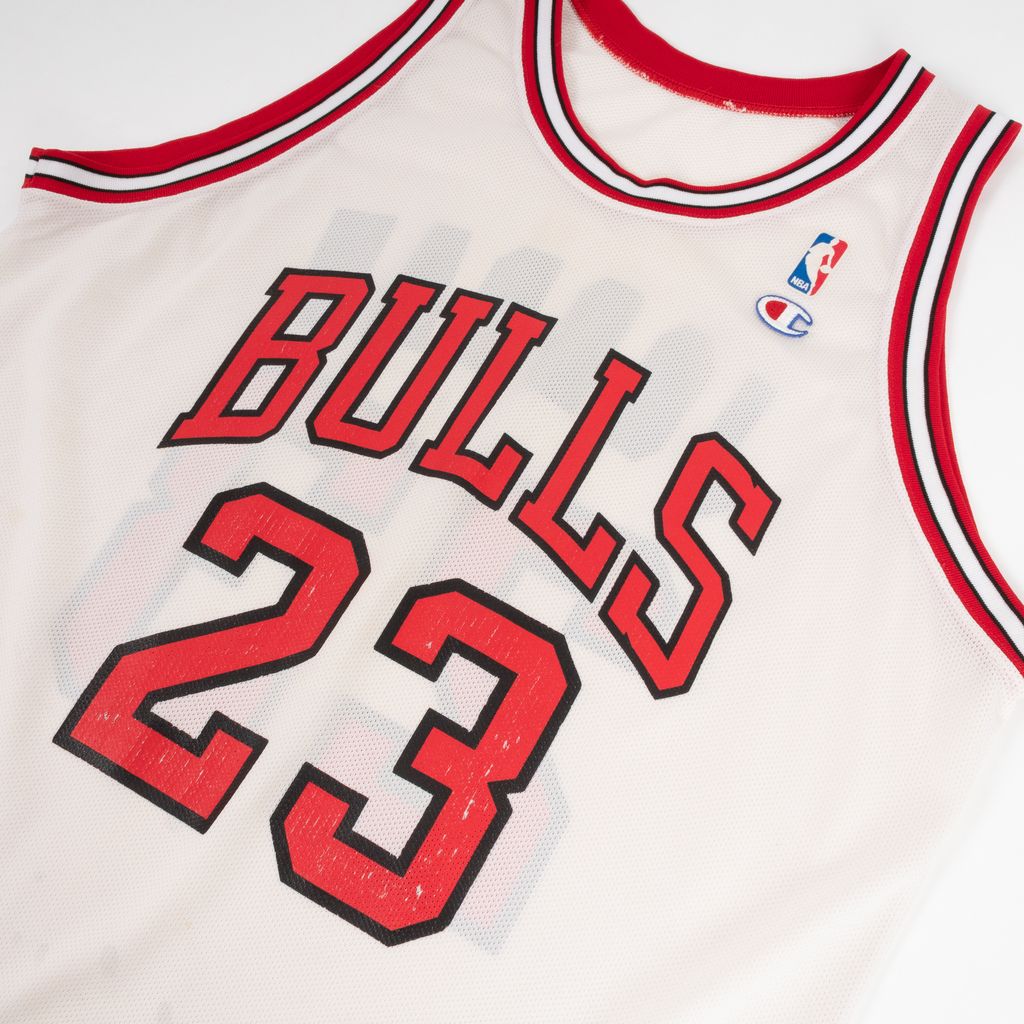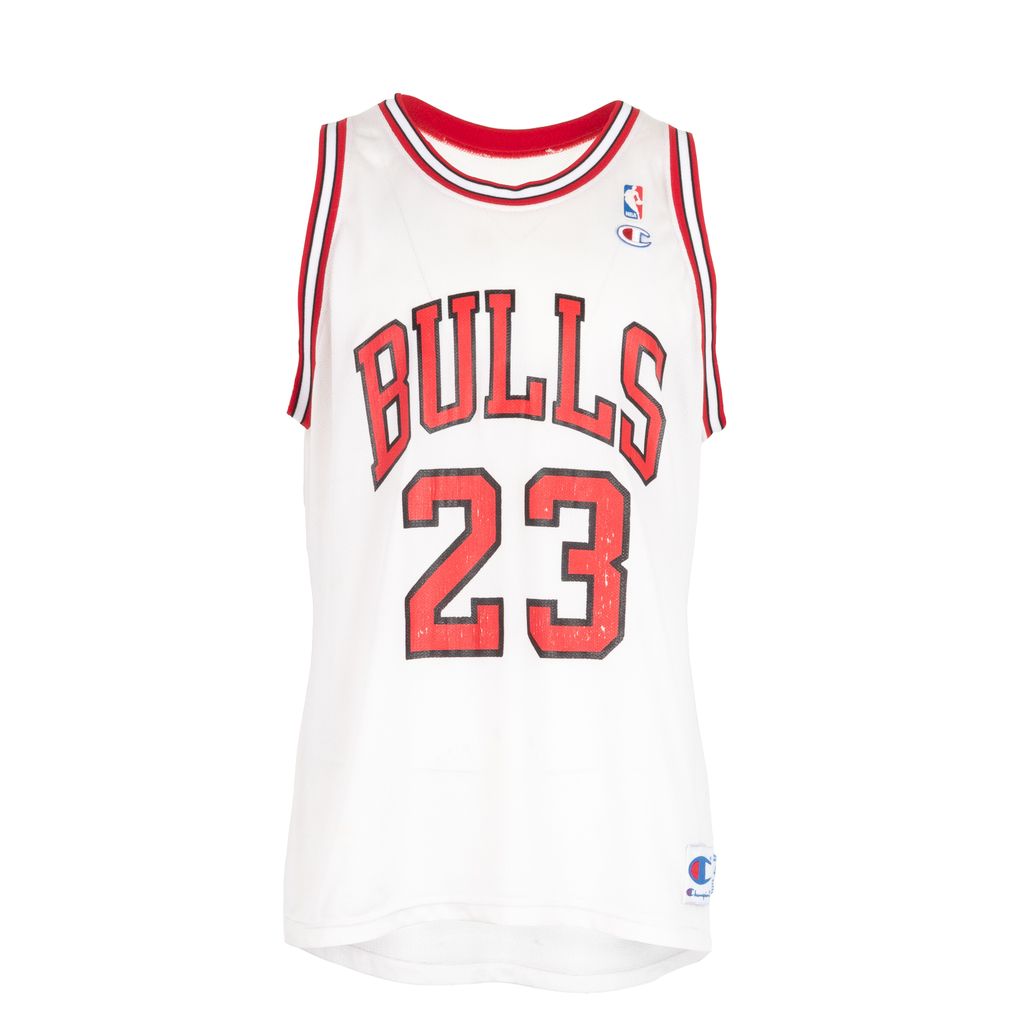 Celebrate the original GOAT Mr. 23 himself, Michael Jordan in this aged to perfection Chicago Bulls champion jersey. Features Bulls logo and number 23 chest graphic, NBA and Champion embroidered logo patches on left side of chest, ringer stripes at neck and arms, Jordan name and number graphic on back, and signs of wear throughout. Features fading on graphics, staining throughout, and stitching to repair a hole as photographed.