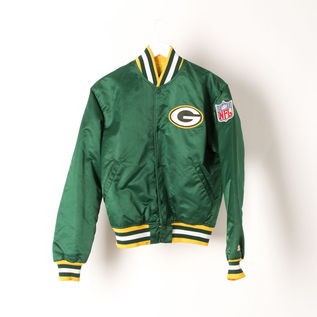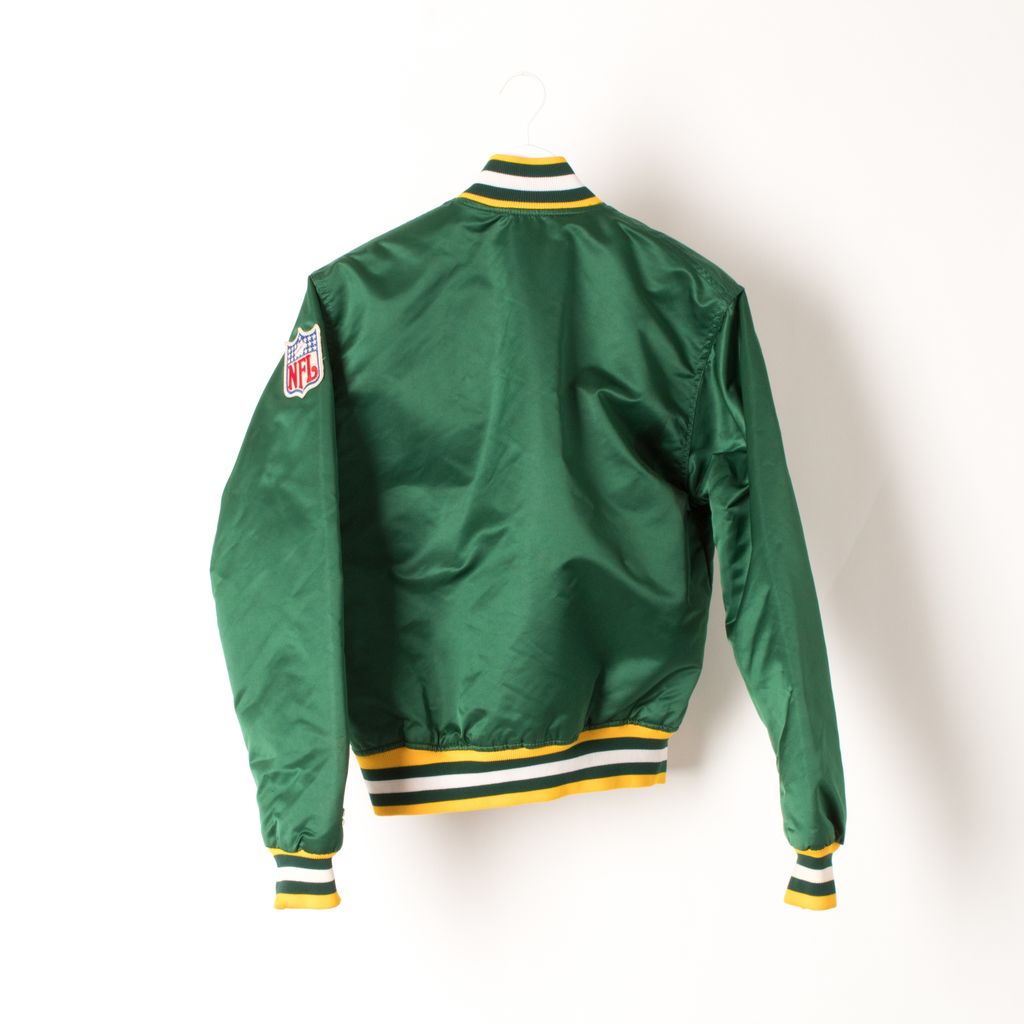 Authentic vintage Green Bay Packers starter jacket. The long sleeve jacket has snap enclosures, gathered fabric at the waist and wrists, front pockets and embroidered logos on chest and sleeves to get the word out about your team loyalty.