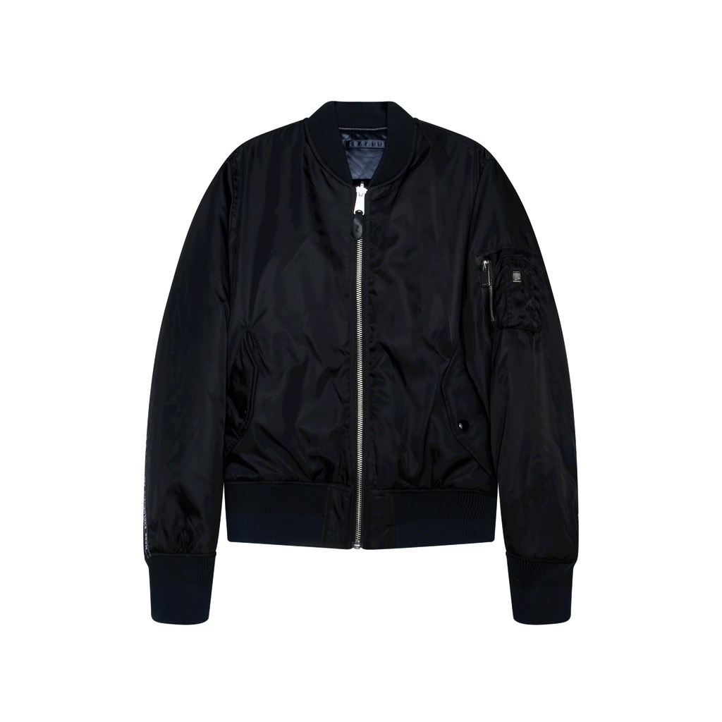 1017 ALYX 9SM Reversible Bomber Jacket features front zip closure, two front pockets, two inner pockets, 100% nylon, black exterior, navy interior, left sleeve zipper pocket, ribbed cuffs, and ribbed hem.