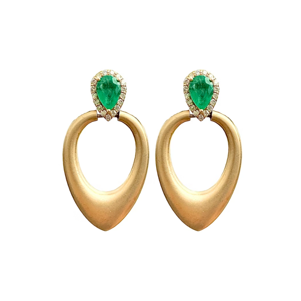 Crafted in 14k brushed yellow gold , these elegant earrings feature pear-cut emeralds framed by a diamond halo. Each emerald measures 4.9mm by 6.6mm , showcasing a rich green hue , accented by sparkling diamonds. The earrings measure 1.4” long by 0.8” wide and have a comfortable post and butterfly back closure. The pair weighs 7.2 grams , making them a refined statement piece perfect for both everyday wear and special occasion.
