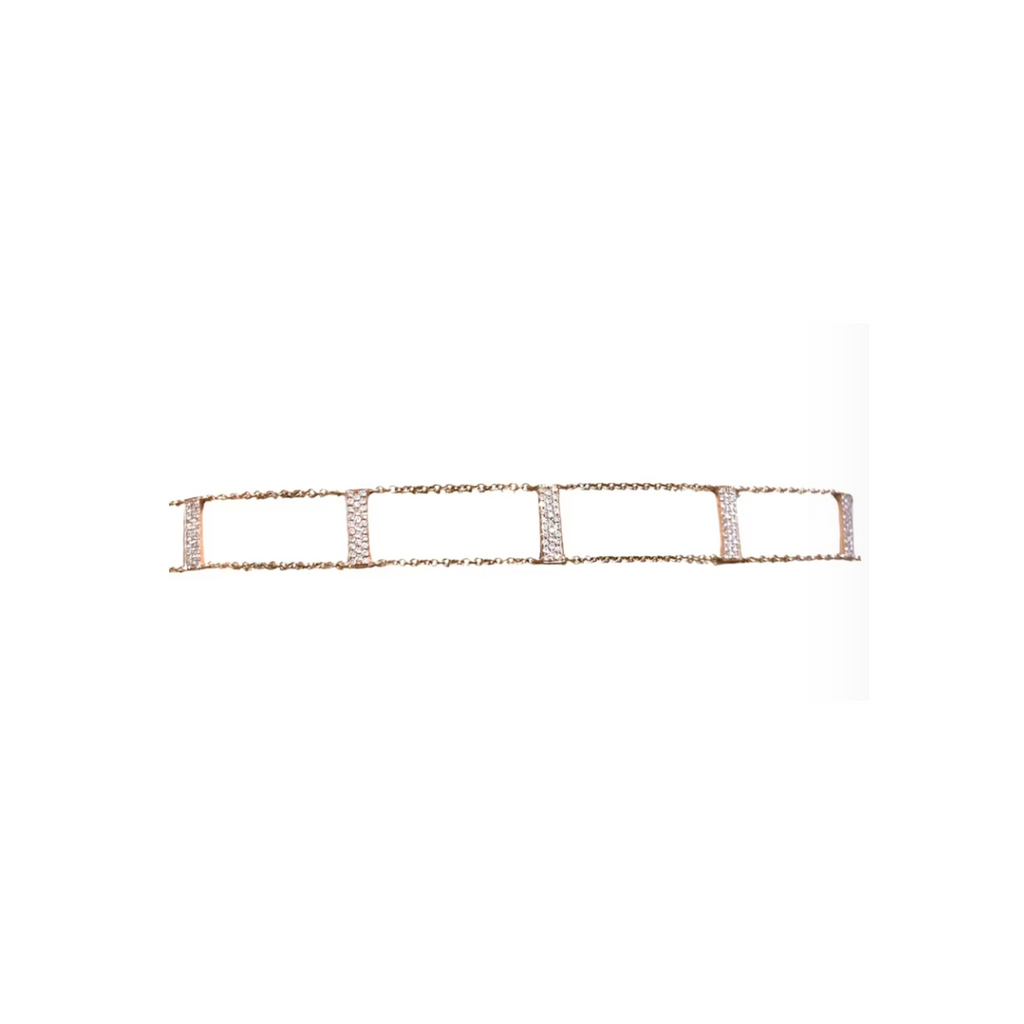 Pretty , edgy and feminine , this Shy Creation 14k solid Rose Gold and Pave Diamond Bar Choker Necklace features 11 páve diamond bars on an adjustable 12-14" choker length necklace with a lobster clasp closure.