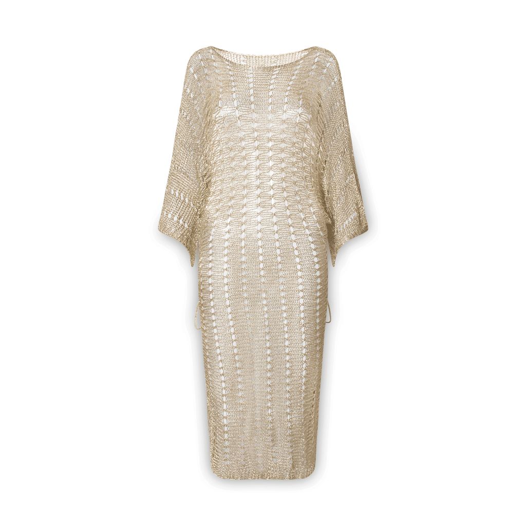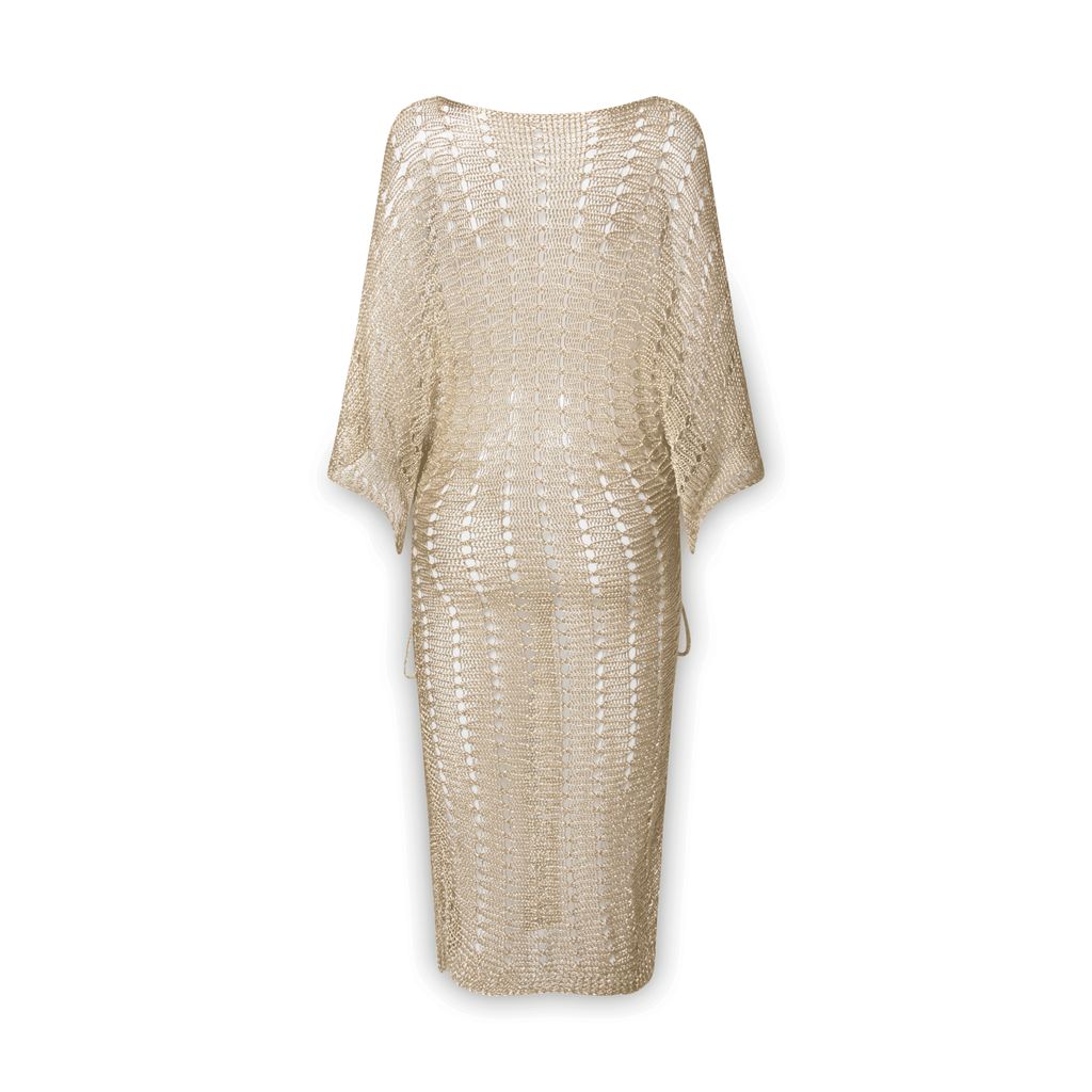 1970s Gold Lurex Knit Dress features metallic chain knit design and belt loops at the thighs.