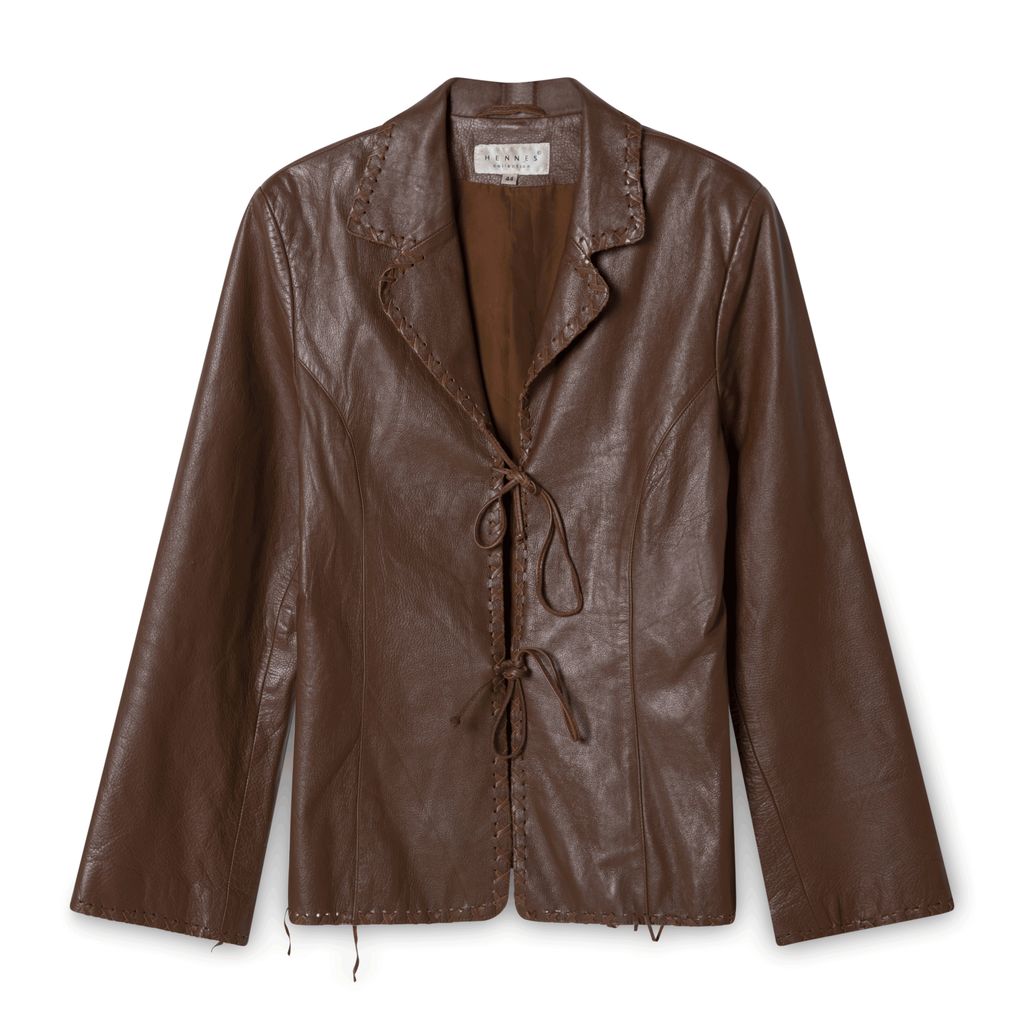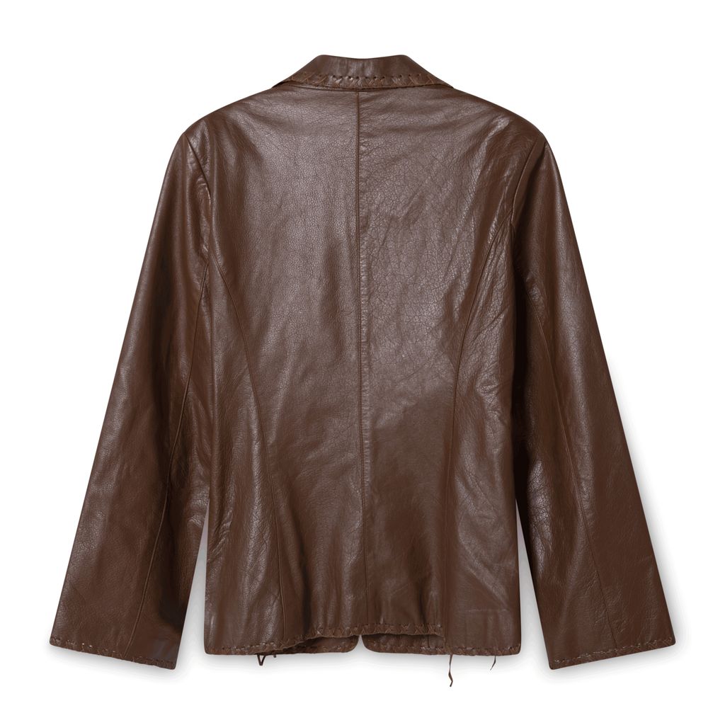 This brown blazer features a braided lapel, sleeve detailing, and a double-tied closure.