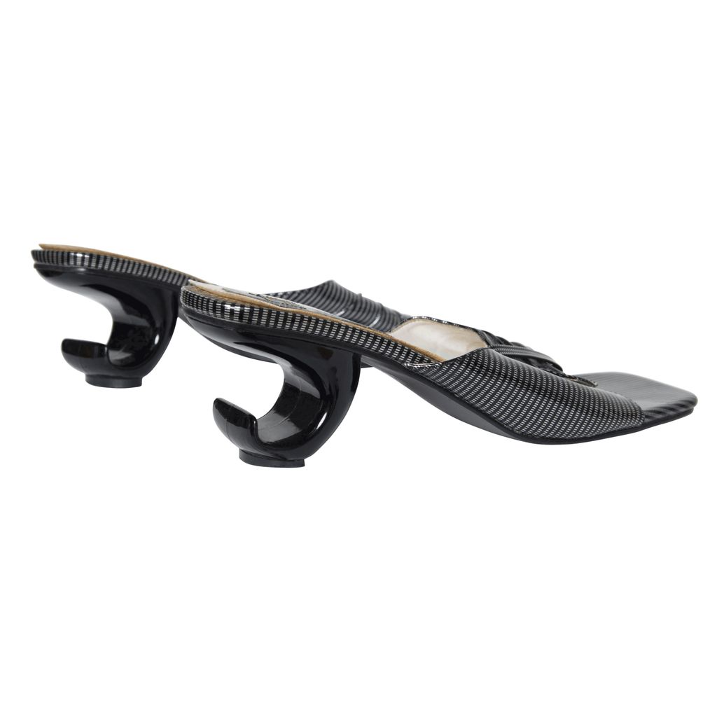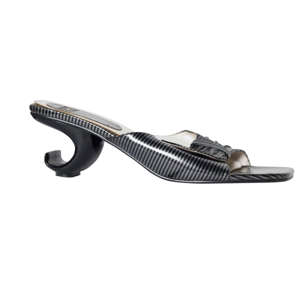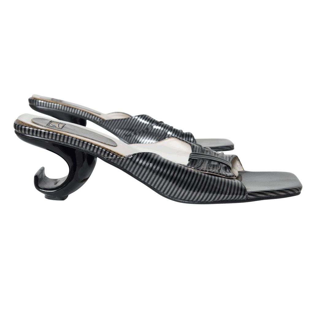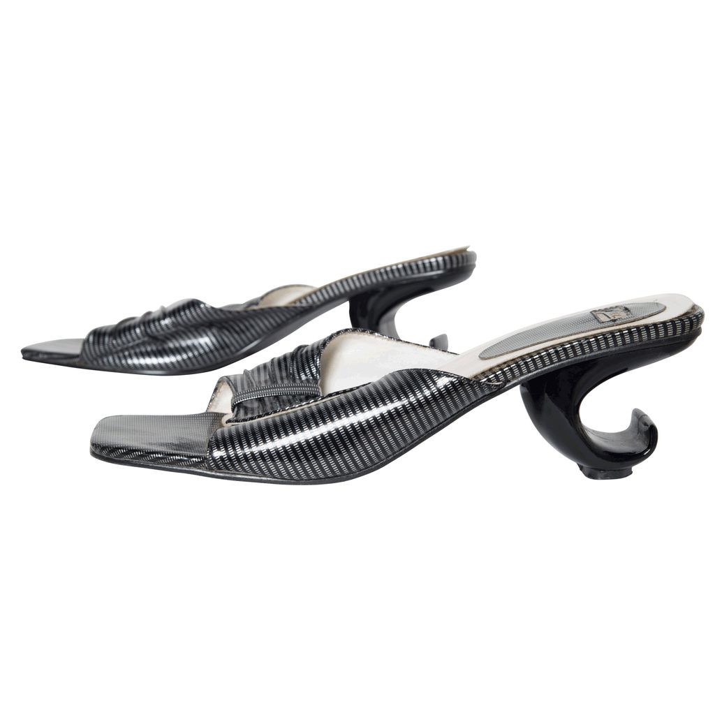 These unique mules feature a silver and black stripped pattern and a hooked heels.