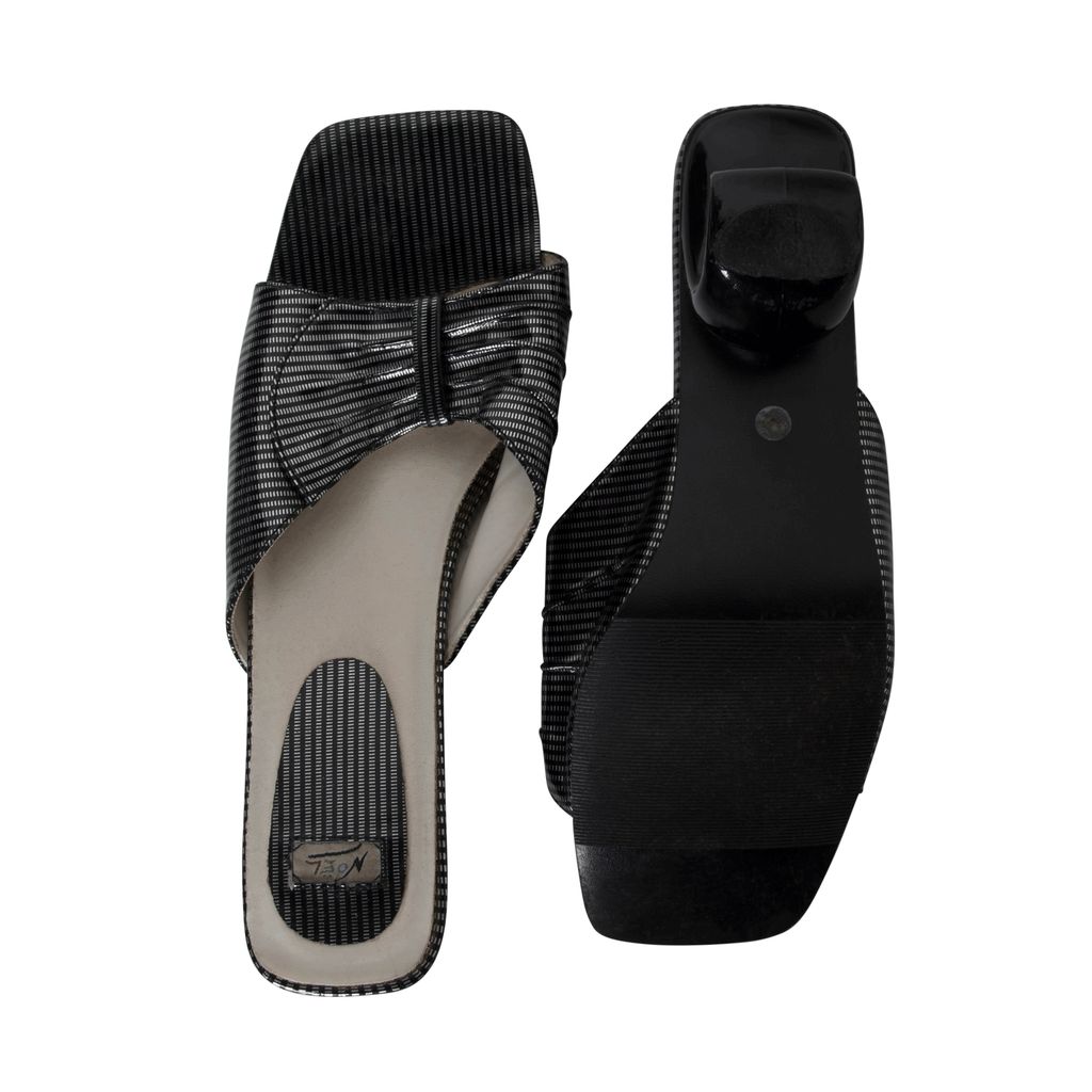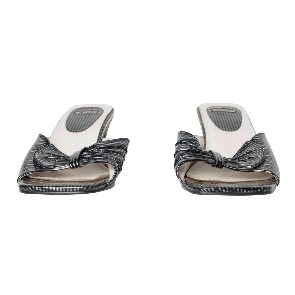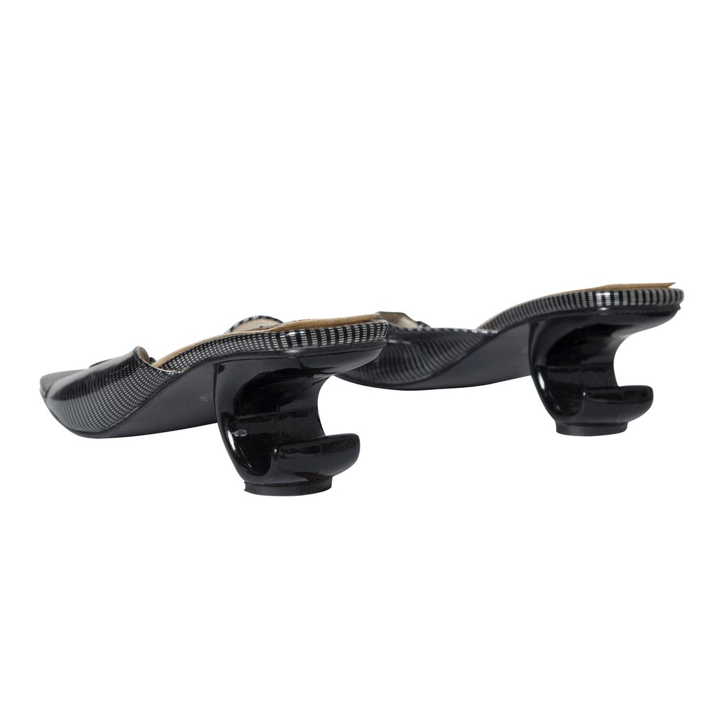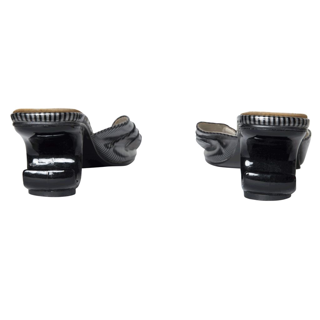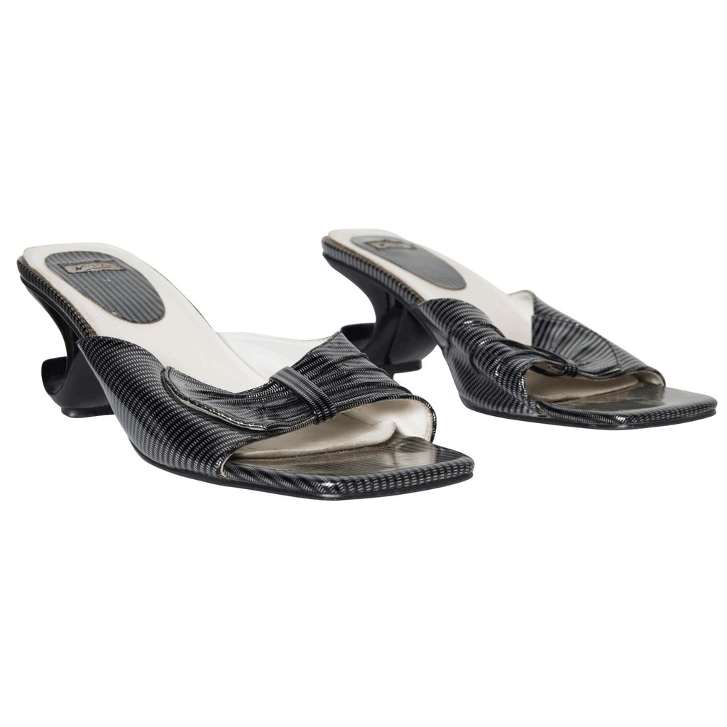 These unique mules feature a silver and black stripped pattern and a hooked heels.