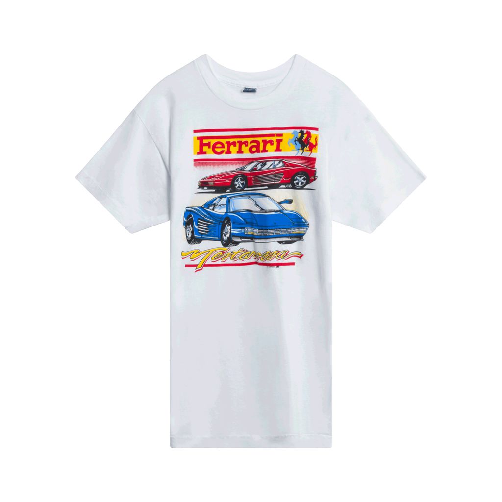 Vintage T-shirt features red and blue Ferrari graphics on chest