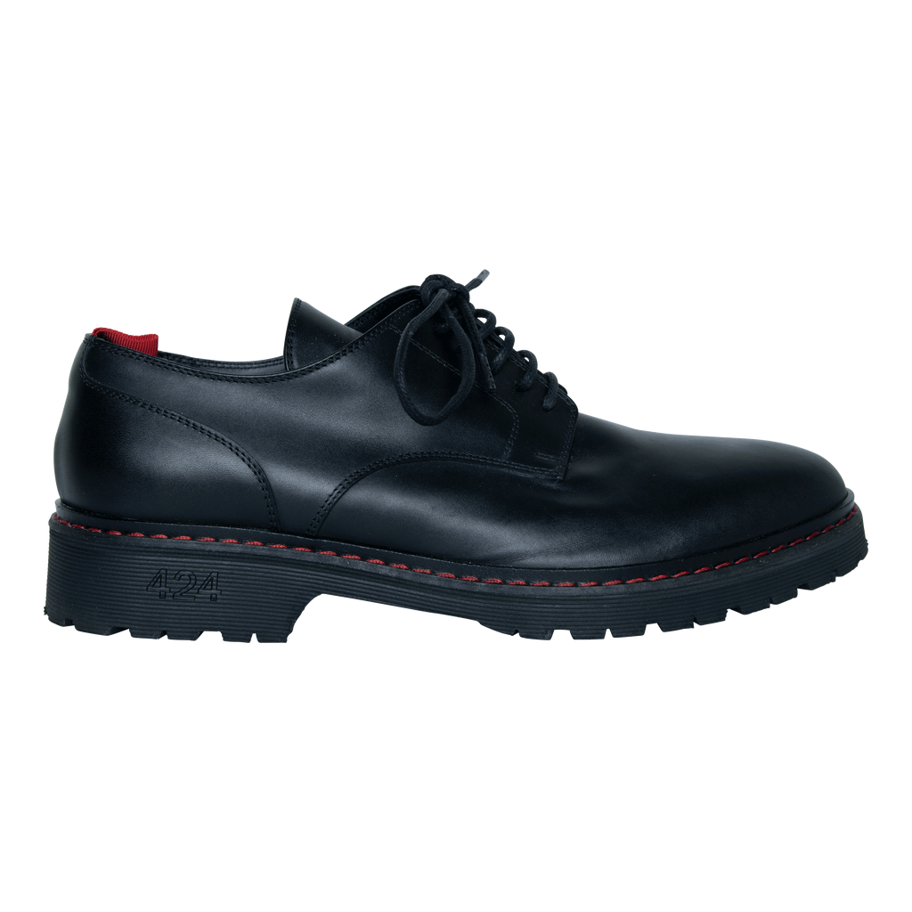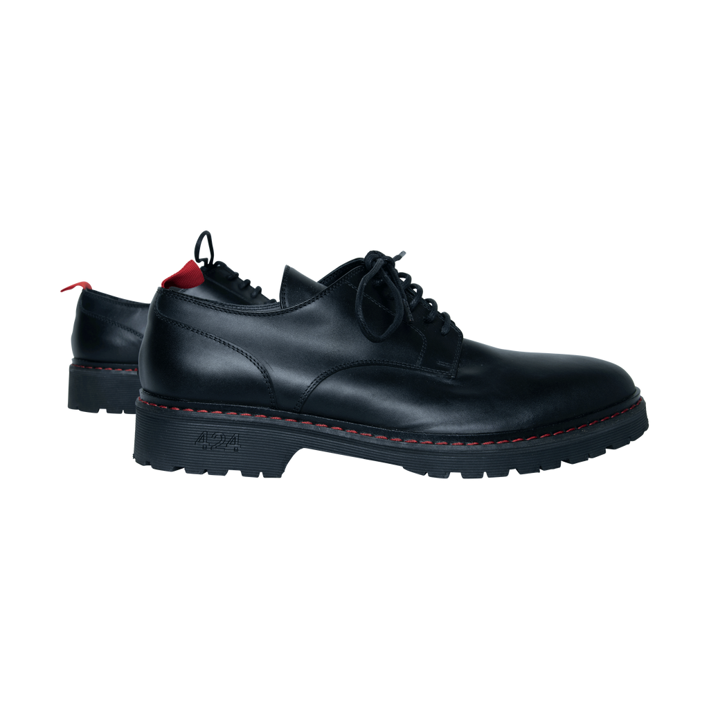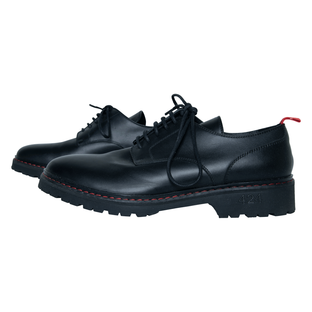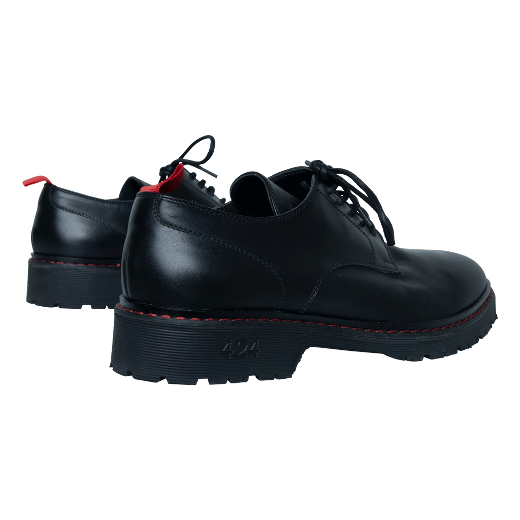 424 Black Contrast Stitch Derbys features round toe, tonal lace up closure, webbing pull tab in red at heel collar, contrast stitching in red at welt, logo embossed at tonal rubber midsole, and tonal treaded rubber outsole.