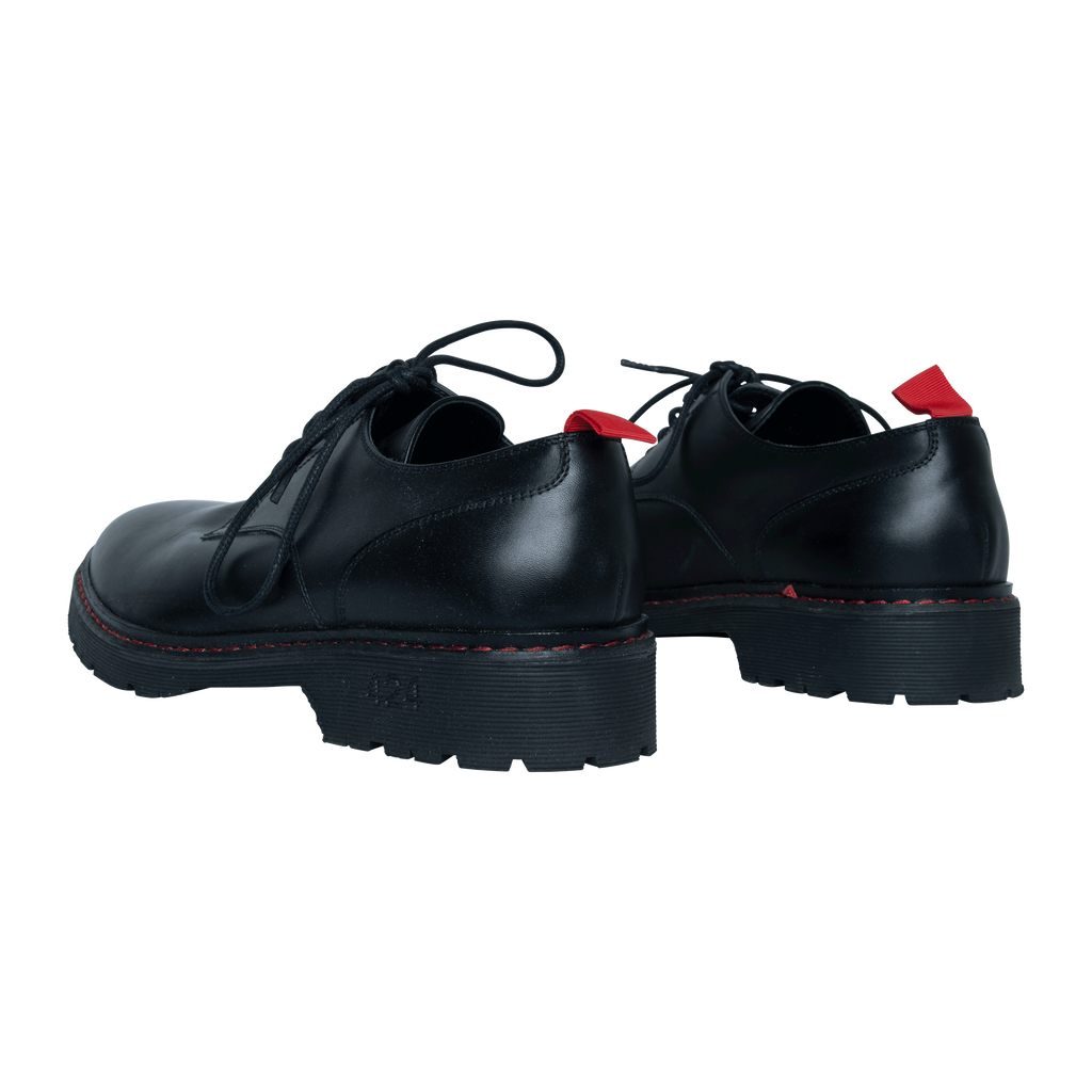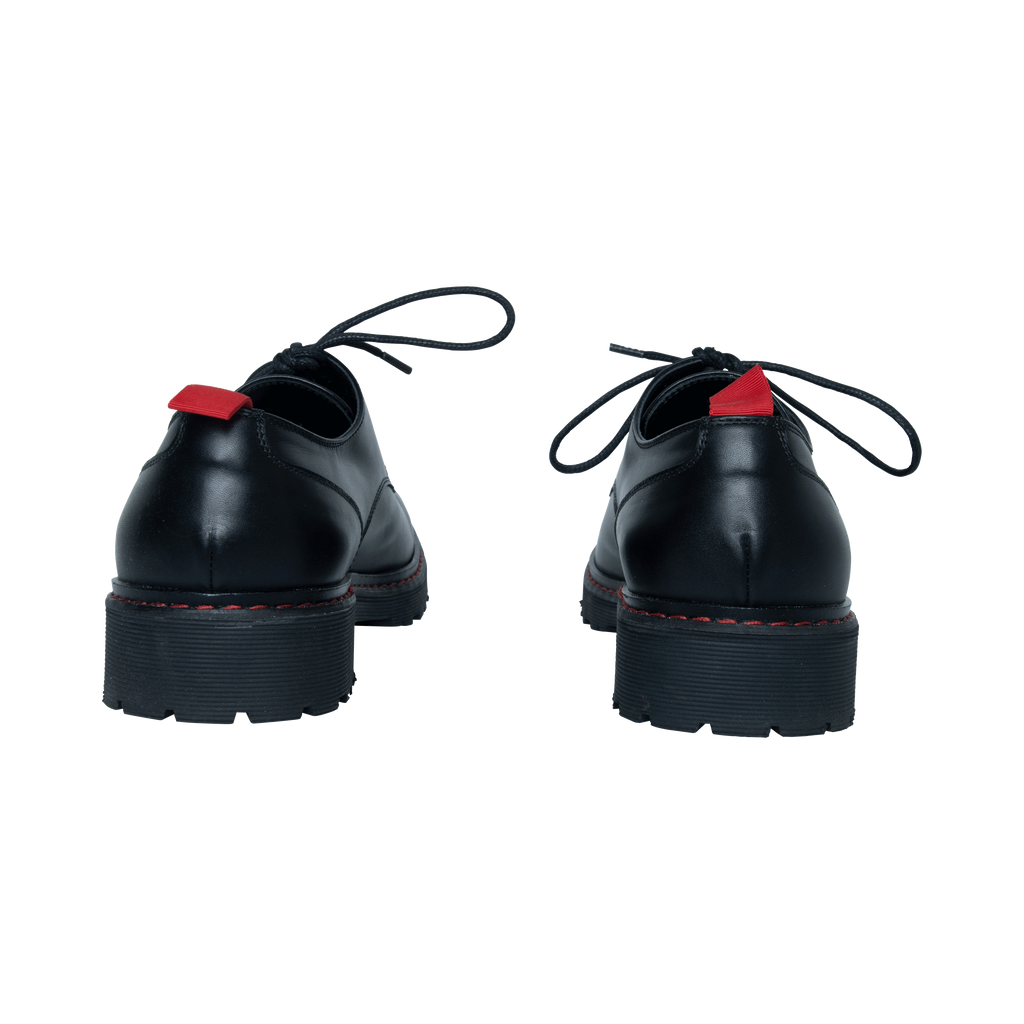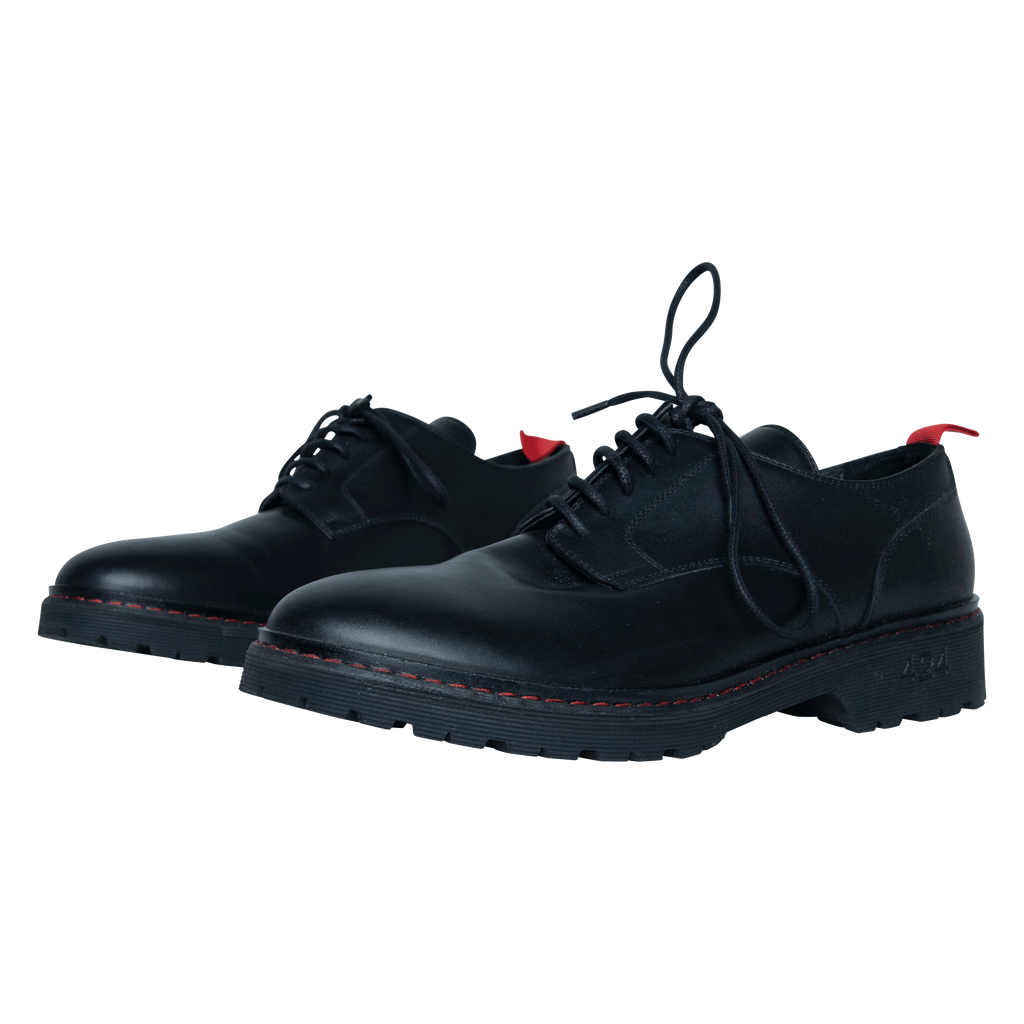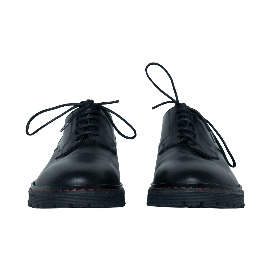 424 Black Contrast Stitch Derbys features round toe, tonal lace up closure, webbing pull tab in red at heel collar, contrast stitching in red at welt, logo embossed at tonal rubber midsole, and tonal treaded rubber outsole.