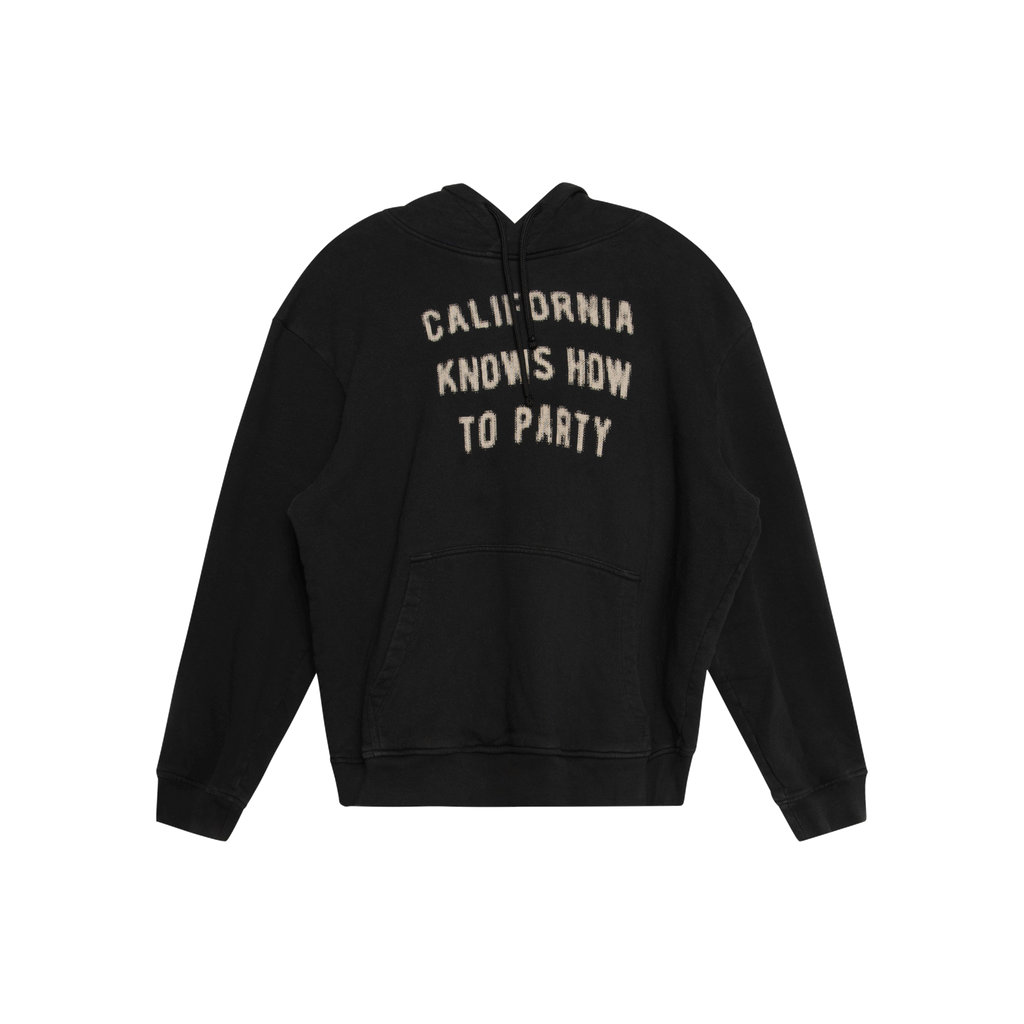 424 California Knows How to Party Hoodie features ribbed hems, hooded neckline, drawstring adjustment, and kangaroo pocket.