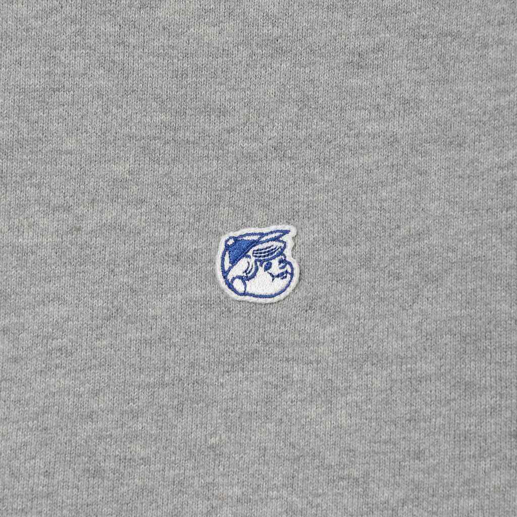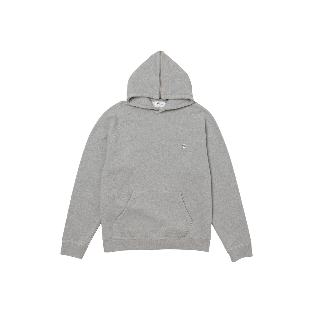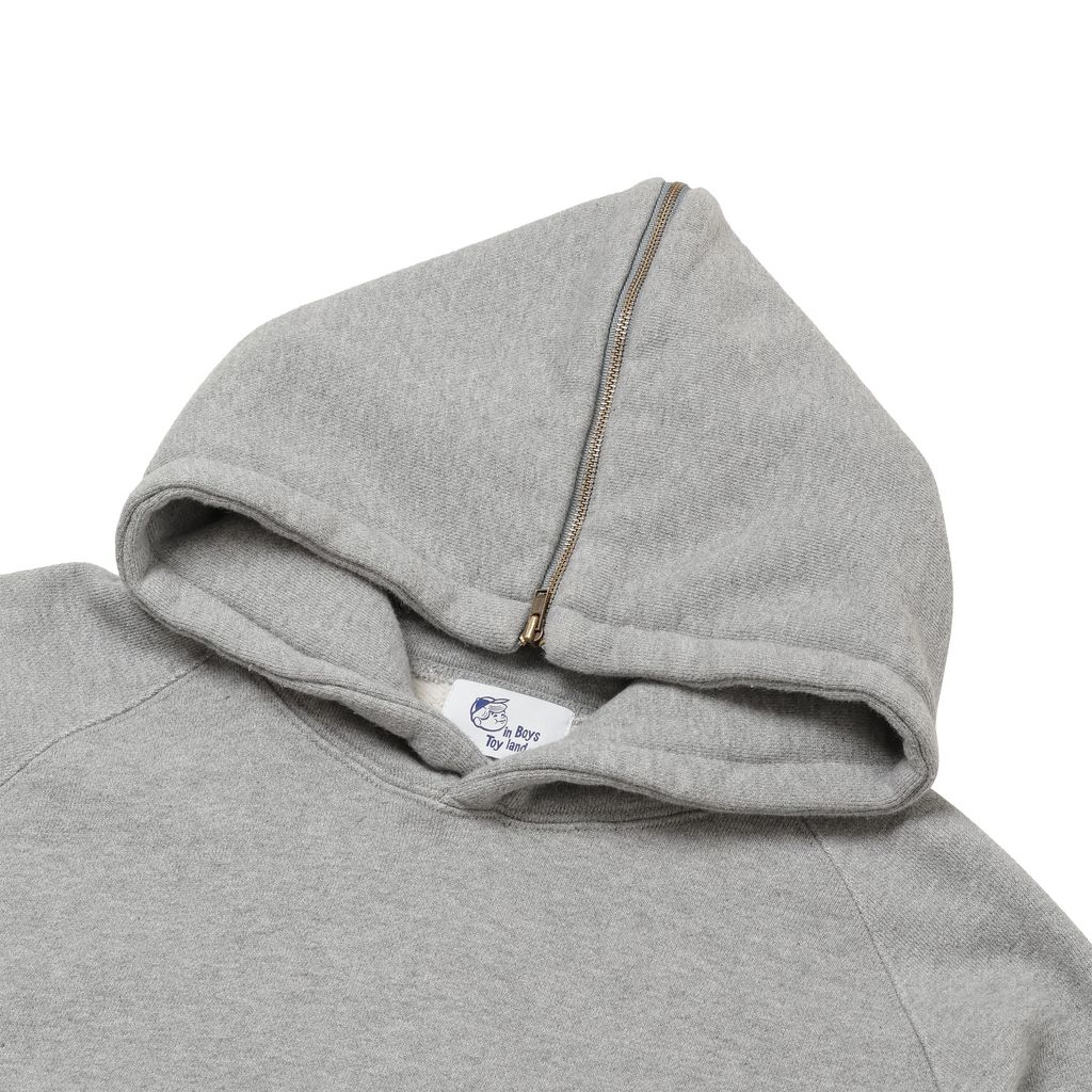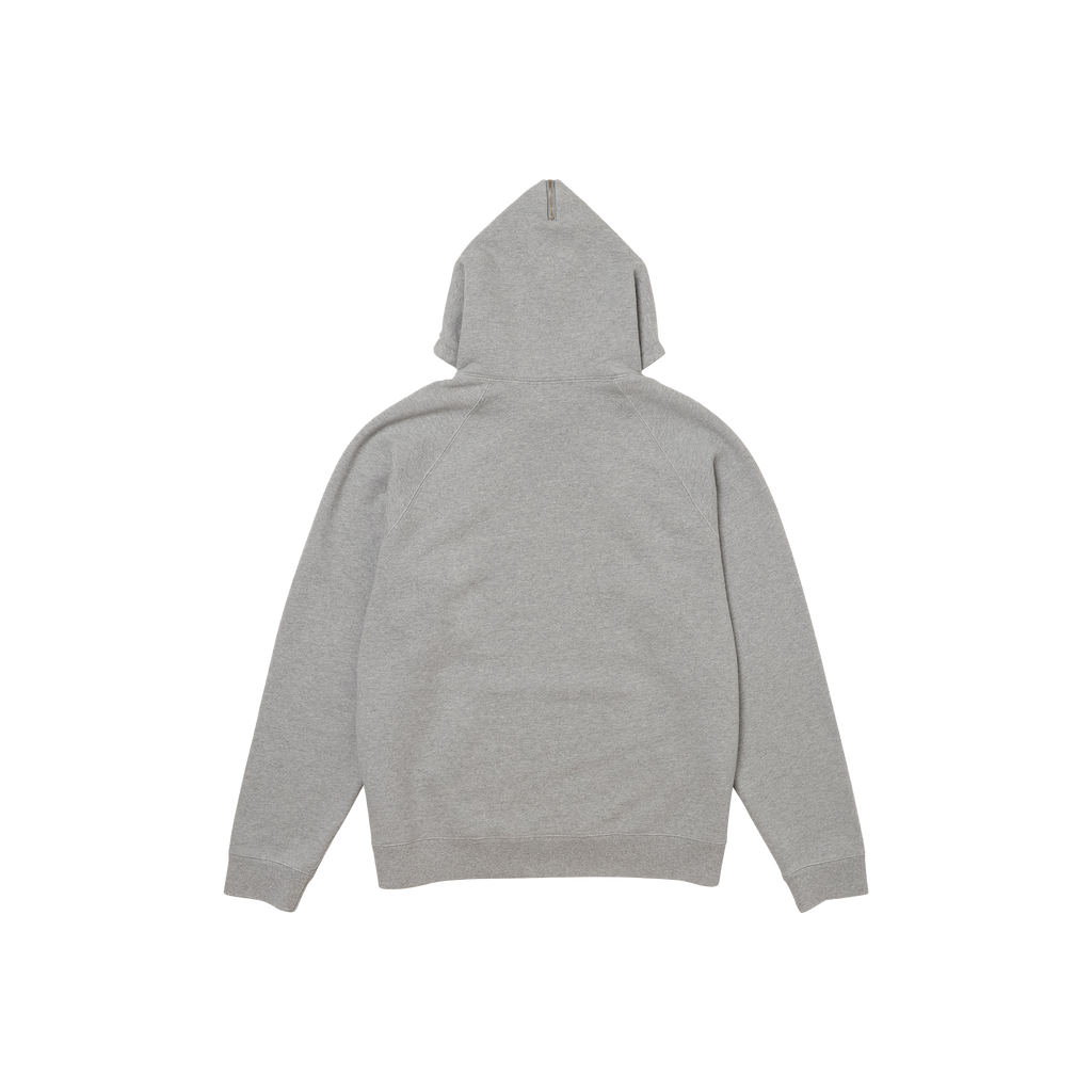 50's ZIP HOODIE - GREY features hooded sweatshirt design, zipper closure at the hood, woven logo patch on chest, and kangaroo pocket.