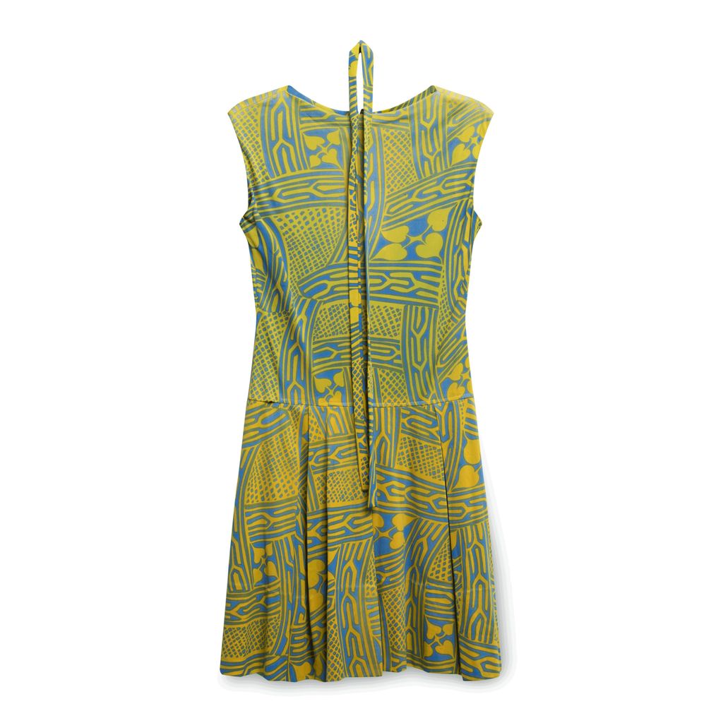 60s Bright Graphic Print Silk Dress features drop waist, zip closure, optional tie.
