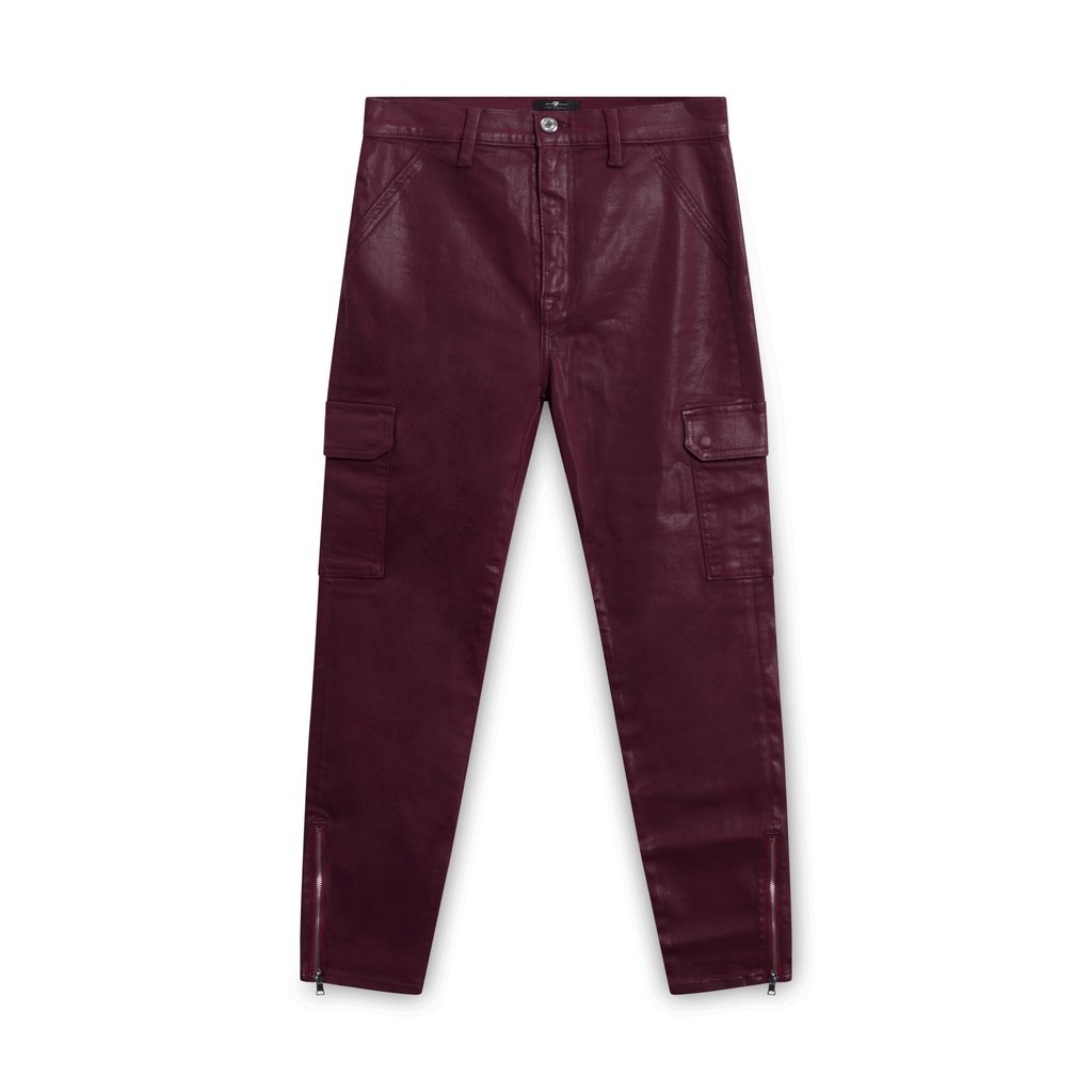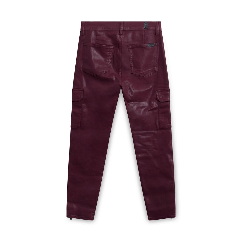 Burgundy colored jeans with a silver button enclosure and a hidden gold zipper. Both legs feature clasped functional pockets and ankle zippers. The backside of the jeans also feature two dual pockets.