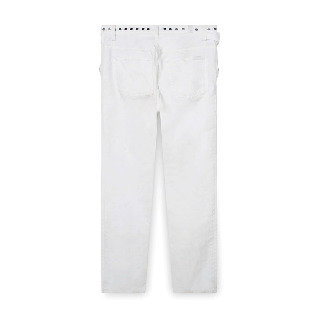 7 for All Mankind white jeans feature silver detailing, white belt, and silver zipper.